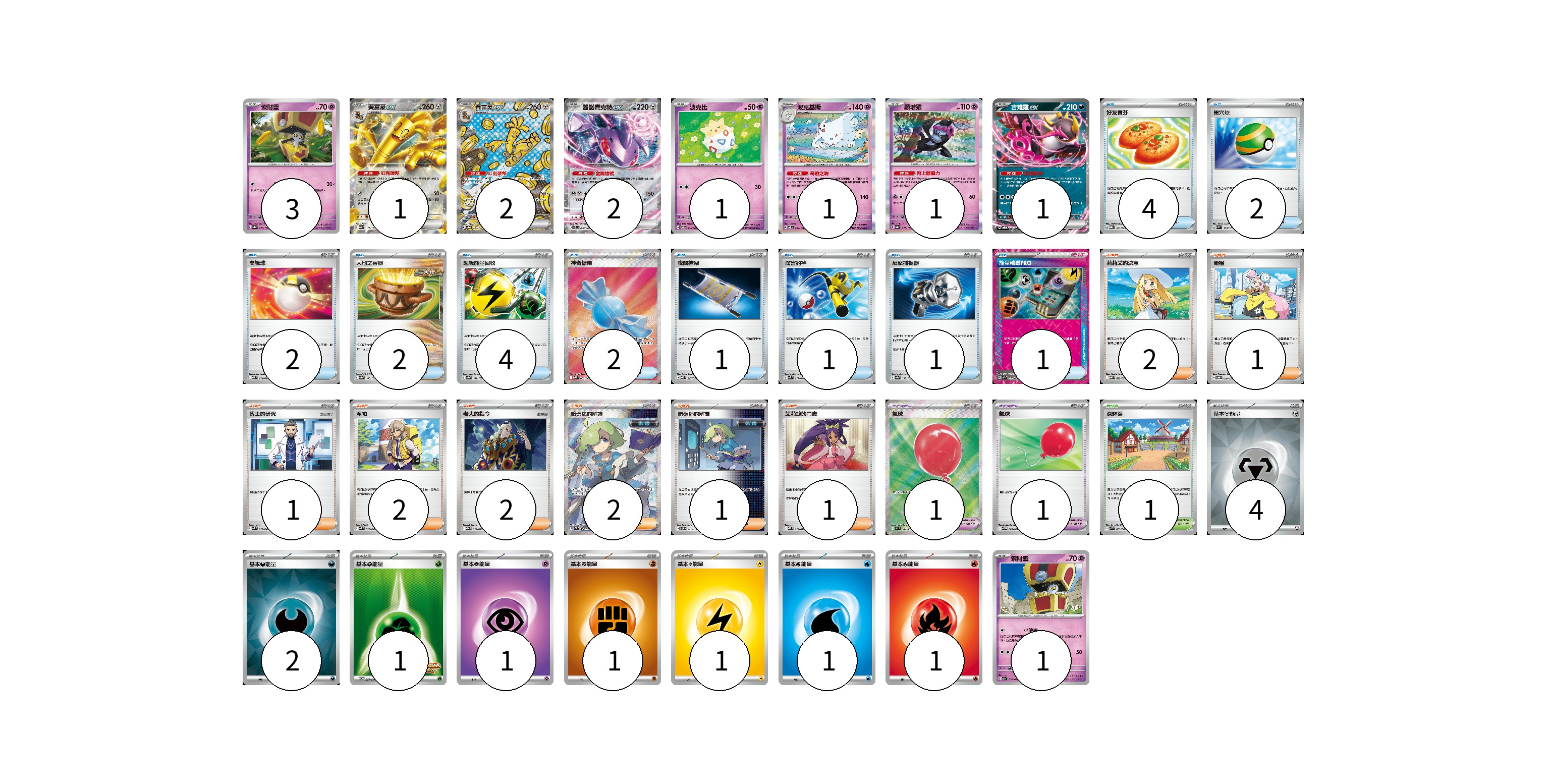 牌組構築方案 以此牌組為基礎新構築牌組 顯示卡面 顯示列表 寶可夢卡(13) 3 1 2 2 1 1 1 1 1 寶可夢道具(2) 1 1 物品卡(20) 4 2 2 2 4 2 1 1 1 1 支援者卡(12) 2 1 1 2 2 2 1 1 競技場卡(1) 1 能量卡(12) 4 2 1 1 1 1 1 1 寶可夢卡(13) 卡牌名稱 張數 卡牌名稱 張數 索財靈 SV8a 073/187 03 賽富豪ex SV8a 117/187 01 賽富豪ex SV8a 220/187 02 蓋諾賽克特ex SV11B 069/086 02 波克比 SV8 045/106 01 波克基斯 SV8 047/106 01 願增猿 SV8a 075/187 01 吉雉雞ex SVOD 004/020 01 索財靈 SV7a 024/064 01 寶可夢道具(2) 卡牌名稱 張數 卡牌名稱 張數 氣球 M1L 084/063 01 氣球 SV11B 082/086 01 物品卡(20) 卡牌名稱 張數 卡牌名稱 張數 好友寶芬 MBG 011/022 04 巢穴球 SVM 133/175 02 高級球 MBD 014/022 02 大地之容器 SV8a 143/187 02 超級能量回收 SV8a 141/187 04 神奇糖果 M1S 082/063 02 夜間擔架 MBG 017/022 01 厲害釣竿 SVK 011/042 01 反擊捕捉器 SV8a 139/187 01 能量輸送PRO SV7a 052/064 01 支援者卡(12) 卡牌名稱 張數 卡牌名稱 張數 莉莉艾的決意 MBG 022/022 02 奇樹 SVOD 016/020 01 博士的研究 SVK 033/042 01 派帕 SVK 035/042 02 老大的指令 MBG 021/022 02 暗碼迷的解讀 SV5M 090/071 02 暗碼迷的解讀 SV5M 067/071 01 艾莉絲的鬥志 MBD 019/022 01 競技場卡(1) 卡牌名稱 張數 卡牌名稱 張數 深缽鎮 SVK 039/042 01 能量卡(12) 卡牌名稱 張數 卡牌名稱 張數 基本【鋼】能量 SVOD MET 04 基本【惡】能量 SVOM DAR 02 基本【草】能量 SV-P 257/SV-P 01 基本【超】能量 SVAW PSY 01 基本【鬥】能量 SVAM FIG 01 基本【雷】能量 SVAL LIG 01 基本【水】能量 SVAW WAT 01 基本【火】能量 SVAL FIR 01 以此牌組為基礎新構築牌組 牌組編碼 mChLOe-hwGMhB-CFYagc copy 列印牌組單 牌組編碼已複製 分享至SNS