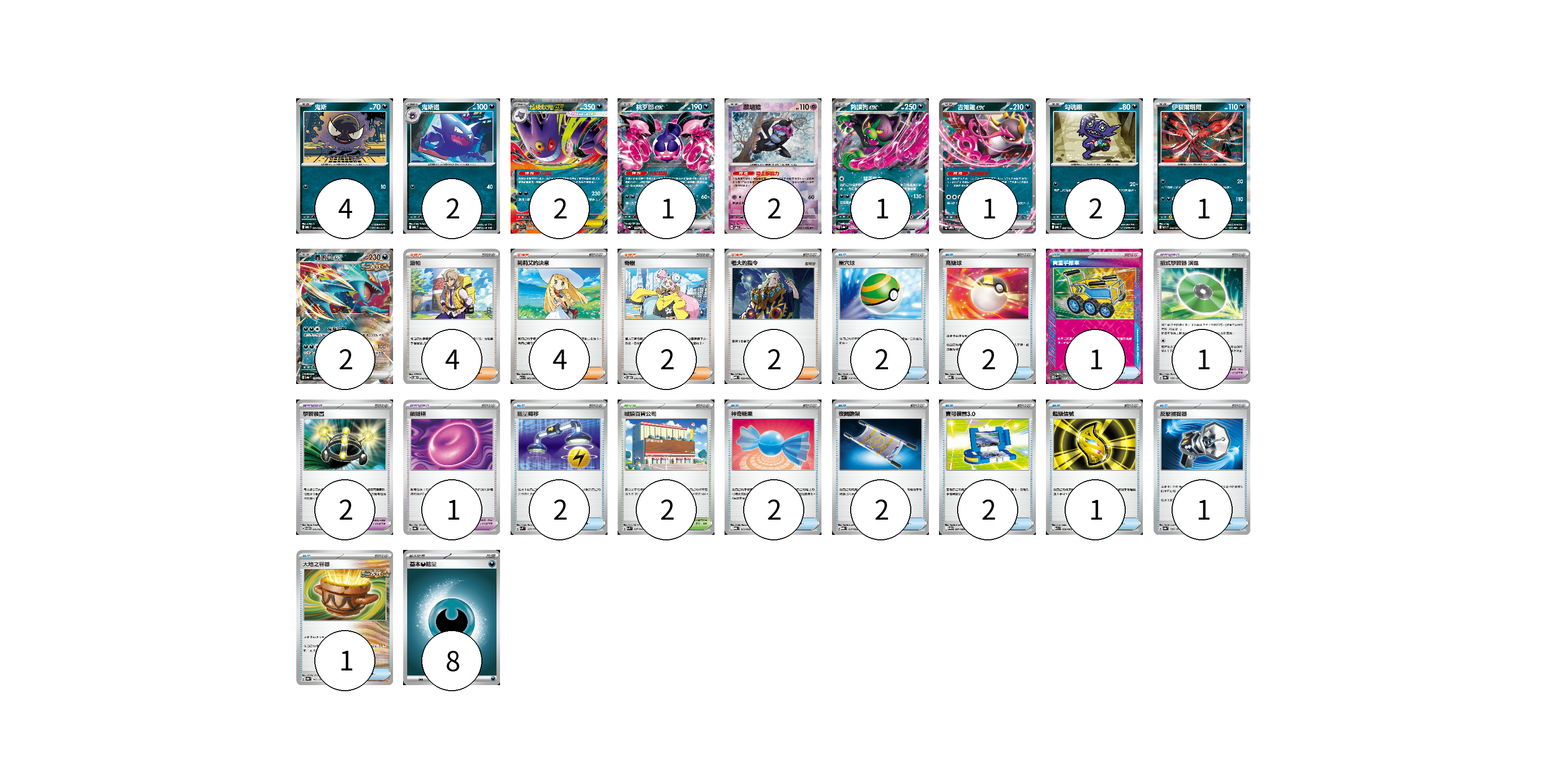 牌組構築方案 以此牌組為基礎新構築牌組 顯示卡面 顯示列表 寶可夢卡(18) 4 2 2 1 2 1 1 2 1 2 寶可夢道具(4) 1 2 1 物品卡(16) 2 2 1 2 2 2 2 1 1 1 支援者卡(12) 4 4 2 2 競技場卡(2) 2 能量卡(8) 8 寶可夢卡(18) 卡牌名稱 張數 卡牌名稱 張數 鬼斯 MBG 001/022 04 鬼斯通 MBG 002/022 02 超級耿鬼ex MBG 003/022 02 桃歹郎ex SV8a 105/187 01 願增猿 SV8a 075/187 02 夠讚狗ex SV8a 102/187 01 吉雉雞ex SVOD 004/020 01 勾魂眼 MBG 006/022 02 伊裴爾塔爾 M1L 040/063 01 轟鳴月ex SV8a 101/187 02 寶可夢道具(4) 卡牌名稱 張數 卡牌名稱 張數 招式學習器 演進 SV8a 160/187 01 學習裝置 SVTM 016/022 02 鎖鏈糬 SV8a 154/187 01 物品卡(16) 卡牌名稱 張數 卡牌名稱 張數 巢穴球 SVK 016/042 02 高級球 MBD 014/022 02 貴重手推車 SVK 020/042 01 能量轉移 SVM 127/175 02 神奇糖果 MBG 013/022 02 夜間擔架 MBG 017/022 02 寶可裝置3.0 SV11B 081/086 02 超級信號 M1S 058/063 01 反擊捕捉器 SV8a 139/187 01 大地之容器 SV8a 143/187 01 支援者卡(12) 卡牌名稱 張數 卡牌名稱 張數 派帕 SVOD 018/020 04 莉莉艾的決意 M1L 062/063 04 奇樹 SVOD 016/020 02 老大的指令 MBD 020/022 02 競技場卡(2) 卡牌名稱 張數 卡牌名稱 張數 城鎮百貨公司 SVK 037/042 02 能量卡(8) 卡牌名稱 張數 卡牌名稱 張數 基本【惡】能量 MBG DAR 08 以此牌組為基礎新構築牌組 牌組編碼 mDbLQX-FYytps-uxrDiU copy 列印牌組單 牌組編碼已複製 分享至SNS