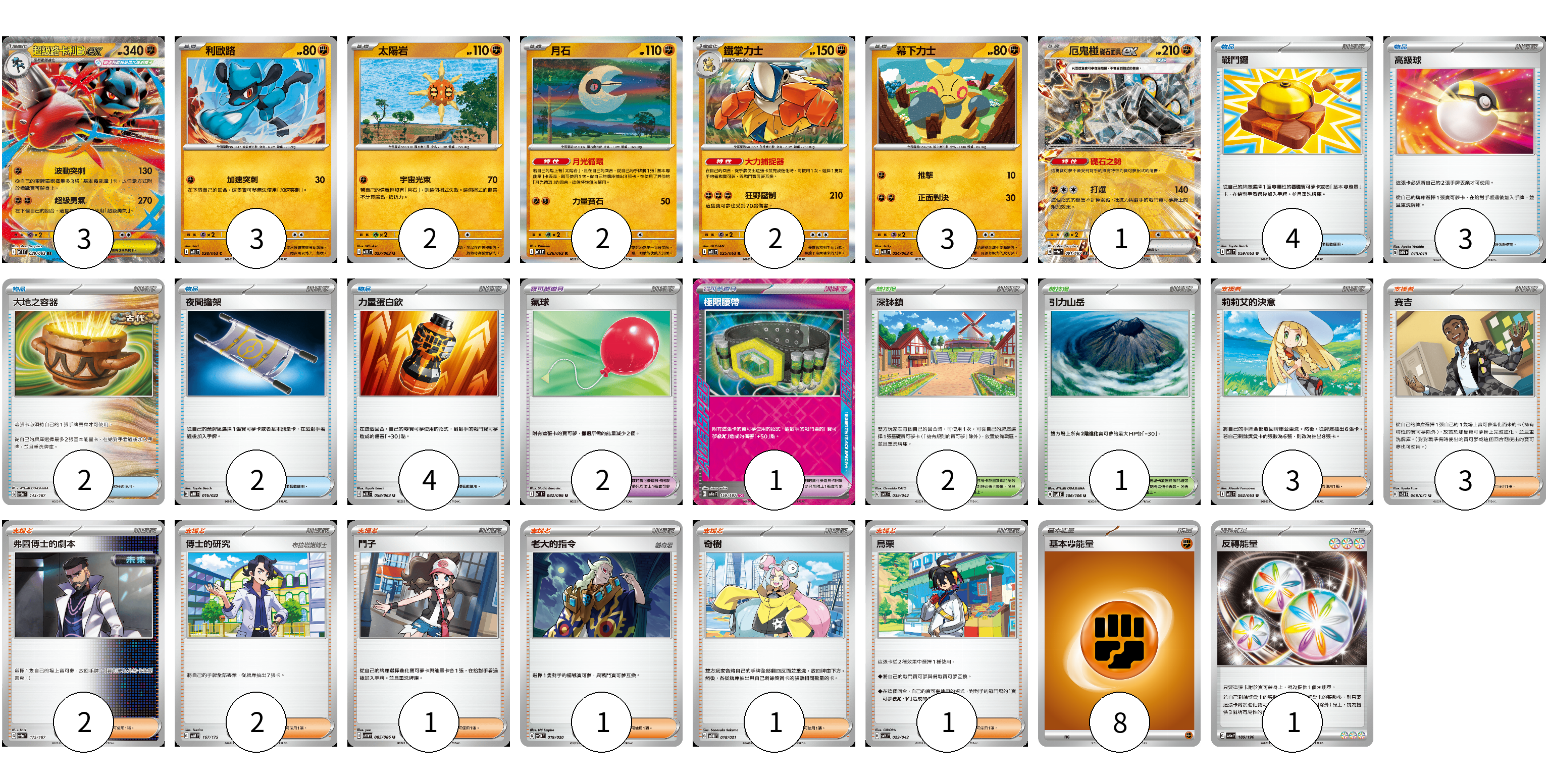 牌組構築方案 以此牌組為基礎新構築牌組 顯示卡面 顯示列表 寶可夢卡(16) 3 3 2 2 2 3 1 寶可夢道具(3) 2 1 物品卡(15) 4 3 2 2 4 支援者卡(14) 3 3 2 2 1 1 1 1 競技場卡(3) 2 1 能量卡(9) 8 1 寶可夢卡(16) 卡牌名稱 張數 卡牌名稱 張數 超級路卡利歐ex M1L 029/063 03 利歐路 M1L 028/063 03 太陽岩 M1L 027/063 02 月石 M1L 026/063 02 鐵掌力士 M1L 025/063 02 幕下力士 M1L 024/063 03 厄鬼椪 礎石面具ex SV8a 091/187 01 寶可夢道具(3) 卡牌名稱 張數 卡牌名稱 張數 氣球 SV11B 082/086 02 極限腰帶 SV8a 159/187 01 物品卡(15) 卡牌名稱 張數 卡牌名稱 張數 戰鬥鑼 M1L 059/063 04 高級球 SVTG 013/019 03 大地之容器 SV8a 143/187 02 夜間擔架 MBD 016/022 02 力量蛋白飲 M1L 058/063 04 支援者卡(14) 卡牌名稱 張數 卡牌名稱 張數 莉莉艾的決意 M1L 062/063 03 賽吉 SV5M 068/071 03 弗圖博士的劇本 SV8a 175/187 02 博士的研究 SVM 167/175 02 鬥子 SV11W 085/086 01 老大的指令 SVOD 019/020 01 奇樹 SVOM 018/021 01 烏栗 SVK 029/042 01 競技場卡(3) 卡牌名稱 張數 卡牌名稱 張數 深缽鎮 SVK 039/042 02 引力山岳 SV8 106/106 01 能量卡(9) 卡牌名稱 張數 卡牌名稱 張數 基本【鬥】能量 SVHK FIG 08 反轉能量 SV4a 189/190 01 以此牌組為基礎新構築牌組 牌組編碼 mEiXHb-uosovx-OcvCnG copy 列印牌組單 牌組編碼已複製 分享至SNS