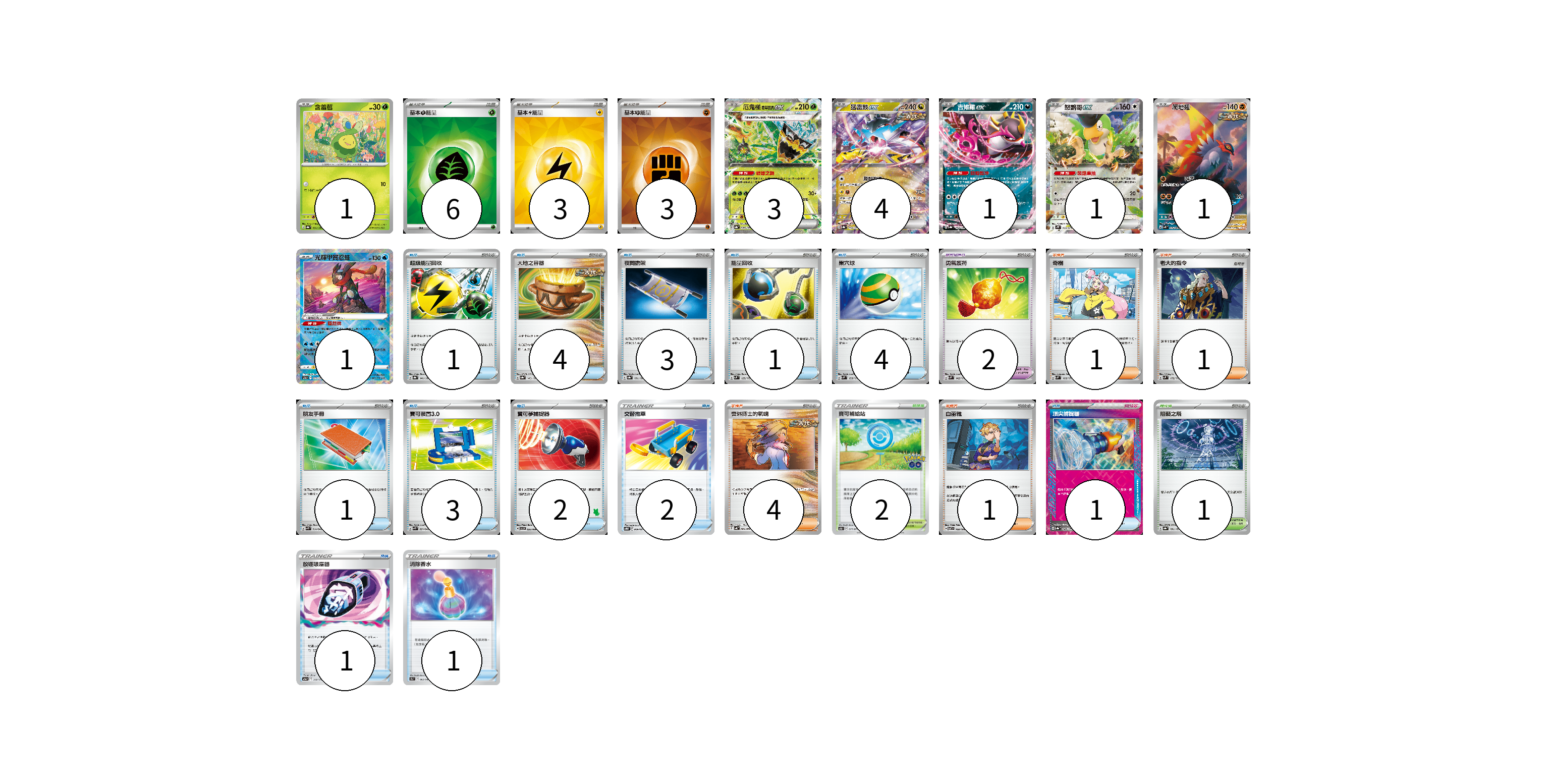 牌組構築方案 以此牌組為基礎新構築牌組 顯示卡面 顯示列表 寶可夢卡(12) 1 3 4 1 1 1 1 寶可夢道具(2) 2 物品卡(24) 1 4 3 1 4 1 3 2 2 1 1 1 支援者卡(7) 1 1 4 1 競技場卡(3) 2 1 能量卡(12) 6 3 3 寶可夢卡(12) 卡牌名稱 張數 卡牌名稱 張數 含羞苞 SV8a 001/187 01 厄鬼椪 碧草面具ex SV8a 020/187 03 猛雷鼓ex SV8a 124/187 04 吉雉雞ex SV8a 104/187 01 怒鸚哥ex SV2P 065/071 01 爬地翅 SV4K 074/066 01 光輝甲賀忍蛙 S12a 033/172 01 寶可夢道具(2) 卡牌名稱 張數 卡牌名稱 張數 勇氣護符 SVM 142/175 02 物品卡(24) 卡牌名稱 張數 卡牌名稱 張數 超級能量回收 SV8a 141/187 01 大地之容器 SV8a 143/187 04 夜間擔架 SV8a 151/187 03 能量回收 SVM 125/175 01 巢穴球 SVM 133/175 04 朋友手冊 SVK 014/042 01 寶可裝置3.0 SVK 021/042 03 寶可夢捕捉器 SVI 055/066 02 交替推車 SVTR 009/021 02 頂尖捕捉器 SV8a 148/187 01 放逐吸塵器 S12a 144/172 01 消除香水 S9a 063/067 01 支援者卡(7) 卡牌名稱 張數 卡牌名稱 張數 奇樹 SVM 160/175 01 老大的指令 SVM 172/175 01 奧琳博士的氣魄 SV4K 064/066 04 白蕾雅 SV7 100/102 01 競技場卡(3) 卡牌名稱 張數 卡牌名稱 張數 寶可補給站 S10b 071/071 02 阻礙之塔 SV8a 181/187 01 能量卡(12) 卡牌名稱 張數 卡牌名稱 張數 基本【草】能量 SVK GRA 06 基本【雷】能量 SVK LIG 03 基本【鬥】能量 SVK FIG 03 以此牌組為基礎新構築牌組 牌組編碼 mGOFfI-ygatUQ-JVXNEK copy 列印牌組單 牌組編碼已複製 分享至SNS