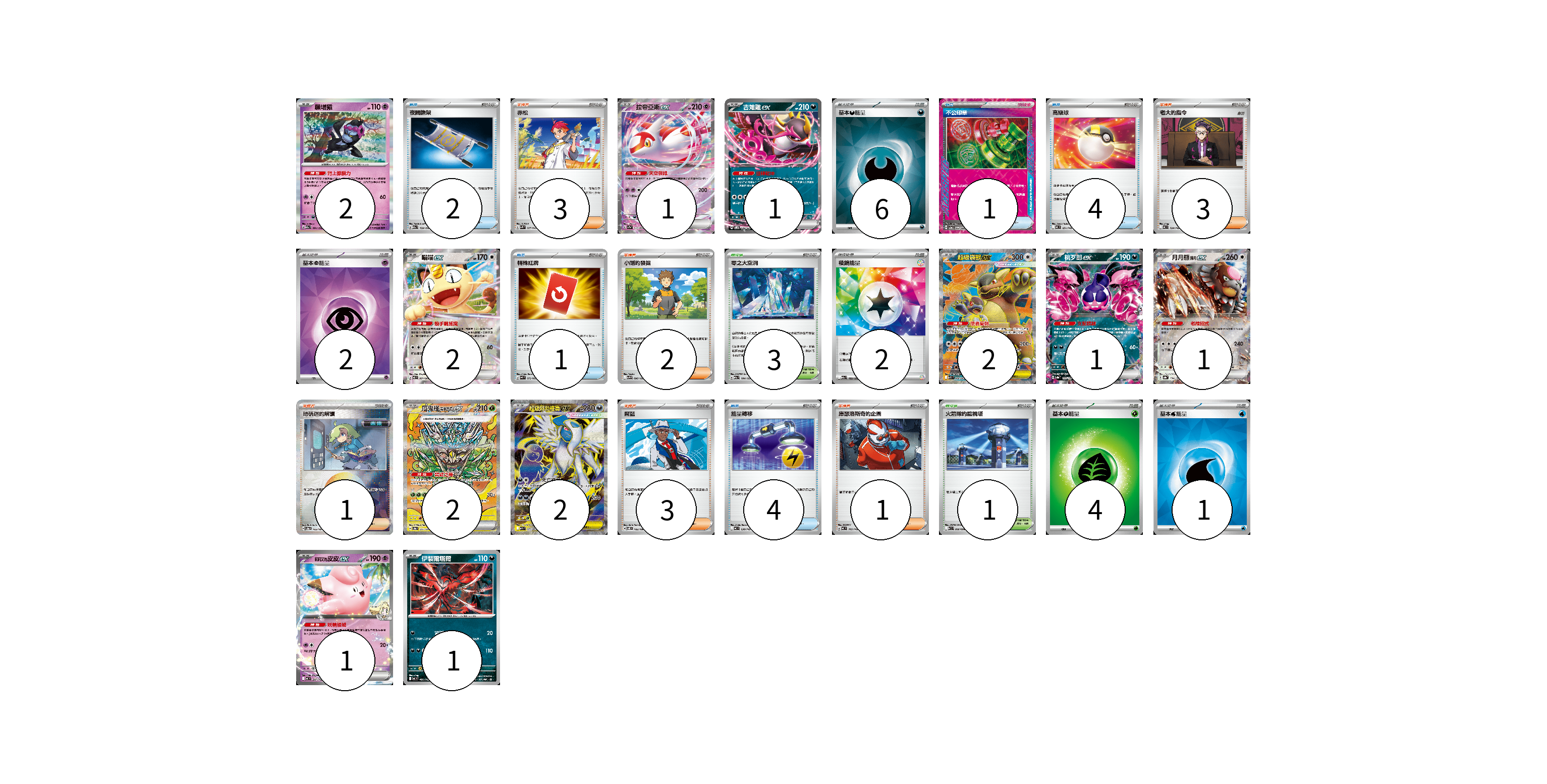 牌組構築方案 以此牌組為基礎新構築牌組 顯示卡面 顯示列表 寶可夢卡(16) 2 1 1 2 2 1 1 2 2 1 1 物品卡(12) 2 1 4 1 4 支援者卡(13) 3 3 2 1 3 1 競技場卡(4) 3 1 能量卡(15) 6 2 2 4 1 寶可夢卡(16) 卡牌名稱 張數 卡牌名稱 張數 願增猿 M2a 081/193 02 拉帝亞斯ex SV7a 019/064 01 吉雉雞ex SVOM 009/021 01 喵喵ex M3 061/080 02 超級袋獸ex M1S 080/063 02 桃歹郎ex SV8a 105/187 01 月月熊 赫月ex SV8a 134/187 01 厄鬼椪 碧草面具ex SV8a 201/187 02 超級阿勃梭魯ex M1L 079/063 02 莉莉艾的皮皮ex MC 287/742 01 伊裴爾塔爾 MC 481/742 01 物品卡(12) 卡牌名稱 張數 卡牌名稱 張數 夜間擔架 M2a 159/193 02 不公印章 SV5a 053/066 01 高級球 MC 651/742 04 特殊紅牌 M4 072/083 01 能量轉移 MC 638/742 04 支援者卡(13) 卡牌名稱 張數 卡牌名稱 張數 赤松 SVK 027/042 03 老大的指令 MC 724/742 03 小剛的發掘 SV9 096/100 02 暗碼迷的解讀 SV8a 165/187 01 席藍 SV8 102/106 03 庫瑟洛斯奇的企圖 MC 705/742 01 競技場卡(4) 卡牌名稱 張數 卡牌名稱 張數 零之大空洞 M2a 184/193 03 火箭隊的監視塔 SV10 096/098 01 能量卡(15) 卡牌名稱 張數 卡牌名稱 張數 基本【惡】能量 SVOM DAR 06 基本【超】能量 SVOD PSY 02 稜鏡能量 M2a 192/193 02 基本【草】能量 MC GRA 04 基本【水】能量 SVM WAT 01 以此牌組為基礎新構築牌組 牌組編碼 mGdGIM-trLpzZ-dcNTYm copy 列印牌組單 牌組編碼已複製 分享至SNS