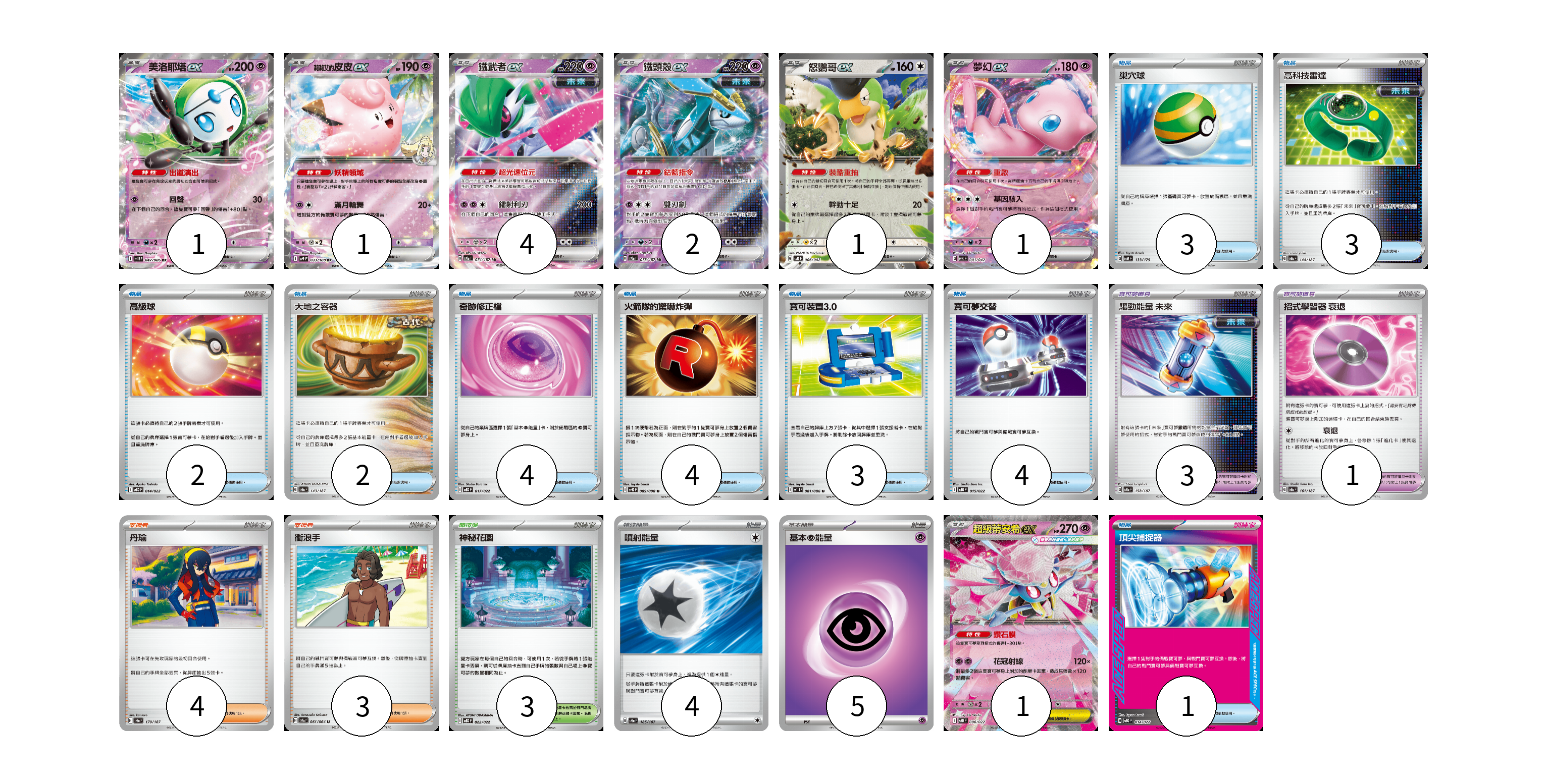 牌組構築方案 以此牌組為基礎新構築牌組 顯示卡面 顯示列表 寶可夢卡(11) 1 1 4 2 1 1 1 寶可夢道具(4) 3 1 物品卡(26) 3 3 2 2 4 4 3 4 1 支援者卡(7) 4 3 競技場卡(3) 3 能量卡(9) 4 5 寶可夢卡(11) 卡牌名稱 張數 卡牌名稱 張數 美洛耶塔ex SV11B 047/086 01 莉莉艾的皮皮ex SV9 033/100 01 鐵武者ex SV8a 074/187 04 鐵頭殼ex SV8a 078/187 02 怒鸚哥ex SVK 006/042 01 夢幻ex SVK 001/042 01 超級蒂安希ex MBD 006/022 01 寶可夢道具(4) 卡牌名稱 張數 卡牌名稱 張數 驅勁能量 未來 SV8a 158/187 03 招式學習器 衰退 SV8a 161/187 01 物品卡(26) 卡牌名稱 張數 卡牌名稱 張數 巢穴球 SVM 133/175 03 高科技雷達 SV8a 144/187 03 高級球 MBD 014/022 02 大地之容器 SV8a 143/187 02 奇跡修正檔 MBD 017/022 04 火箭隊的驚嚇炸彈 SV10 089/098 04 寶可裝置3.0 SV11B 081/086 03 寶可夢交替 MBG 015/022 04 頂尖捕捉器 MBG 014/022 01 支援者卡(7) 卡牌名稱 張數 卡牌名稱 張數 丹瑜 SV8a 170/187 04 衝浪手 SV7a 061/064 03 競技場卡(3) 卡牌名稱 張數 卡牌名稱 張數 神秘花園 MBD 022/022 03 能量卡(9) 卡牌名稱 張數 卡牌名稱 張數 噴射能量 SV8a 185/187 04 基本超能量 sv-p PSY 05 以此牌組為基礎新構築牌組 牌組編碼 mIbKqZ-yiCZJi-AodfBv copy 列印牌組單 牌組編碼已複製 分享至SNS