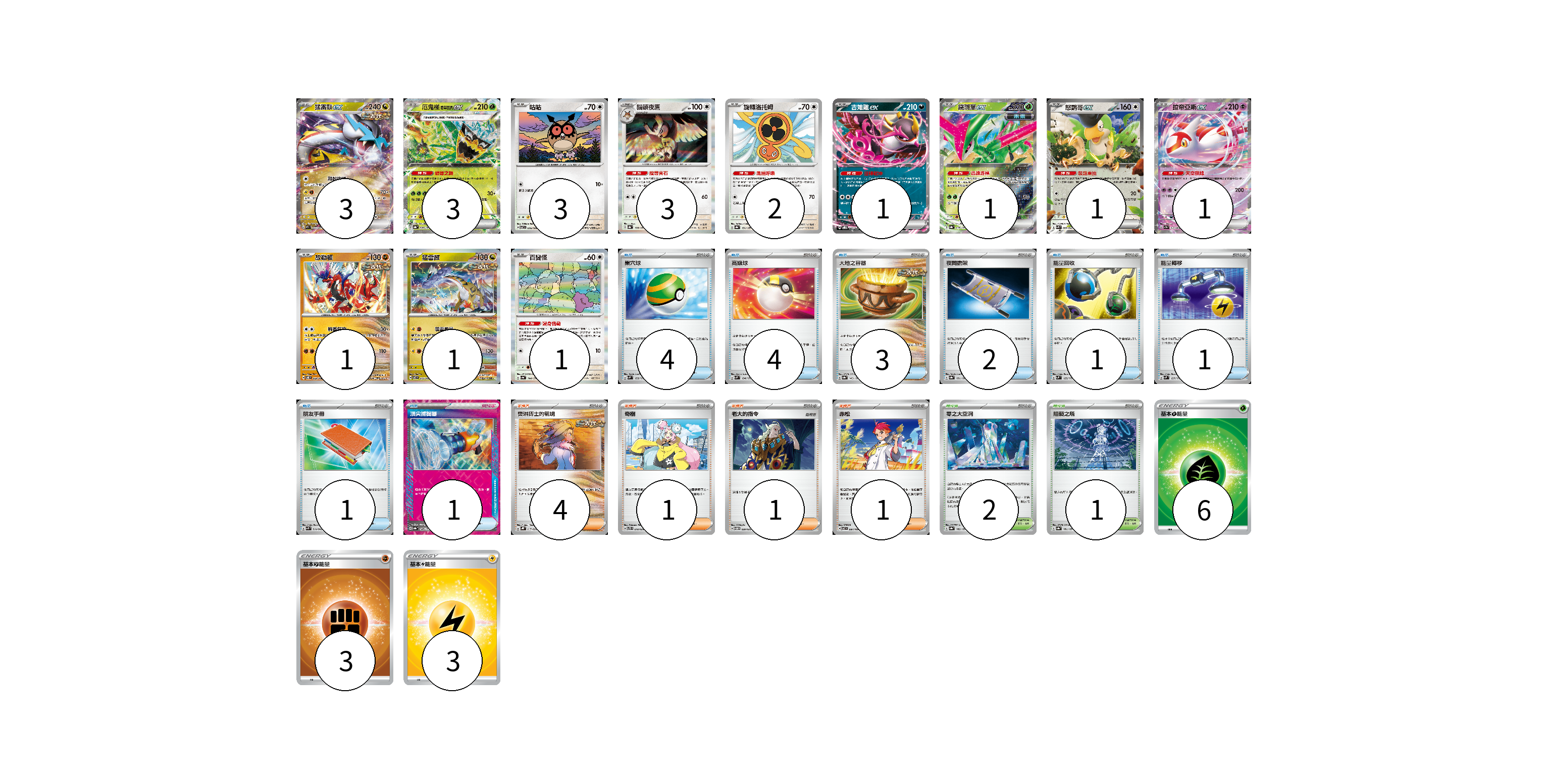 牌組構築方案 以此牌組為基礎新構築牌組 顯示卡面 顯示列表 寶可夢卡(21) 3 3 3 3 2 1 1 1 1 1 1 1 物品卡(17) 4 4 3 2 1 1 1 1 支援者卡(7) 4 1 1 1 競技場卡(3) 2 1 能量卡(12) 6 3 3 寶可夢卡(21) 卡牌名稱 張數 卡牌名稱 張數 猛雷鼓ex SV5K 053/071 03 厄鬼椪 碧草面具ex SV8a 020/187 03 咕咕 SV7 076/102 03 貓頭夜鷹 SV8a 128/187 03 旋轉洛托姆 SV8a 131/187 02 吉雉雞ex SVOD 004/020 01 鐵斑葉ex SV8a 016/187 01 怒鸚哥ex SVK 006/042 01 拉帝亞斯ex SV7a 019/064 01 故勒頓 SV8 069/106 01 猛雷鼓 SV7 075/102 01 百變怪 SV4a 144/190 01 物品卡(17) 卡牌名稱 張數 卡牌名稱 張數 巢穴球 SVM 133/175 04 高級球 SVM 134/175 04 大地之容器 SV8a 143/187 03 夜間擔架 SV8a 151/187 02 能量回收 SVM 125/175 01 能量轉移 SVM 127/175 01 朋友手冊 SVK 014/042 01 頂尖捕捉器 SV8a 148/187 01 支援者卡(7) 卡牌名稱 張數 卡牌名稱 張數 奧琳博士的氣魄 SVHK 017/022 04 奇樹 SVTS 018/022 01 老大的指令 SVTM 020/022 01 赤松 SV7 097/102 01 競技場卡(3) 卡牌名稱 張數 卡牌名稱 張數 零之大空洞 SV8a 182/187 02 阻礙之塔 SV8a 181/187 01 能量卡(12) 卡牌名稱 張數 卡牌名稱 張數 基本【草】能量 SI GRA 06 基本【鬥】能量 SI FIG 03 基本【雷】能量 SI LIG 03 以此牌組為基礎新構築牌組 牌組編碼 mKnoLX-KOcudx-vqemPV copy 列印牌組單 牌組編碼已複製 分享至SNS