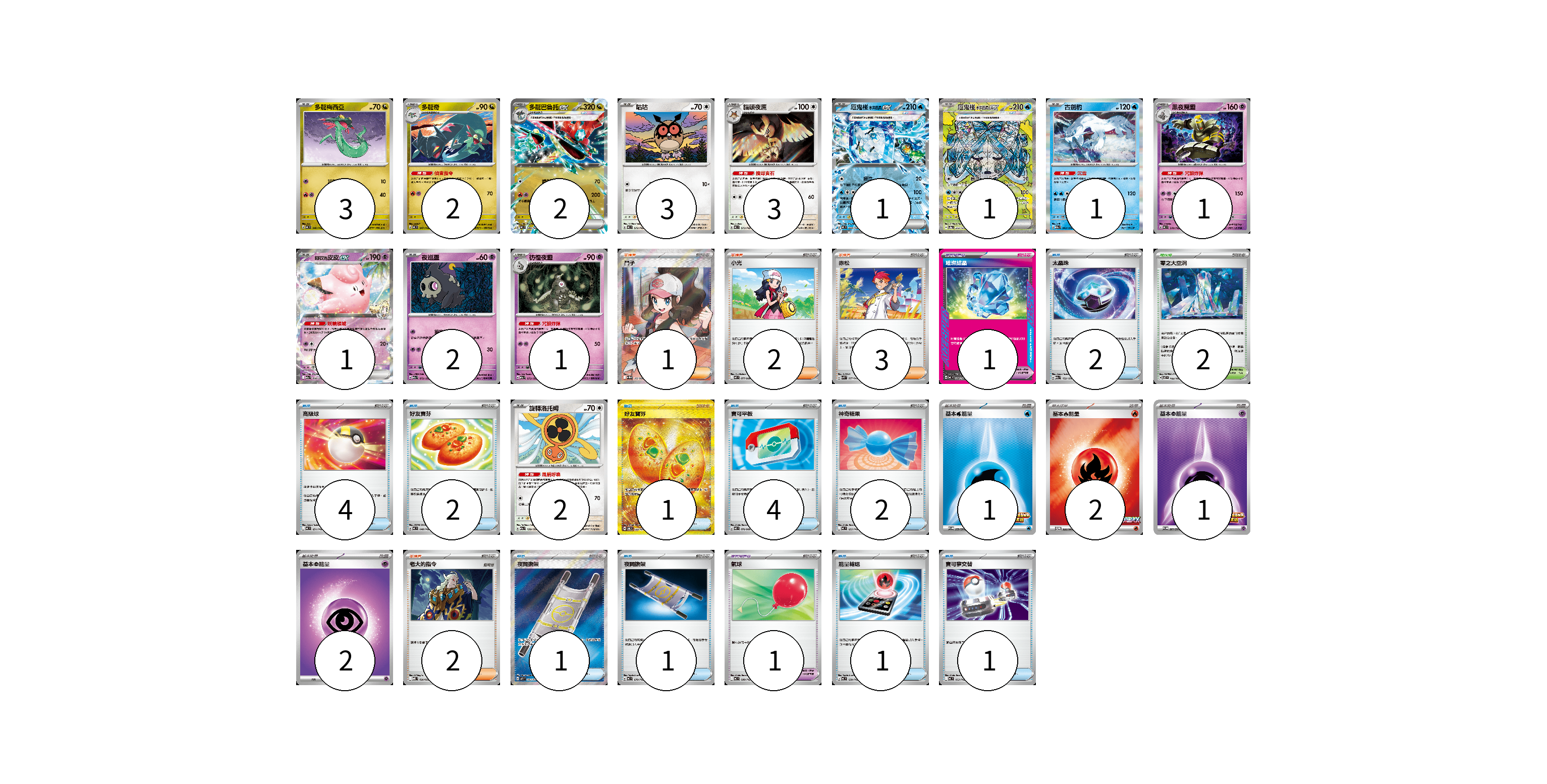 牌組構築方案 以此牌組為基礎新構築牌組 顯示卡面 顯示列表 寶可夢卡(23) 3 2 2 3 3 1 1 1 1 1 2 1 2 寶可夢道具(2) 1 1 物品卡(19) 2 4 2 1 4 2 1 1 1 1 支援者卡(8) 1 2 3 2 競技場卡(2) 2 能量卡(6) 1 2 1 2 寶可夢卡(23) 卡牌名稱 張數 卡牌名稱 張數 多龍梅西亞 MC 546/742 03 多龍奇 MC 547/742 02 多龍巴魯托ex MC 548/742 02 咕咕 MC 572/742 03 貓頭夜鷹 MC 573/742 03 厄鬼椪 水井面具ex MC 224/742 01 厄鬼椪 水井面具ex SV8a 208/187 01 古劍豹 M2a 043/193 01 黑夜魔靈 MC 310/742 01 莉莉艾的皮皮ex M2a 060/193 01 夜巡靈 M2a 072/193 02 彷徨夜靈 M2a 073/193 01 旋轉洛托姆 M2a 139/193 02 寶可夢道具(2) 卡牌名稱 張數 卡牌名稱 張數 璀璨結晶 MC 680/742 01 氣球 MC 688/742 01 物品卡(19) 卡牌名稱 張數 卡牌名稱 張數 太晶珠 M2a 152/193 02 高級球 MC 651/742 04 好友寶芬 MC 648/742 02 好友寶芬 SV6 133/101 01 寶可平板 M3 070/080 04 神奇糖果 MC 655/742 02 夜間擔架 M1L 083/063 01 夜間擔架 MC 670/742 01 能量輸送 MC 639/742 01 寶可夢交替 MC 663/742 01 支援者卡(8) 卡牌名稱 張數 卡牌名稱 張數 鬥子 SV11W 166/086 01 小光 M2 077/080 02 赤松 SVK 027/042 03 老大的指令 MBD 020/022 02 競技場卡(2) 卡牌名稱 張數 卡牌名稱 張數 零之大空洞 SV7 102/102 02 能量卡(6) 卡牌名稱 張數 卡牌名稱 張數 基本【水】能量 SV-P 259/SV-P 01 基本【火】能量 M-P 032/M-P 02 基本【超】能量 SV-P 261/SV-P 01 基本【超】能量 MC PSY 02 以此牌組為基礎新構築牌組 牌組編碼 mNNhRH-bHQjsX-swDXWF copy 列印牌組單 牌組編碼已複製 分享至SNS