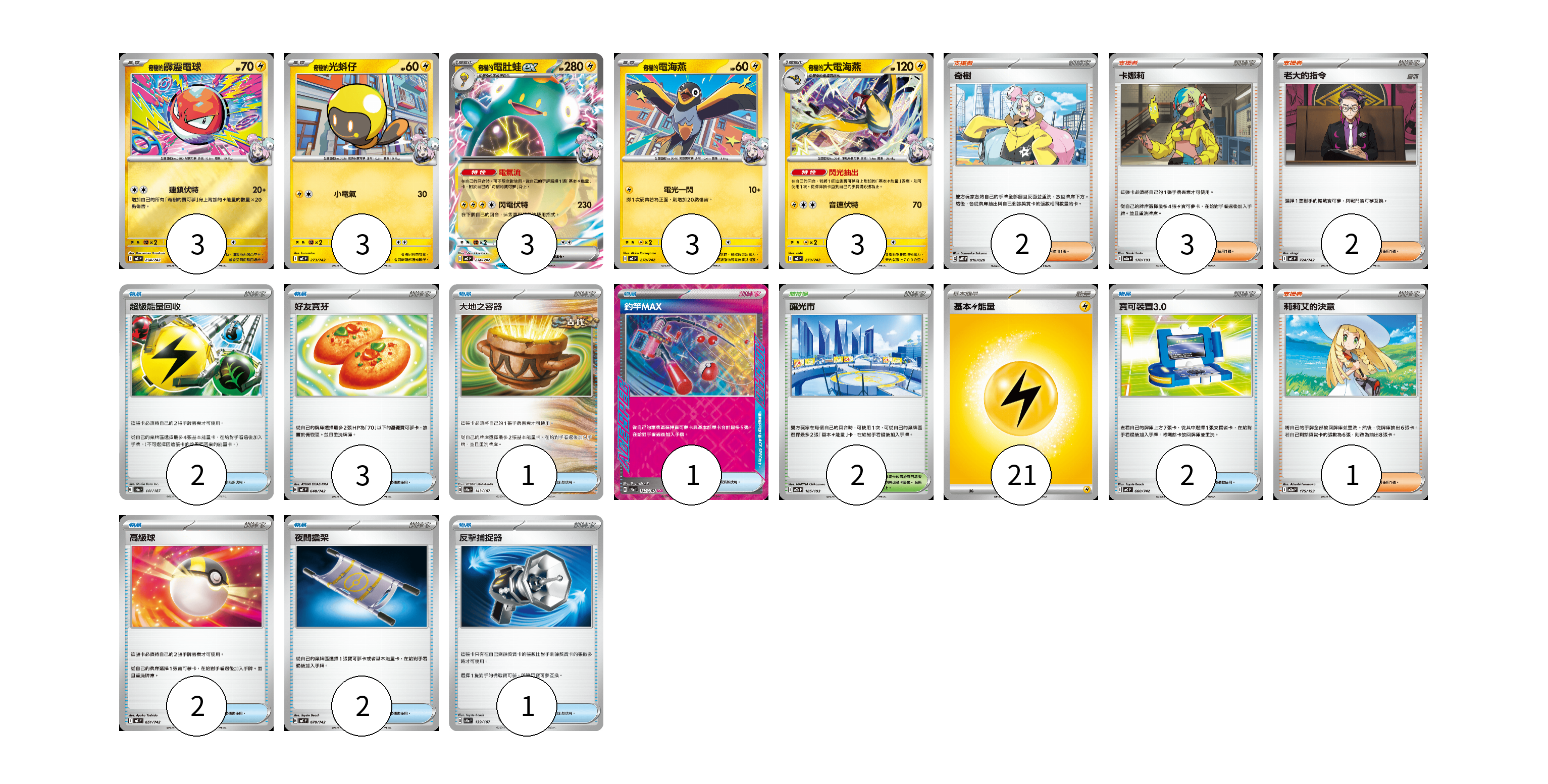 牌組構築方案 以此牌組為基礎新構築牌組 顯示卡面 顯示列表 寶可夢卡(15) 3 3 3 3 3 物品卡(14) 2 3 1 1 2 2 2 1 支援者卡(8) 2 3 2 1 競技場卡(2) 2 能量卡(21) 21 寶可夢卡(15) 卡牌名稱 張數 卡牌名稱 張數 奇樹的霹靂電球 MC 234/742 03 奇樹的光蚪仔 MC 273/742 03 奇樹的電肚蛙ex MC 274/742 03 奇樹的電海燕 MC 278/742 03 奇樹的大電海燕 MC 279/742 03 物品卡(14) 卡牌名稱 張數 卡牌名稱 張數 超級能量回收 SV8a 141/187 02 好友寶芬 MC 648/742 03 大地之容器 SV8a 143/187 01 釣竿MAX SV8a 142/187 01 寶可裝置3.0 MC 660/742 02 高級球 MC 651/742 02 夜間擔架 MC 670/742 02 反擊捕捉器 SV8a 139/187 01 支援者卡(8) 卡牌名稱 張數 卡牌名稱 張數 奇樹 SVOD 016/020 02 卡娜莉 M2a 170/193 03 老大的指令 MC 724/742 02 莉莉艾的決意 M2a 175/193 01 競技場卡(2) 卡牌名稱 張數 卡牌名稱 張數 釀光市 M2a 185/193 02 能量卡(21) 卡牌名稱 張數 卡牌名稱 張數 基本【雷】能量 MC LIG 21 以此牌組為基礎新構築牌組 牌組編碼 mQmbBA-DOfgLi-dPhswH copy 列印牌組單 牌組編碼已複製 分享至SNS