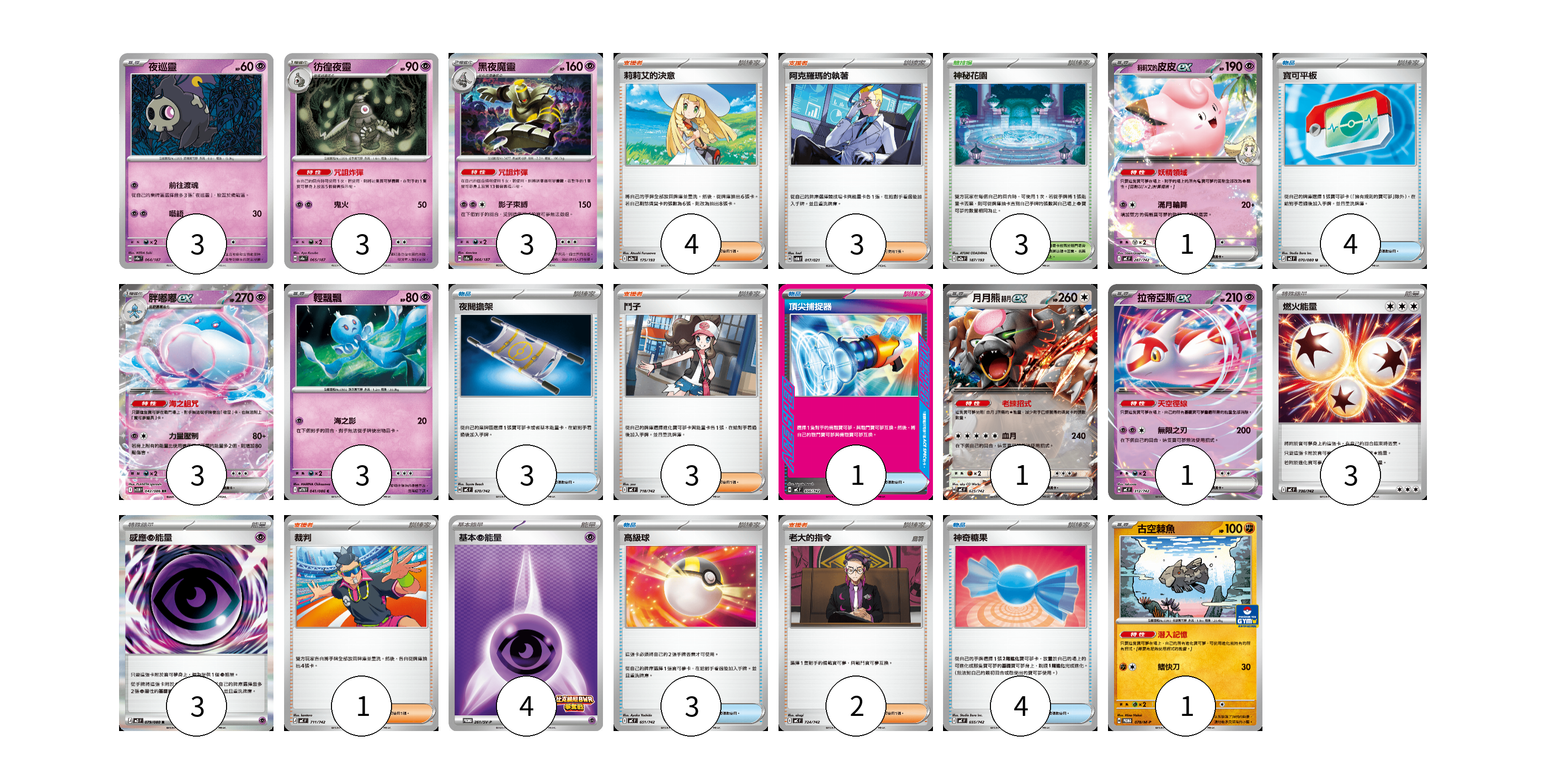 牌組構築方案 以此牌組為基礎新構築牌組 顯示卡面 顯示列表 寶可夢卡(19) 3 3 3 1 3 3 1 1 1 物品卡(15) 4 3 1 3 4 支援者卡(13) 4 3 3 1 2 競技場卡(3) 3 能量卡(10) 3 3 4 寶可夢卡(19) 卡牌名稱 張數 卡牌名稱 張數 夜巡靈 SV8a 064/187 03 彷徨夜靈 SV8a 065/187 03 黑夜魔靈 SV8a 066/187 03 莉莉艾的皮皮ex MC 287/742 01 胖嘟嘟ex SV11W 042/086 03 輕飄飄 SV11W 041/086 03 月月熊 赫月 ex MC 625/742 01 拉帝亞斯ex MC 312/742 01 古空棘魚 M-P 078/M-P 01 物品卡(15) 卡牌名稱 張數 卡牌名稱 張數 寶可平板 M3 070/080 04 夜間擔架 MC 670/742 03 頂尖捕捉器 MC 656/742 01 高級球 MC 651/742 03 神奇糖果 MC 655/742 04 支援者卡(13) 卡牌名稱 張數 卡牌名稱 張數 莉莉艾的決意 M2a 175/193 04 阿克羅瑪的執著 SVOM 017/021 03 鬥子 MC 718/742 03 裁判 MC 711/742 01 老大的指令 MC 724/742 02 競技場卡(3) 卡牌名稱 張數 卡牌名稱 張數 神秘花園 M2a 187/193 03 能量卡(10) 卡牌名稱 張數 卡牌名稱 張數 燃火能量 MC 736/742 03 感應【超】能量 M3 079/080 03 基本【超】能量 SV-P 261/SV-P 04 以此牌組為基礎新構築牌組 牌組編碼 mQsClF-fdNZoL-rSsDNq copy 列印牌組單 牌組編碼已複製 分享至SNS