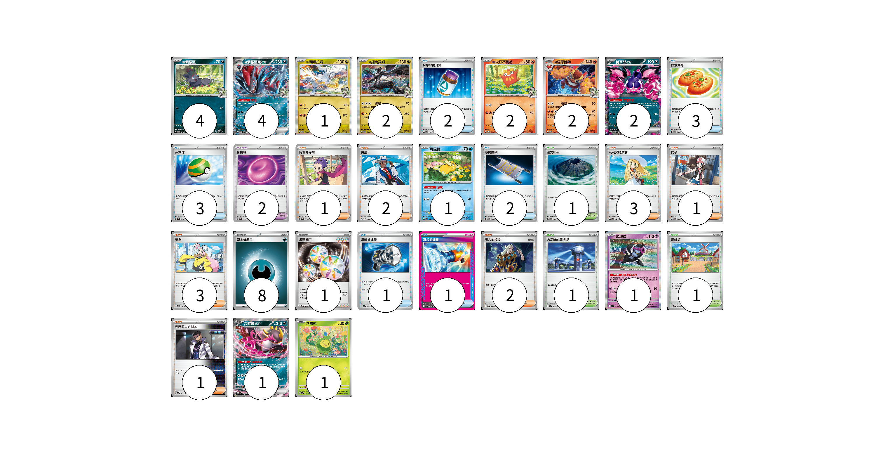 牌組構築方案 以此牌組為基礎新構築牌組 顯示卡面 顯示列表 寶可夢卡(21) 4 4 1 2 2 2 2 1 1 1 1 寶可夢道具(2) 2 物品卡(12) 2 3 3 2 1 1 支援者卡(13) 1 2 3 1 3 2 1 競技場卡(3) 1 1 1 能量卡(9) 8 1 寶可夢卡(21) 卡牌名稱 張數 卡牌名稱 張數 N的索羅亞 M2a 111/193 04 N的索羅亞克ex M2a 112/193 04 N的萊希拉姆 M2a 128/193 01 N的捷克羅姆 M2a 129/193 02 N的火紅不倒翁 SV9 015/100 02 N的達摩狒狒 SV9 016/100 02 桃歹郎ex MBG 009/022 02 可達鴨 M2a 032/193 01 願增猿 SV6 055/101 01 吉雉雞ex M2a 114/193 01 含羞苞 M2a 011/193 01 寶可夢道具(2) 卡牌名稱 張數 卡牌名稱 張數 鎖鏈糬 SV8a 154/187 02 物品卡(12) 卡牌名稱 張數 卡牌名稱 張數 N的PP提升劑 M2a 146/193 02 好友寶芬 M2a 153/193 03 巢穴球 SVM 133/175 03 夜間擔架 M2a 159/193 02 反擊捕捉器 SV8a 139/187 01 頂尖捕捉器 MBG 014/022 01 支援者卡(13) 卡牌名稱 張數 卡牌名稱 張數 阿杏的秘招 SV8a 166/187 01 席藍 SV8 102/106 02 莉莉艾的決意 M2a 175/193 03 鬥子 M2a 172/193 01 奇樹 SVOD 016/020 03 老大的指令 MBD 020/022 02 弗圖博士的劇本 SV8a 175/187 01 競技場卡(3) 卡牌名稱 張數 卡牌名稱 張數 引力山岳 M2a 183/193 01 火箭隊的監視塔 M2a 189/193 01 深缽鎮 SVK 039/042 01 能量卡(9) 卡牌名稱 張數 卡牌名稱 張數 基本【惡】能量 MBG DAR 08 反轉能量 SVK 041/042 01 以此牌組為基礎新構築牌組 牌組編碼 mSpdce-jmIvFE-uwvOLe copy 列印牌組單 牌組編碼已複製 分享至SNS