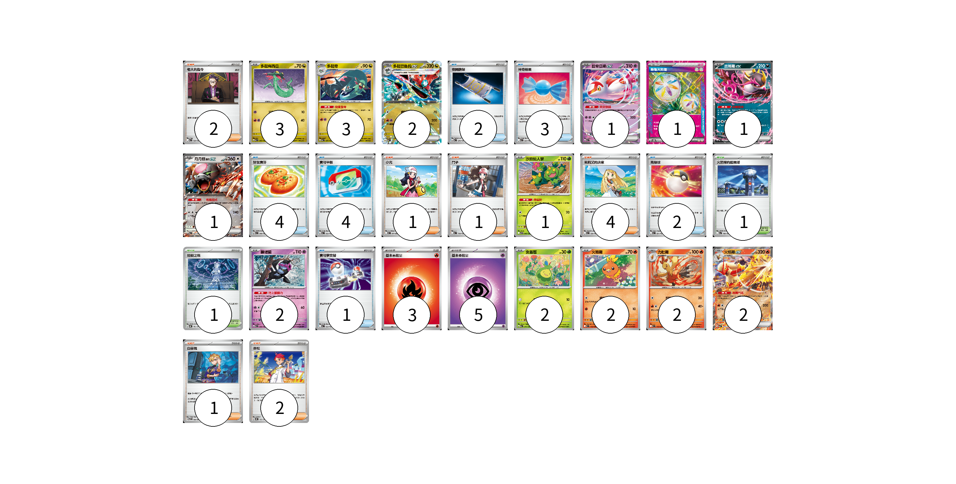 牌組構築方案 以此牌組為基礎新構築牌組 顯示卡面 顯示列表 寶可夢卡(22) 3 3 2 1 1 1 1 2 2 2 2 2 物品卡(16) 2 3 4 4 2 1 支援者卡(11) 2 1 1 4 1 2 競技場卡(2) 1 1 能量卡(9) 1 3 5 寶可夢卡(22) 卡牌名稱 張數 卡牌名稱 張數 多龍梅西亞 MC 546/742 03 多龍奇 MC 547/742 03 多龍巴魯托ex MC 548/742 02 拉帝亞斯ex MC 312/742 01 吉雉雞ex MC 489/742 01 月月熊 赫月 ex MC 625/742 01 沙鈴仙人掌 SV9 006/100 01 願增猿 MC 358/742 02 含羞苞 M2a 011/193 02 火稚雞 SV10 018/098 02 力壯雞 SV10 019/098 02 火焰雞ex SVM 016/175 02 物品卡(16) 卡牌名稱 張數 卡牌名稱 張數 夜間擔架 MC 670/742 02 神奇糖果 MC 655/742 03 好友寶芬 MC 648/742 04 寶可平板 MC 662/742 04 高級球 MC 651/742 02 寶可夢交替 MC 663/742 01 支援者卡(11) 卡牌名稱 張數 卡牌名稱 張數 老大的指令 MC 724/742 02 小光 M2 077/080 01 鬥子 MC 718/742 01 莉莉艾的決意 MC 729/742 04 白蕾雅 SV7 100/102 01 赤松 SV8a 163/187 02 競技場卡(2) 卡牌名稱 張數 卡牌名稱 張數 火箭隊的監視塔 M2a 189/193 01 阻礙之塔 SV8a 181/187 01 能量卡(9) 卡牌名稱 張數 卡牌名稱 張數 新衝天能量 SV5K 071/071 01 基本【火】能量 MC FIR 03 基本【超】能量 MC PSY 05 以此牌組為基礎新構築牌組 牌組編碼 mTKIyA-dtiIXo-hgSdDQ copy 列印牌組單 牌組編碼已複製 分享至SNS