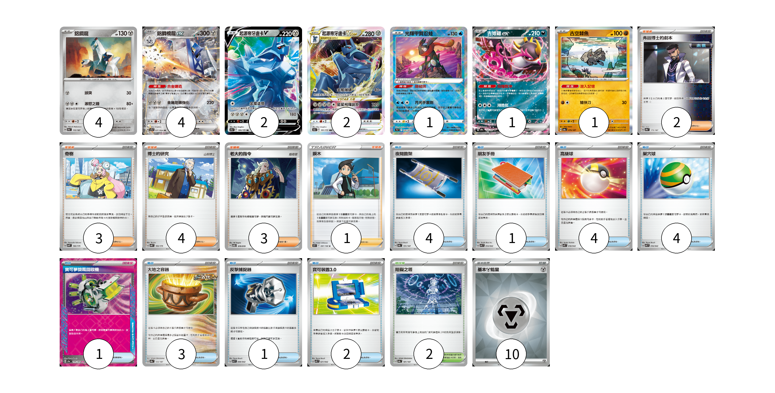 牌組構築方案 以此牌組為基礎新構築牌組 顯示卡面 顯示列表 寶可夢卡(15) 4 4 2 2 1 1 1 物品卡(20) 4 1 4 4 1 3 1 2 支援者卡(13) 2 3 4 3 1 競技場卡(2) 2 能量卡(10) 10 寶可夢卡(15) 卡牌名稱 張數 卡牌名稱 張數 鋁鋼龍 SV8a 112/187 04 鋁鋼橋龍ex SV7a 037/064 04 起源帝牙盧卡V S12a 100/172 02 起源帝牙盧卡VSTAR S12a 101/172 02 光輝甲賀忍蛙 S9a 026/067 01 吉雉雞ex SV8a 104/187 01 古空棘魚 SV8a 079/187 01 物品卡(20) 卡牌名稱 張數 卡牌名稱 張數 夜間擔架 SV8a 151/187 04 朋友手冊 SVK 014/042 01 高級球 SVK 018/042 04 巢穴球 SVK 016/042 04 寶可夢旋風回收機 SV8a 149/187 01 大地之容器 SV8a 143/187 03 反擊捕捉器 SVK 009/042 01 寶可裝置3.0 SVK 021/042 02 支援者卡(13) 卡牌名稱 張數 卡牌名稱 張數 弗圖博士的劇本 SV8a 175/187 02 奇樹 SVM 160/175 03 博士的研究 SVM 165/175 04 老大的指令 SVTG 019/019 03 捩木 S11 097/100 01 競技場卡(2) 卡牌名稱 張數 卡牌名稱 張數 阻礙之塔 SV8a 181/187 02 能量卡(10) 卡牌名稱 張數 卡牌名稱 張數 基本【鋼】能量 SVK MET 10 以此牌組為基礎新構築牌組 牌組編碼 mTKtQM-llABwV-SbMuFJ copy 列印牌組單 牌組編碼已複製 分享至SNS