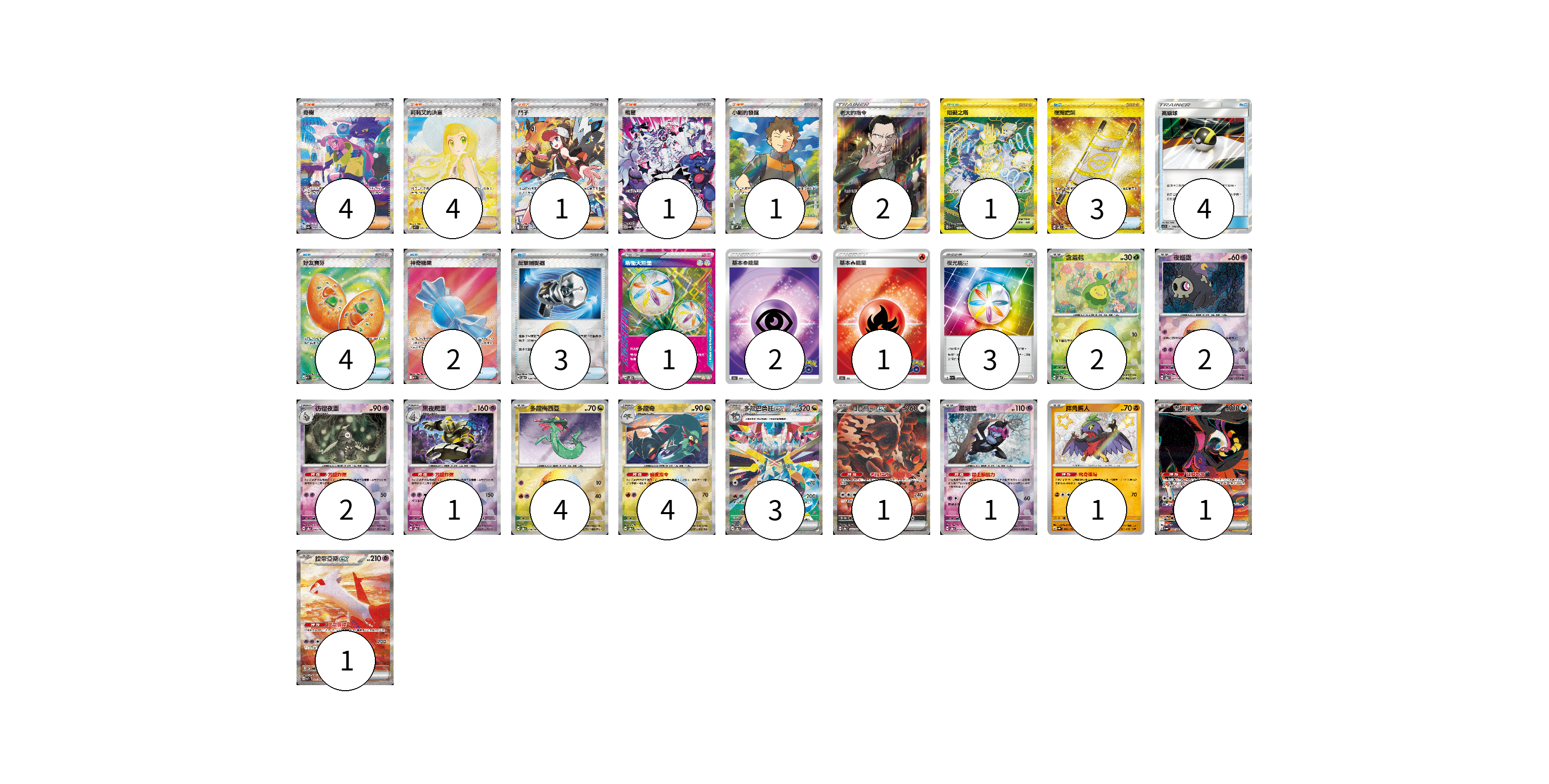 牌組構築方案 以此牌組為基礎新構築牌組 顯示卡面 顯示列表 寶可夢卡(23) 2 2 2 1 4 4 3 1 1 1 1 1 物品卡(16) 3 4 4 2 3 支援者卡(13) 4 4 1 1 1 2 競技場卡(1) 1 能量卡(7) 1 2 1 3 寶可夢卡(23) 卡牌名稱 張數 卡牌名稱 張數 含羞苞 SV8a 001/187 02 夜巡靈 SV8a 064/187 02 彷徨夜靈 SV8a 065/187 02 黑夜魔靈 SV8a 066/187 01 多龍梅西亞 SV8a 118/187 04 多龍奇 SV8a 119/187 04 多龍巴魯托ex SV8a 221/187 03 月月熊 赫月ex SV8a 225/187 01 願增猿 SV8a 075/187 01 摔角鷹人 SV4a 282/190 01 吉雉雞ex SV6a 089/064 01 拉帝亞斯ex SV7a 087/064 01 物品卡(16) 卡牌名稱 張數 卡牌名稱 張數 夜間擔架 SV8 137/106 03 高級球 AS5b 178/186 04 好友寶芬 M1S 081/063 04 神奇糖果 M1S 082/063 02 反擊捕捉器 SV8a 139/187 03 支援者卡(13) 卡牌名稱 張數 卡牌名稱 張數 奇樹 SV4a 350/190 04 莉莉艾的決意 M1L 091/063 04 鬥子 SV11W 173/086 01 枇琶 SV5K 096/071 01 小剛的發掘 SV9 123/100 01 老大的指令(坂木) SC1b 170/153 02 競技場卡(1) 卡牌名稱 張數 卡牌名稱 張數 阻礙之塔 SV10 132/098 01 能量卡(7) 卡牌名稱 張數 卡牌名稱 張數 新衝天能量 SV5K 071/071 01 基本超能量 S10b PSY 02 基本火能量 S10b FIR 01 夜光能量 SV1a 073/073 03 以此牌組為基礎新構築牌組 牌組編碼 mWdzEK-PzALry-oaCxAF copy 列印牌組單 牌組編碼已複製 分享至SNS