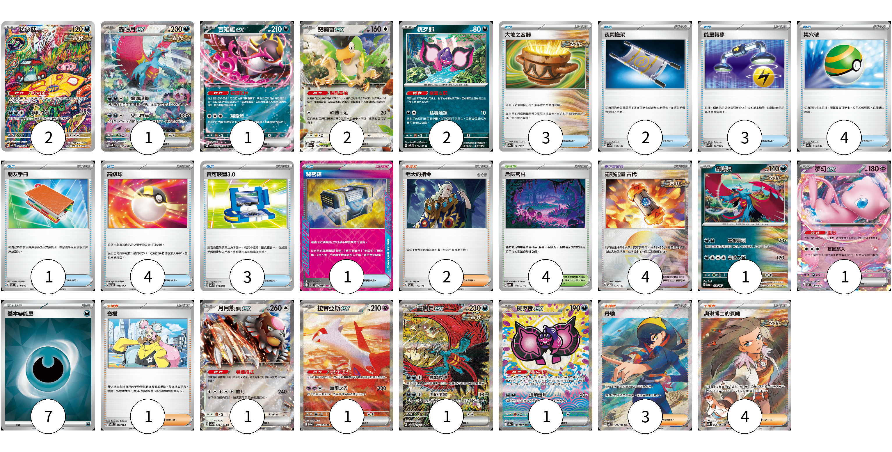 牌組構築方案 以此牌組為基礎新構築牌組 顯示卡面 顯示列表 寶可夢卡(14) 2 1 1 2 2 1 1 1 1 1 1 寶可夢道具(4) 4 物品卡(21) 3 2 3 4 1 4 3 1 支援者卡(10) 2 1 3 4 競技場卡(4) 4 能量卡(7) 7 寶可夢卡(14) 卡牌名稱 張數 卡牌名稱 張數 猛惡菇 SV4K 077/066 02 轟鳴月ex SV4K 090/066 01 吉雉雞ex SV6a 038/064 01 怒鸚哥ex SV4a 154/190 02 桃歹郎 SV8 075/106 02 轟鳴月 SV8a 100/187 01 夢幻ex SVK 001/042 01 月月熊 赫月ex SV8a 134/187 01 拉帝亞斯ex SV7a 087/064 01 轟鳴月ex SV8a 218/187 01 桃歹郎ex SV8a 219/187 01 寶可夢道具(4) 卡牌名稱 張數 卡牌名稱 張數 驅勁能量 古代 SV8a 157/187 04 物品卡(21) 卡牌名稱 張數 卡牌名稱 張數 大地之容器 SV8a 143/187 03 夜間擔架 SV8a 151/187 02 能量轉移 SVM 127/175 03 巢穴球 SVK 016/042 04 朋友手冊 SVK 014/042 01 高級球 SVK 018/042 04 寶可裝置3.0 SVTL 014/021 03 秘密箱 SV6 092/101 01 支援者卡(10) 卡牌名稱 張數 卡牌名稱 張數 老大的指令 SVM 172/175 02 奇樹 SVOD 016/020 01 丹瑜 SV6 123/101 03 奧琳博士的氣魄 SV4K 085/066 04 競技場卡(4) 卡牌名稱 張數 卡牌名稱 張數 危險密林 SV5K 070/071 04 能量卡(7) 卡牌名稱 張數 卡牌名稱 張數 基本【惡】能量 SVOM DAR 07 以此牌組為基礎新構築牌組 牌組編碼 mXisUm-kUoDms-LRjzwQ copy 列印牌組單 牌組編碼已複製 分享至SNS