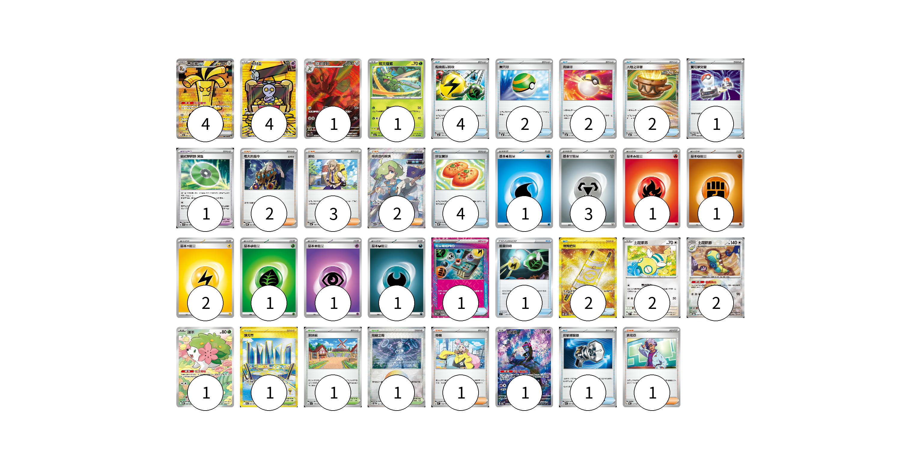 牌組構築方案 以此牌組為基礎新構築牌組 顯示卡面 顯示列表 寶可夢卡(16) 4 4 1 1 2 2 1 1 寶可夢道具(1) 1 物品卡(20) 4 2 2 2 1 4 1 1 2 1 支援者卡(9) 2 3 2 1 1 競技場卡(3) 1 1 1 能量卡(11) 1 3 1 1 2 1 1 1 寶可夢卡(16) 卡牌名稱 張數 卡牌名稱 張數 賽富豪ex SV3a 087/062 04 索財靈 SV3a 068/062 04 巨鉗螳螂 SV3 116/108 01 飛天螳螂 SV2a 123/165 01 土龍弟弟 SVM 095/175 02 土龍節節 SV8a 130/187 02 謝米 SV9a 066/063 01 願增猿 SV6 107/101 01 寶可夢道具(1) 卡牌名稱 張數 卡牌名稱 張數 招式學習器 演進 SV4M 063/066 01 物品卡(20) 卡牌名稱 張數 卡牌名稱 張數 超級能量回收 SV4a 157/190 04 巢穴球 SVHK 012/022 02 高級球 SVHK 013/022 02 大地之容器 SVHK 011/022 02 寶可夢交替 SV5a 056/066 01 好友寶芬 SV5K 063/071 04 能量輸送PRO SV7a 052/064 01 能量回收 SI 365/414 01 夜間擔架 SV8 137/106 02 反擊捕捉器 SVK 009/042 01 支援者卡(9) 卡牌名稱 張數 卡牌名稱 張數 老大的指令 SVHK 022/022 02 派帕 SV4a 180/190 03 暗碼迷的解讀 SV5M 090/071 02 奇樹 SVM 160/175 01 吉尼亞 SVAL 017/021 01 競技場卡(3) 卡牌名稱 張數 卡牌名稱 張數 釀光市 SV9a 092/063 01 深缽鎮 SV1a 070/073 01 阻礙之塔 SV8a 181/187 01 能量卡(11) 卡牌名稱 張數 卡牌名稱 張數 基本【水】能量 SVF WAT 01 基本【鋼】能量 SVF MET 03 基本火能量 sv-p FIR 01 基本鬥能量 sv-p FIG 01 基本雷能量 sv-p LIG 02 基本草能量 sv-p GRA 01 基本超能量 sv-p PSY 01 基本惡能量 sv-p DAR 01 以此牌組為基礎新構築牌組 牌組編碼 mZvqNX-QCSuLY-aoyiDq copy 列印牌組單 牌組編碼已複製 分享至SNS