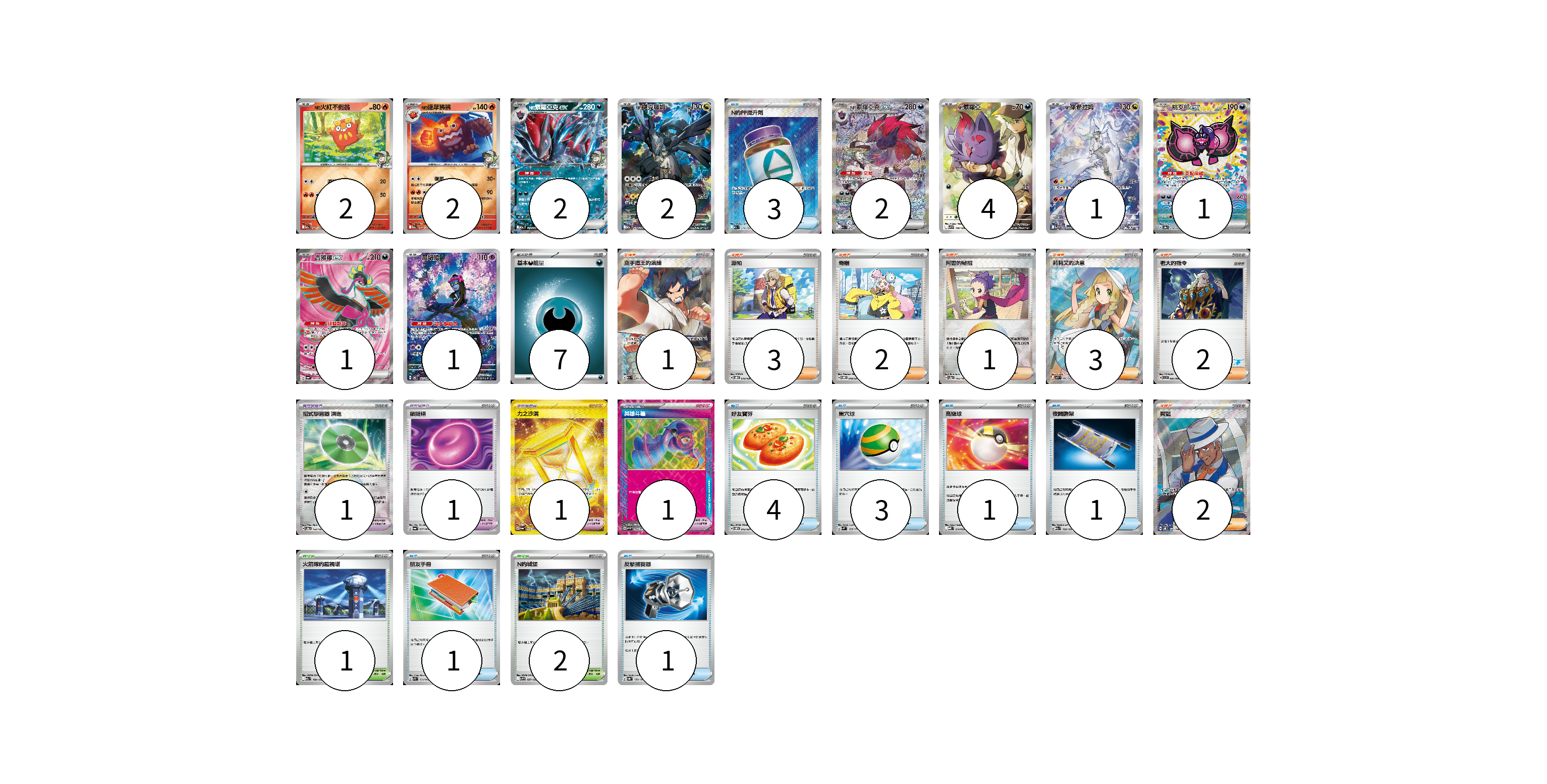 牌組構築方案 以此牌組為基礎新構築牌組 顯示卡面 顯示列表 寶可夢卡(18) 2 2 2 2 2 4 1 1 1 1 寶可夢道具(4) 1 1 1 1 物品卡(14) 3 4 3 1 1 1 1 支援者卡(14) 1 3 2 1 3 2 2 競技場卡(3) 1 2 能量卡(7) 7 寶可夢卡(18) 卡牌名稱 張數 卡牌名稱 張數 N的火紅不倒翁 M2a 027/193 02 N的達摩狒狒 M2a 028/193 02 N的索羅亞克ex M2a 112/193 02 N的捷克羅姆 M2a 210/193 02 N的索羅亞克ex M2a 242/193 02 N的索羅亞 SV9 108/100 04 N的萊希拉姆 SV9 109/100 01 桃歹郎ex SV8a 219/187 01 吉雉雞ex SV6a 081/064 01 願增猿 SV6 107/101 01 寶可夢道具(4) 卡牌名稱 張數 卡牌名稱 張數 招式學習器 演進 SV8a 160/187 01 鎖鏈糬 SV6a 057/064 01 力之沙漏 SV6a 094/064 01 英雄斗篷 SV5M 064/071 01 物品卡(14) 卡牌名稱 張數 卡牌名稱 張數 N的PP提升劑 M2a 214/193 03 好友寶芬 SVOM 012/021 04 巢穴球 SVM 133/175 03 高級球 MBD 014/022 01 夜間擔架 M2a 159/193 01 朋友手冊 SVK 014/042 01 反擊捕捉器 SV8a 139/187 01 支援者卡(14) 卡牌名稱 張數 卡牌名稱 張數 空手道王的演練 M2a 220/193 01 派帕 SVOD 018/020 03 奇樹 SVOM 018/021 02 阿杏的秘招 SV8a 166/187 01 莉莉艾的決意 M1L 086/063 03 老大的指令 SVI 066/066 02 席藍 SV8 127/106 02 競技場卡(3) 卡牌名稱 張數 卡牌名稱 張數 火箭隊的監視塔 M2a 189/193 01 N的城堡 SV9 097/100 02 能量卡(7) 卡牌名稱 張數 卡牌名稱 張數 基本【惡】能量 MBG DAR 07 以此牌組為基礎新構築牌組 牌組編碼 mgEUtf-nsosjn-rBgiQE copy 列印牌組單 牌組編碼已複製 分享至SNS