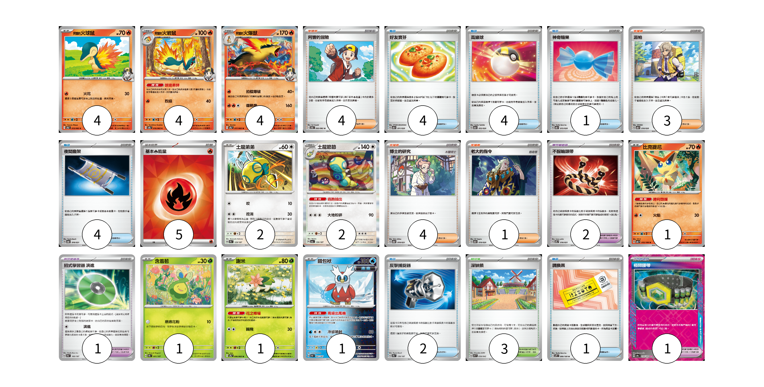 牌組構築方案 以此牌組為基礎新構築牌組 顯示卡面 顯示列表 寶可夢卡(20) 4 4 4 2 2 1 1 1 1 寶可夢道具(4) 2 1 1 物品卡(16) 4 4 1 4 2 1 支援者卡(12) 4 3 4 1 競技場卡(3) 3 能量卡(5) 5 寶可夢卡(20) 卡牌名稱 張數 卡牌名稱 張數 <阿響的>火球鼠 SV9a 015/063 04 <阿響的>火岩鼠 SV9a 016/063 04 <阿響的>火爆獸 SV9a 017/063 04 土龍弟弟 SV8a 129/187 02 土龍節節 SV8a 130/187 02 比克提尼 SV8 012/106 01 含羞苞 SV8a 001/187 01 謝米 SV9a 006/063 01 鐵包袱 SV8a 047/187 01 寶可夢道具(4) 卡牌名稱 張數 卡牌名稱 張數 不服輸頭帶 SVTL 016/021 02 招式學習器 演進 SV8a 160/187 01 極限腰帶 SV8a 159/187 01 物品卡(16) 卡牌名稱 張數 卡牌名稱 張數 好友寶芬 SVOD 011/020 04 高級球 SVOD 012/020 04 神奇糖果 SVOD 013/020 01 夜間擔架 SVOM 016/021 04 反擊捕捉器 SV8a 139/187 02 調換票 SV9 090/100 01 支援者卡(12) 卡牌名稱 張數 卡牌名稱 張數 阿響的冒險 SV9a 063/063 04 派帕 SVOD 018/020 03 博士的研究 SVOM 019/021 04 老大的指令 SVOD 019/020 01 競技場卡(3) 卡牌名稱 張數 卡牌名稱 張數 深缽鎮 SVK 039/042 03 能量卡(5) 卡牌名稱 張數 卡牌名稱 張數 基本【火】能量 SVK FIR 05 以此牌組為基礎新構築牌組 牌組編碼 mkdkTC-NUXKUF-FMiirQ copy 列印牌組單 牌組編碼已複製 分享至SNS