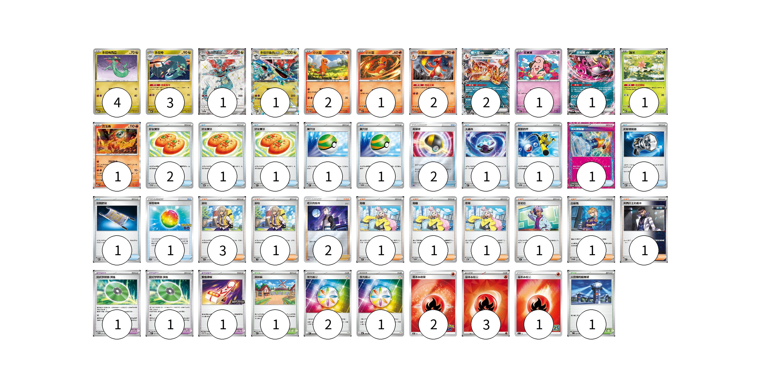 牌組構築方案 以此牌組為基礎新構築牌組 顯示卡面 顯示列表 寶可夢卡(20) 4 3 1 1 2 1 2 2 1 1 1 1 寶可夢道具(3) 1 1 1 物品卡(14) 2 1 1 1 1 2 1 1 1 1 1 1 支援者卡(12) 3 1 2 1 1 1 1 1 1 競技場卡(2) 1 1 能量卡(9) 2 1 2 3 1 寶可夢卡(20) 卡牌名稱 張數 卡牌名稱 張數 多龍梅西亞 SV8a 118/187 04 多龍奇 SV8a 119/187 03 多龍巴魯托ex SV6 120/101 01 多龍巴魯托ex SV8a 120/187 01 小火龍 SVTL 001/021 02 小火龍 SV3 012/108 01 火恐龍 SVTL 002/021 02 噴火龍ex SVTL 006/021 02 皮寶寶 SV3 042/108 01 吉雉雞ex SV8a 104/187 01 謝米 SV9a 006/063 01 古玉魚 SV8a 025/187 01 寶可夢道具(3) 卡牌名稱 張數 卡牌名稱 張數 招式學習器 演進 SVTL 017/021 01 招式學習器 演進 SVK 025/042 01 緊急滑板 SV-P 140/SV-P 01 物品卡(14) 卡牌名稱 張數 卡牌名稱 張數 好友寶芬 SVTG 011/019 02 好友寶芬 SV8a 147/187 01 好友寶芬 SVK 015/042 01 巢穴球 SVK 016/042 01 巢穴球 SVTR 013/021 01 高級球 SPD 010/020 02 太晶珠 SVK 013/042 01 厲害釣竿 SVTL 009/021 01 頂尖捕捉器 SV8a 148/187 01 反擊捕捉器 SV8a 139/187 01 夜間擔架 SV8a 151/187 01 神奇糖果 S10b 066/071 01 支援者卡(12) 卡牌名稱 張數 卡牌名稱 張數 派帕 SVK 035/042 03 派帕 SV1V 076/078 01 老大的指令(赤日) SPD 020/020 02 奇樹 SVK 031/042 01 奇樹 SVTR 017/021 01 奇樹 SVEM 017/020 01 吉尼亞 SV1S 074/078 01 白蕾雅 SV7 100/102 01 弗圖博士的劇本 SVK 034/042 01 競技場卡(2) 卡牌名稱 張數 卡牌名稱 張數 深缽鎮 SVK 039/042 01 火箭隊的監視塔 SV10 096/098 01 能量卡(9) 卡牌名稱 張數 卡牌名稱 張數 夜光能量 SVK 042/042 02 夜光能量 SV4a 190/190 01 基本火能量 S10b FIR 02 基本【火】能量 SVM FIR 03 基本火能量 S8a FIR 01 以此牌組為基礎新構築牌組 牌組編碼 mmbGlr-IhcpVw-iIxnLh copy 列印牌組單 牌組編碼已複製 分享至SNS