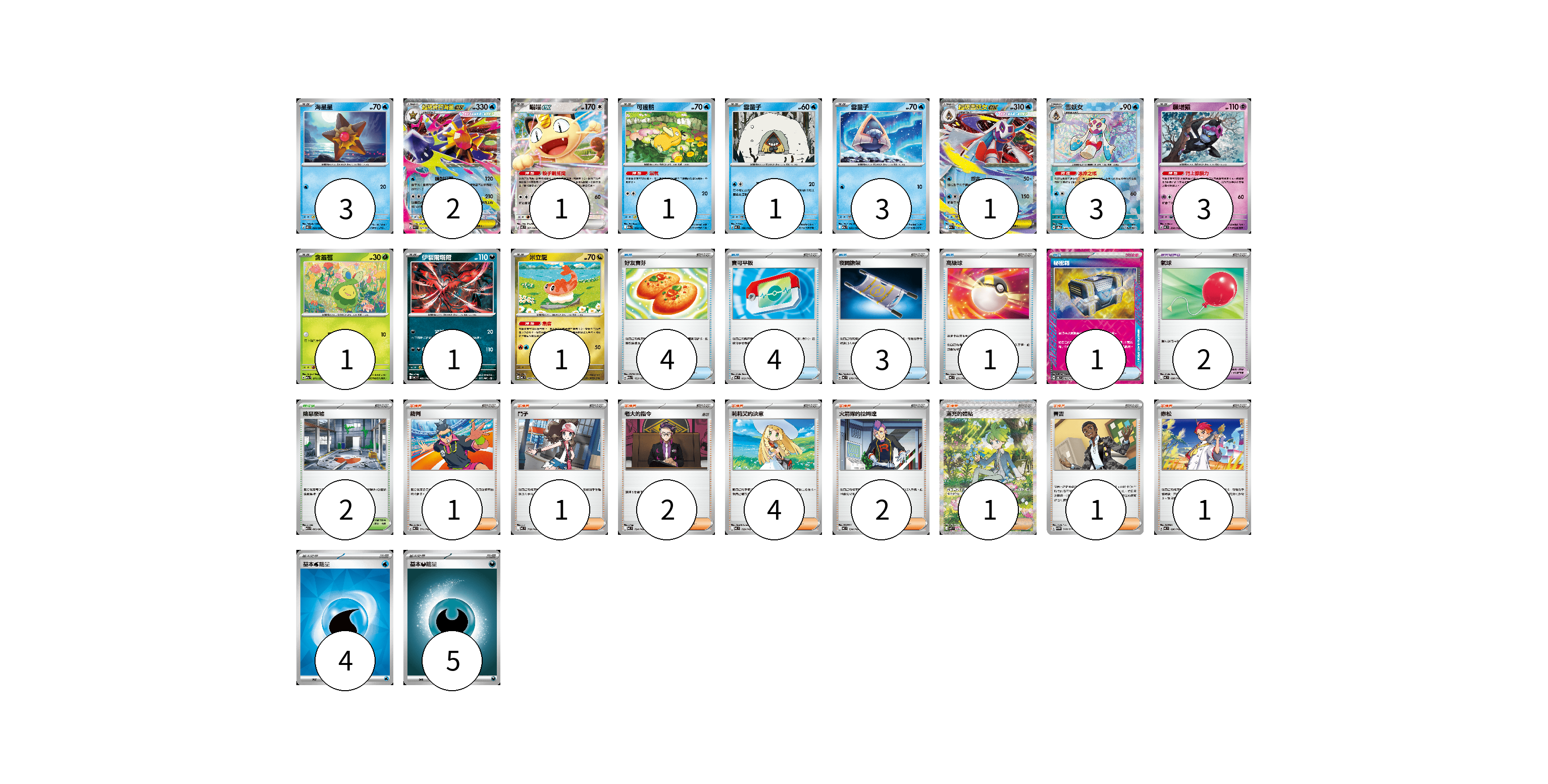 牌組構築方案 以此牌組為基礎新構築牌組 顯示卡面 顯示列表 寶可夢卡(21) 3 2 1 1 1 3 1 3 3 1 1 1 寶可夢道具(2) 2 物品卡(13) 4 4 3 1 1 支援者卡(13) 1 1 2 4 2 1 1 1 競技場卡(2) 2 能量卡(9) 4 5 寶可夢卡(21) 卡牌名稱 張數 卡牌名稱 張數 海星星 M3 020/080 03 超級寶石海星ex M3 021/080 02 喵喵ex M3 061/080 01 可達鴨 M2a 032/193 01 雪童子 MC 186/742 01 雪童子 M2a 035/193 03 超級雪妖女ex M2a 036/193 01 雪妖女 SV8a 038/187 03 願增猿 MC 358/742 03 含羞苞 M2a 011/193 01 伊裴爾塔爾 MC 481/742 01 米立龍 MC 549/742 01 寶可夢道具(2) 卡牌名稱 張數 卡牌名稱 張數 氣球 MC 688/742 02 物品卡(13) 卡牌名稱 張數 卡牌名稱 張數 好友寶芬 M2a 153/193 04 寶可平板 MC 662/742 04 夜間擔架 MC 670/742 03 高級球 MC 651/742 01 秘密箱 SV6 092/101 01 支援者卡(13) 卡牌名稱 張數 卡牌名稱 張數 裁判 MC 711/742 01 鬥子 MC 718/742 01 老大的指令 MC 724/742 02 莉莉艾的決意 MC 729/742 04 火箭隊的拉姆達 MC 734/742 02 滿充的體貼 M1S 091/063 01 賽吉 SV5M 068/071 01 赤松 MC 696/742 01 競技場卡(2) 卡牌名稱 張數 卡牌名稱 張數 險惡廢墟 M1L 063/063 02 能量卡(9) 卡牌名稱 張數 卡牌名稱 張數 基本【水】能量 SVM WAT 04 基本【惡】能量 MBG DAR 05 以此牌組為基礎新構築牌組 牌組編碼 mmgjfI-jSanuE-nRKtnA copy 列印牌組單 牌組編碼已複製 分享至SNS