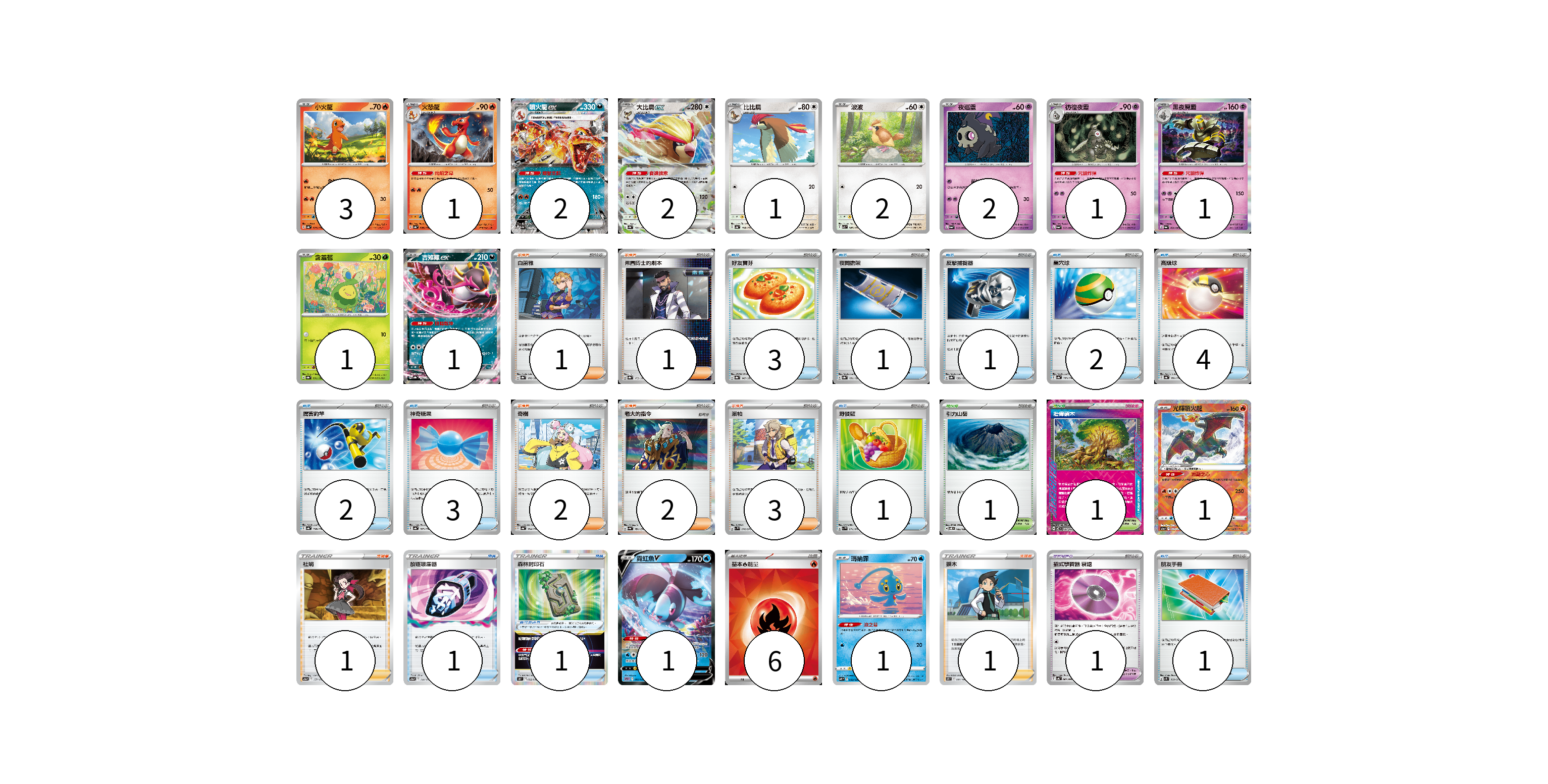 牌組構築方案 以此牌組為基礎新構築牌組 顯示卡面 顯示列表 寶可夢卡(20) 3 1 2 2 1 2 2 1 1 1 1 1 1 1 寶可夢道具(2) 1 1 物品卡(19) 3 1 1 2 4 2 3 1 1 1 支援者卡(11) 1 1 2 2 3 1 1 競技場卡(2) 1 1 能量卡(6) 6 寶可夢卡(20) 卡牌名稱 張數 卡牌名稱 張數 小火龍 SV4a 025/190 03 火恐龍 SV4a 026/190 01 噴火龍ex SV4a 115/190 02 大比鳥ex SV4a 139/190 02 比比鳥 SV4a 138/190 01 波波 SV3 087/108 02 夜巡靈 SV6a 018/064 02 彷徨夜靈 SV6a 019/064 01 黑夜魔靈 SV6a 020/064 01 含羞苞 SV8a 001/187 01 吉雉雞ex SV8a 104/187 01 光輝噴火龍 S12a 015/172 01 霓虹魚V SPD 002/020 01 瑪納霏 SVF 003/038 01 寶可夢道具(2) 卡牌名稱 張數 卡牌名稱 張數 森林封印石 S12 092/098 01 招式學習器 衰退 SV4K 063/066 01 物品卡(19) 卡牌名稱 張數 卡牌名稱 張數 好友寶芬 SV8a 147/187 03 夜間擔架 SV8a 151/187 01 反擊捕捉器 SV8a 139/187 01 巢穴球 SV4a 159/190 02 高級球 SV4a 161/190 04 厲害釣竿 SV4a 158/190 02 神奇糖果 SV4a 163/190 03 野餐籃 SV1V 071/078 01 放逐吸塵器 S12a 144/172 01 朋友手冊 SV1S 069/078 01 支援者卡(11) 卡牌名稱 張數 卡牌名稱 張數 白蕾雅 SV8a 176/187 01 弗圖博士的劇本 SV8a 175/187 01 奇樹 SV4a 174/190 02 老大的指令 SV4a 181/190 02 派帕 SV1V 076/078 03 杜娟 S12a 157/172 01 捩木 S11 097/100 01 競技場卡(2) 卡牌名稱 張數 卡牌名稱 張數 引力山岳 SV8 106/106 01 壯偉碩木 SV7 101/102 01 能量卡(6) 卡牌名稱 張數 卡牌名稱 張數 基本【火】能量 SVK FIR 06 以此牌組為基礎新構築牌組 牌組編碼 mtVHqZ-wVaJJX-EWUrAh copy 列印牌組單 牌組編碼已複製 分享至SNS
