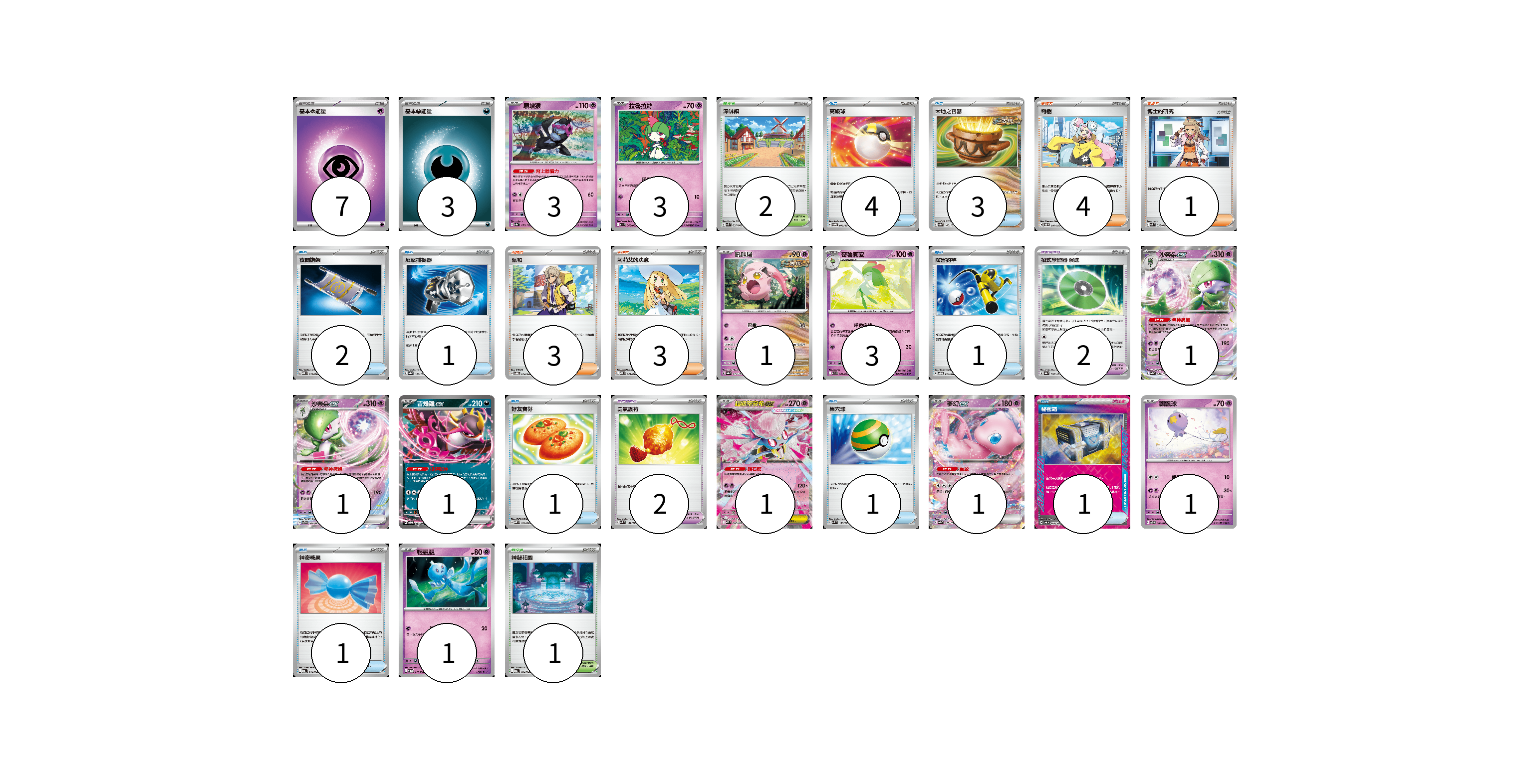 牌組構築方案 以此牌組為基礎新構築牌組 顯示卡面 顯示列表 寶可夢卡(17) 3 3 1 3 1 1 1 1 1 1 1 寶可夢道具(4) 2 2 物品卡(15) 4 3 2 1 1 1 1 1 1 支援者卡(11) 4 1 3 3 競技場卡(3) 2 1 能量卡(10) 7 3 寶可夢卡(17) 卡牌名稱 張數 卡牌名稱 張數 願增猿 SV8a 075/187 03 拉魯拉絲 M1S 040/063 03 吼叫尾 SV8a 071/187 01 奇魯莉安 M1S 041/063 03 沙奈朵ex SV4a 082/190 01 沙奈朵ex SVTS 004/022 01 吉雉雞ex SVOD 004/020 01 超級蒂安希ex MBD 006/022 01 夢幻ex SV4a 076/190 01 飄飄球 SVTS 005/022 01 輕飄飄 SV11W 041/086 01 寶可夢道具(4) 卡牌名稱 張數 卡牌名稱 張數 招式學習器 演進 SV8a 160/187 02 勇氣護符 SVM 142/175 02 物品卡(15) 卡牌名稱 張數 卡牌名稱 張數 高級球 SVOM 013/021 04 大地之容器 SV8a 143/187 03 夜間擔架 MBD 016/022 02 反擊捕捉器 SV8a 139/187 01 厲害釣竿 SVOD 010/020 01 好友寶芬 MBD 013/022 01 巢穴球 SVM 133/175 01 秘密箱 SV6 092/101 01 神奇糖果 MBG 013/022 01 支援者卡(11) 卡牌名稱 張數 卡牌名稱 張數 奇樹 SVOD 016/020 04 博士的研究 SVK 032/042 01 派帕 SVOD 018/020 03 莉莉艾的決意 MBD 021/022 03 競技場卡(3) 卡牌名稱 張數 卡牌名稱 張數 深缽鎮 SVK 039/042 02 神秘花園 MBD 022/022 01 能量卡(10) 卡牌名稱 張數 卡牌名稱 張數 基本【超】能量 MBD PSY 07 基本【惡】能量 MBG DAR 03 以此牌組為基礎新構築牌組 牌組編碼 muSfdg-hQPVBg-aYkGQv copy 列印牌組單 牌組編碼已複製 分享至SNS