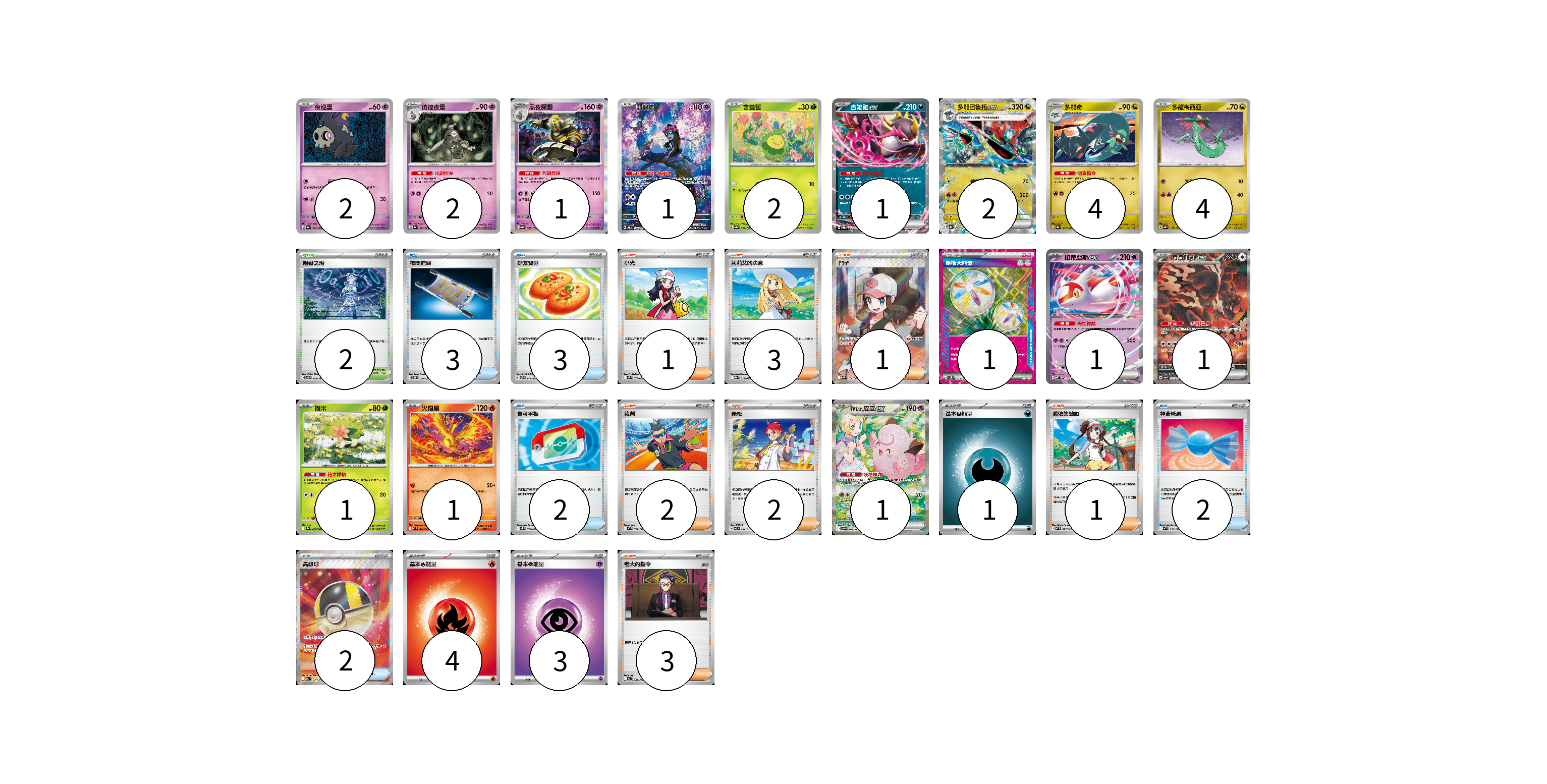 牌組構築方案 以此牌組為基礎新構築牌組 顯示卡面 顯示列表 寶可夢卡(24) 2 2 1 1 2 1 2 4 4 1 1 1 1 1 物品卡(12) 3 3 2 2 2 支援者卡(13) 1 3 1 2 2 1 3 競技場卡(2) 2 能量卡(9) 1 1 4 3 寶可夢卡(24) 卡牌名稱 張數 卡牌名稱 張數 夜巡靈 SV6a 018/064 02 彷徨夜靈 SV6a 019/064 02 黑夜魔靈 SV8a 066/187 01 願增猿 SV6 107/101 01 含羞苞 SV8a 001/187 02 吉雉雞ex SVOD 004/020 01 多龍巴魯托ex SV8a 120/187 02 多龍奇 SV8a 119/187 04 多龍梅西亞 SV8a 118/187 04 拉帝亞斯ex MBD 003/022 01 月月熊 赫月ex SV8a 225/187 01 謝米 SV9a 006/063 01 火焰鳥 M2 014/080 01 莉莉艾的皮皮ex SV9 126/100 01 物品卡(12) 卡牌名稱 張數 卡牌名稱 張數 夜間擔架 SVOM 016/021 03 好友寶芬 SVTS 012/022 03 寶可平板 M3 070/080 02 神奇糖果 MC 655/742 02 高級球 M2a 216/193 02 支援者卡(13) 卡牌名稱 張數 卡牌名稱 張數 小光 M2 077/080 01 莉莉艾的決意 MBG 022/022 03 鬥子 SV11W 166/086 01 裁判 MC 711/742 02 赤松 SV7 097/102 02 鳴依的勉勵 M3 075/080 01 老大的指令 MC 724/742 03 競技場卡(2) 卡牌名稱 張數 卡牌名稱 張數 阻礙之塔 SV6 100/101 02 能量卡(9) 卡牌名稱 張數 卡牌名稱 張數 新衝天能量 SV5K 071/071 01 基本【惡】能量 MC DAR 01 基本【火】能量 MC FIR 04 基本【超】能量 MC PSY 03 以此牌組為基礎新構築牌組 牌組編碼 muoNxZ-SRjOLR-nYFGcK copy 列印牌組單 牌組編碼已複製 分享至SNS