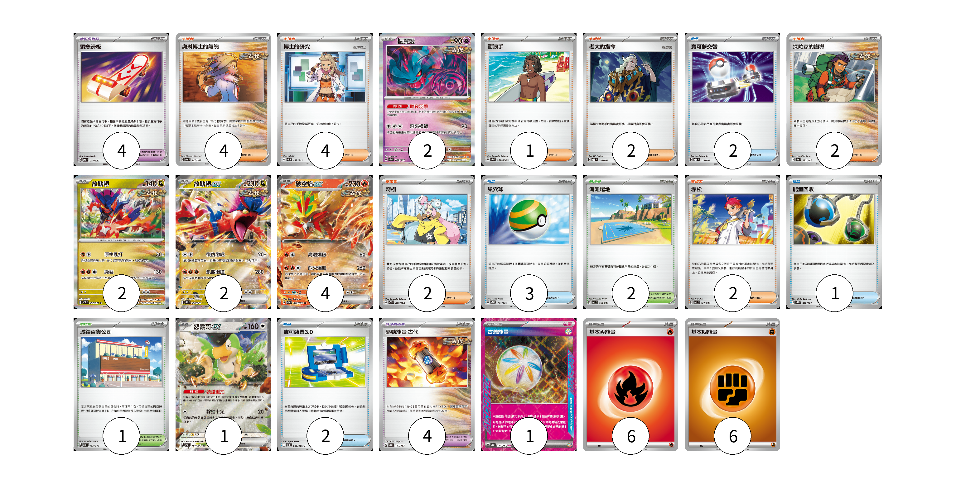 牌組構築方案 以此牌組為基礎新構築牌組 顯示卡面 顯示列表 寶可夢卡(11) 2 2 2 4 1 寶可夢道具(8) 4 4 物品卡(8) 2 3 1 2 支援者卡(17) 4 4 1 2 2 2 2 競技場卡(3) 2 1 能量卡(13) 1 6 6 寶可夢卡(11) 卡牌名稱 張數 卡牌名稱 張數 振翼髮 SV8a 072/187 02 故勒頓 SV5K 052/071 02 故勒頓ex SVHK 010/022 02 破空焰ex SV5K 012/071 04 怒鸚哥ex SV4a 154/190 01 寶可夢道具(8) 卡牌名稱 張數 卡牌名稱 張數 緊急滑板 SVOD 015/020 04 驅勁能量 古代 SV8a 157/187 04 物品卡(8) 卡牌名稱 張數 卡牌名稱 張數 寶可夢交替 MBG 015/022 02 巢穴球 SVM 133/175 03 能量回收 SVQL 012/022 01 寶可裝置3.0 SV11B 081/086 02 支援者卡(17) 卡牌名稱 張數 卡牌名稱 張數 奧琳博士的氣魄 SV8a 167/187 04 博士的研究 SVK 032/042 04 衝浪手 SV7a 061/064 01 老大的指令 MBD 020/022 02 探險家的嚮導 SV8a 172/187 02 奇樹 SVOD 016/020 02 赤松 SVK 027/042 02 競技場卡(3) 卡牌名稱 張數 卡牌名稱 張數 海灘場地 SVK 038/042 02 城鎮百貨公司 SVK 037/042 01 能量卡(13) 卡牌名稱 張數 卡牌名稱 張數 古舊能量 SV8a 187/187 01 基本火能量 sv-p FIR 06 基本鬥能量 sv-p FIG 06 以此牌組為基礎新構築牌組 牌組編碼 mwYaEP-fcixWO-ayfDoz copy 列印牌組單 牌組編碼已複製 分享至SNS