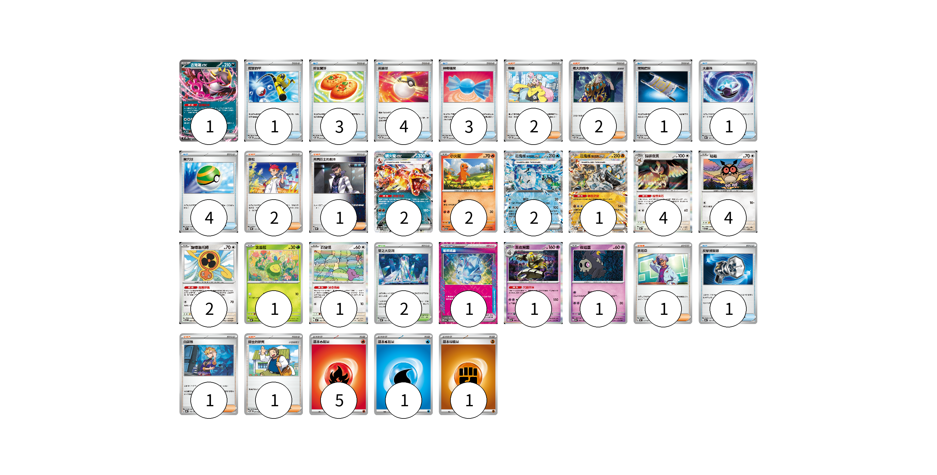 牌組構築方案 以此牌組為基礎新構築牌組 顯示卡面 顯示列表 寶可夢卡(22) 1 2 2 2 1 4 4 2 1 1 1 1 寶可夢道具(1) 1 物品卡(18) 1 3 4 3 1 1 4 1 支援者卡(10) 2 2 2 1 1 1 1 競技場卡(2) 2 能量卡(7) 5 1 1 寶可夢卡(22) 卡牌名稱 張數 卡牌名稱 張數 吉雉雞ex SVOD 004/020 01 噴火龍ex SV3 066/108 02 小火龍 SVTL 001/021 02 厄鬼椪 水井面具ex SV8a 050/187 02 厄鬼椪 礎石面具ex SV8a 091/187 01 貓頭夜鷹 SV8a 128/187 04 咕咕 SV7 076/102 04 旋轉洛托姆 SV7 080/102 02 含羞苞 SV8a 001/187 01 百變怪 SV4a 144/190 01 黑夜魔靈 SV8a 066/187 01 夜巡靈 SV8a 064/187 01 寶可夢道具(1) 卡牌名稱 張數 卡牌名稱 張數 璀璨結晶 SV8a 152/187 01 物品卡(18) 卡牌名稱 張數 卡牌名稱 張數 厲害釣竿 SVOD 010/020 01 好友寶芬 SVOD 011/020 03 高級球 SVOD 012/020 04 神奇糖果 SVOD 013/020 03 夜間擔架 SVOM 016/021 01 太晶珠 SV8a 145/187 01 巢穴球 SVM 133/175 04 反擊捕捉器 SV8a 139/187 01 支援者卡(10) 卡牌名稱 張數 卡牌名稱 張數 奇樹 SVOD 016/020 02 老大的指令 SVOD 019/020 02 赤松 SV8a 163/187 02 弗圖博士的劇本 SV8a 175/187 01 吉尼亞 SVAL 017/021 01 白蕾雅 SV8a 176/187 01 博士的研究 SVOD 017/020 01 競技場卡(2) 卡牌名稱 張數 卡牌名稱 張數 零之大空洞 SV8a 182/187 02 能量卡(7) 卡牌名稱 張數 卡牌名稱 張數 基本【火】能量 SVF FIR 05 基本【水】能量 SVF WAT 01 基本【鬥】能量 SVD FIG 01 以此牌組為基礎新構築牌組 牌組編碼 mytvMT-lANsXl-dZxTLE copy 列印牌組單 牌組編碼已複製 分享至SNS
