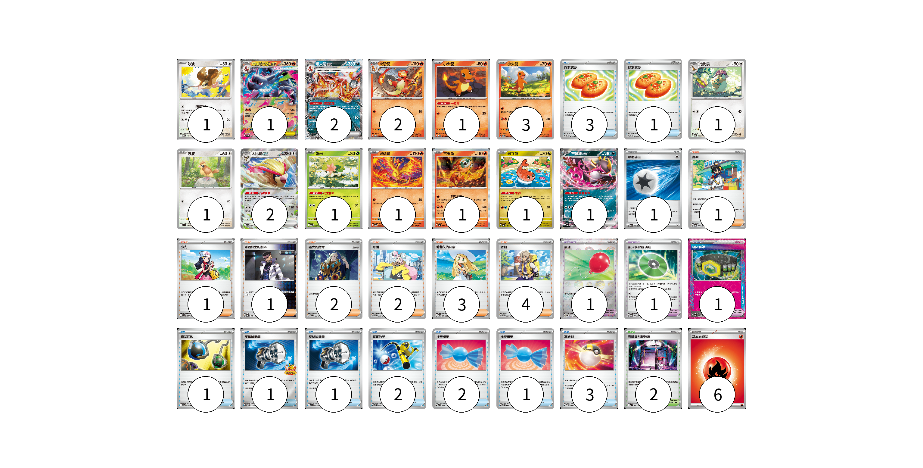 牌組構築方案 以此牌組為基礎新構築牌組 顯示卡面 顯示列表 寶可夢卡(19) 1 1 2 2 1 3 1 1 2 1 1 1 1 1 寶可夢道具(5) 2 1 1 1 物品卡(15) 3 1 1 1 1 2 2 1 3 支援者卡(12) 1 1 1 2 3 4 競技場卡(2) 2 能量卡(7) 1 6 寶可夢卡(19) 卡牌名稱 張數 卡牌名稱 張數 波波 SV4a 137/190 01 超級噴火龍Xex M2 013/080 01 噴火龍ex SVTL 006/021 02 火恐龍 M2 012/080 02 小火龍 M2 011/080 01 小火龍 SVTL 001/021 03 比比鳥 SV3 088/108 01 波波 SV3 087/108 01 大比鳥ex SV3 089/108 02 謝米 SV9a 006/063 01 火焰鳥 M2 014/080 01 古玉魚 SV8a 025/187 01 米立龍 SV8a 121/187 01 吉雉雞ex SV6a 038/064 01 寶可夢道具(5) 卡牌名稱 張數 卡牌名稱 張數 奇樹 SVTL 018/021 02 氣球 SV11B 082/086 01 招式學習器 演進 SV8a 160/187 01 極限腰帶 SV8a 159/187 01 物品卡(15) 卡牌名稱 張數 卡牌名稱 張數 好友寶芬 SVTL 010/021 03 好友寶芬 SVTS 012/022 01 能量回收 SV11W 079/086 01 反擊捕捉器 SV-P 083/SV-P 01 反擊捕捉器 SVK 009/042 01 厲害釣竿 SVTL 009/021 02 神奇糖果 SV1V 072/078 02 神奇糖果 SVTL 013/021 01 高級球 SVTL 012/021 03 支援者卡(12) 卡牌名稱 張數 卡牌名稱 張數 烏栗 SV8a 169/187 01 小光 M2 077/080 01 弗圖博士的劇本 SV8a 175/187 01 老大的指令 SVTL 021/021 02 莉莉艾的決意 M1L 062/063 03 派帕 SVTL 020/021 04 競技場卡(2) 卡牌名稱 張數 卡牌名稱 張數 對戰圓形競技場 M2 079/080 02 能量卡(7) 卡牌名稱 張數 卡牌名稱 張數 噴射能量 SVK 040/042 01 基本【火】能量 M-P FIR 06 以此牌組為基礎新構築牌組 牌組編碼 mywkre-YcnLRW-QvAYyb copy 列印牌組單 牌組編碼已複製 分享至SNS