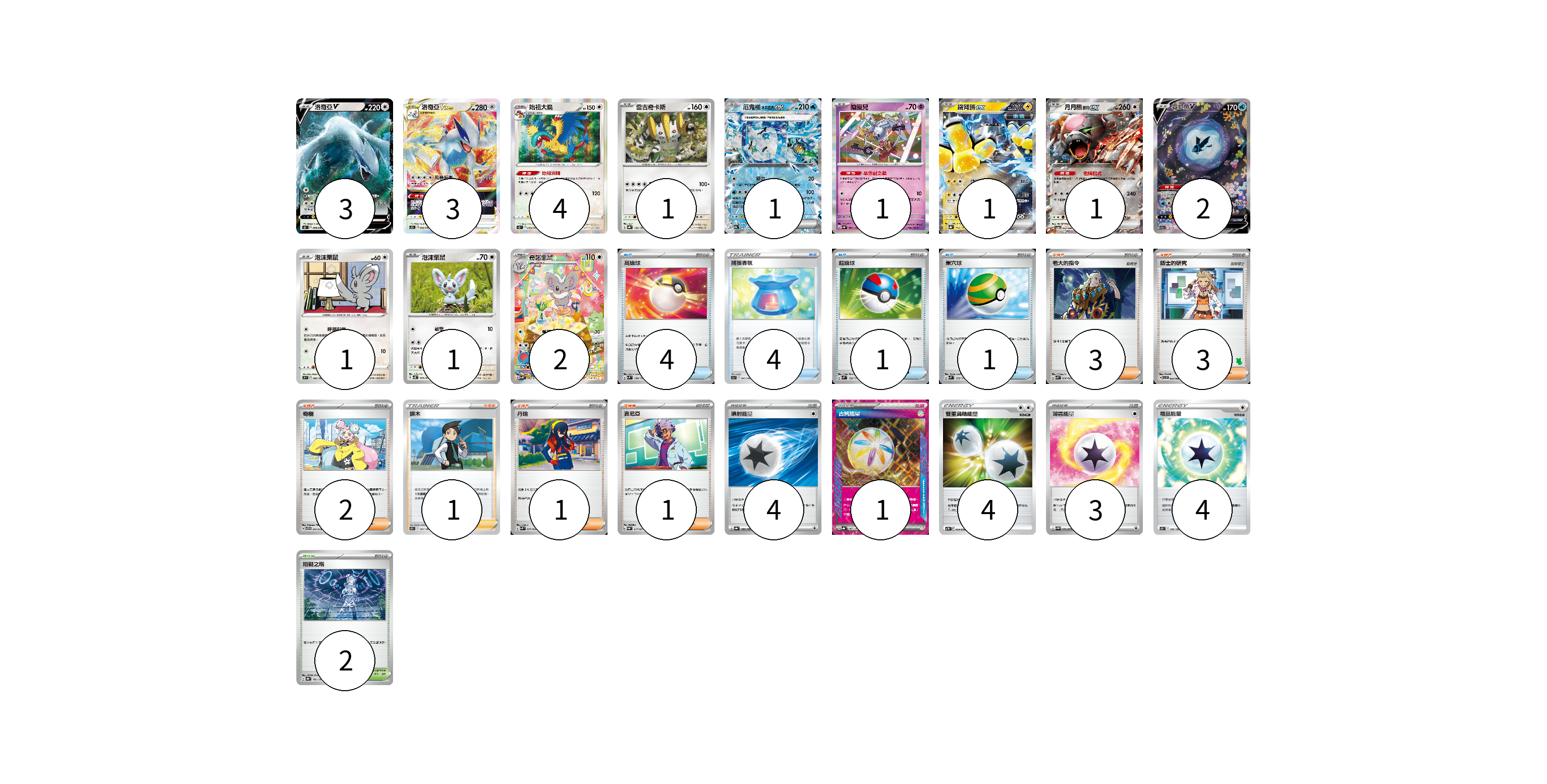 牌組構築方案 以此牌組為基礎新構築牌組 顯示卡面 顯示列表 寶可夢卡(21) 3 3 4 1 1 1 1 1 2 1 1 2 物品卡(10) 4 4 1 1 支援者卡(11) 3 3 2 1 1 1 競技場卡(2) 2 能量卡(16) 4 1 4 3 4 寶可夢卡(21) 卡牌名稱 張數 卡牌名稱 張數 洛奇亞V S12 079/098 03 洛奇亞VSTAR S12 080/098 03 始祖大鳥 S12 083/098 04 雷吉奇卡斯 SV8a 132/187 01 厄鬼椪 水井面具ex SV8a 050/187 01 鑰圈兒 SV4a 087/190 01 鐵臂膀ex SV8a 054/187 01 月月熊 赫月 ex SV5a 052/066 01 霓虹魚V S12a 216/172 02 泡沫栗鼠 S9 085/100 01 泡沫栗鼠 SV5K 059/071 01 奇諾栗鼠 SV5K 083/071 02 物品卡(10) 卡牌名稱 張數 卡牌名稱 張數 高級球 SVM 134/175 04 捕獲香氛 S11a 060/068 04 超級球 SVM 132/175 01 巢穴球 SVM 133/175 01 支援者卡(11) 卡牌名稱 張數 卡牌名稱 張數 老大的指令 SVK 036/042 03 博士的研究 SVI 063/066 03 奇樹 SVTG 017/019 02 捩木 S11 097/100 01 丹瑜 SVK 030/042 01 吉尼亞 SVAL 017/021 01 競技場卡(2) 卡牌名稱 張數 卡牌名稱 張數 阻礙之塔 SV8a 181/187 02 能量卡(16) 卡牌名稱 張數 卡牌名稱 張數 噴射能量 SV8a 185/187 04 古舊能量 SV8a 187/187 01 雙重渦輪能量 SVTM 022/022 04 薄霧能量 SV5M 071/071 03 禮品能量 S11 100/100 04 以此牌組為基礎新構築牌組 牌組編碼 nAhSNB-ZGZhHd-WVMVsb copy 列印牌組單 牌組編碼已複製 分享至SNS