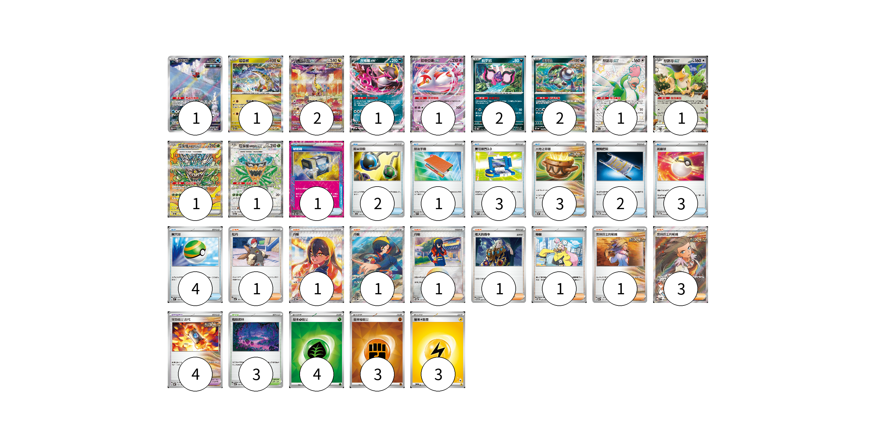 牌組構築方案 以此牌組為基礎新構築牌組 顯示卡面 顯示列表 寶可夢卡(14) 1 1 2 1 1 2 2 1 1 1 1 寶可夢道具(4) 4 物品卡(19) 1 2 1 3 3 2 3 4 支援者卡(10) 1 1 1 1 1 1 1 3 競技場卡(3) 3 能量卡(10) 4 3 3 寶可夢卡(14) 卡牌名稱 張數 卡牌名稱 張數 鐵包袱 SV4M 071/066 01 猛雷鼓 SV7 075/102 01 猛雷鼓ex SV5K 095/071 02 吉雉雞ex SV8a 104/187 01 拉帝亞斯ex SV7a 019/064 01 桃歹郎 SV8 075/106 02 猛惡菇 SV8a 099/187 02 怒鸚哥ex SV4a 337/190 01 怒鸚哥ex SVK 006/042 01 厄鬼椪 碧草面具ex SV8a 201/187 01 厄鬼椪 碧草面具ex SV6 114/101 01 寶可夢道具(4) 卡牌名稱 張數 卡牌名稱 張數 驅勁能量 古代 SV8a 157/187 04 物品卡(19) 卡牌名稱 張數 卡牌名稱 張數 秘密箱 SV6 092/101 01 能量回收 SVD 110/139 02 朋友手冊 SVK 014/042 01 寶可裝置3.0 SVK 021/042 03 大地之容器 SV8a 143/187 03 夜間擔架 SVOM 016/021 02 高級球 SVOD 012/020 03 巢穴球 SVM 133/175 04 支援者卡(10) 卡牌名稱 張數 卡牌名稱 張數 牡丹 SV4a 182/190 01 丹瑜 SV6 130/101 01 丹瑜 SV6 123/101 01 丹瑜 SV8a 170/187 01 老大的指令 SVTM 020/022 01 奇樹 SVOD 016/020 01 奧琳博士的氣魄 SV8a 167/187 01 奧琳博士的氣魄 SV4K 085/066 03 競技場卡(3) 卡牌名稱 張數 卡牌名稱 張數 危險密林 SV5K 070/071 03 能量卡(10) 卡牌名稱 張數 卡牌名稱 張數 基本【草】能量 SVK GRA 04 基本【鬥】能量 SVK FIG 03 基本【雷】能量 SVI LIG 03 以此牌組為基礎新構築牌組 牌組編碼 nCbVuC-bbAoyX-edCGrY copy 列印牌組單 牌組編碼已複製 分享至SNS