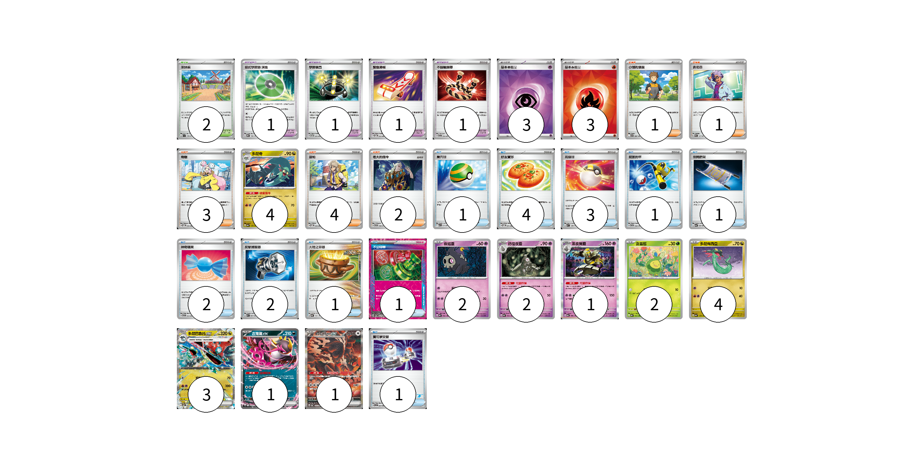 牌組構築方案 以此牌組為基礎新構築牌組 顯示卡面 顯示列表 寶可夢卡(20) 4 2 2 1 2 4 3 1 1 寶可夢道具(4) 1 1 1 1 物品卡(17) 1 4 3 1 1 2 2 1 1 1 支援者卡(11) 1 1 3 4 2 競技場卡(2) 2 能量卡(6) 3 3 寶可夢卡(20) 卡牌名稱 張數 卡牌名稱 張數 多龍奇 SV8a 119/187 04 夜巡靈 SV8a 064/187 02 彷徨夜靈 SV8a 065/187 02 黑夜魔靈 SV8a 066/187 01 含羞苞 SV8a 001/187 02 多龍梅西亞 SV8a 118/187 04 多龍巴魯托ex SV6 081/101 03 吉雉雞ex SVOD 004/020 01 月月熊 赫月ex SV8a 225/187 01 寶可夢道具(4) 卡牌名稱 張數 卡牌名稱 張數 招式學習器 演進 SV8a 160/187 01 學習裝置 SVTM 016/022 01 緊急滑板 SVOD 015/020 01 不服輸頭帶 SVTL 016/021 01 物品卡(17) 卡牌名稱 張數 卡牌名稱 張數 巢穴球 SVHM 012/022 01 好友寶芬 SVOD 011/020 04 高級球 SVM 134/175 03 厲害釣竿 SVTH 008/018 01 夜間擔架 SV6a 056/064 01 神奇糖果 SVTS 015/022 02 反擊捕捉器 SVK 009/042 02 大地之容器 SV8a 143/187 01 不公印章 SV5a 053/066 01 寶可夢交替 SVI 054/066 01 支援者卡(11) 卡牌名稱 張數 卡牌名稱 張數 小剛的發掘 SV9 096/100 01 吉尼亞 SVAL 017/021 01 奇樹 SVOD 016/020 03 派帕 SVOD 018/020 04 老大的指令 SVTG 019/019 02 競技場卡(2) 卡牌名稱 張數 卡牌名稱 張數 深缽鎮 SV1a 070/073 02 能量卡(6) 卡牌名稱 張數 卡牌名稱 張數 基本【超】能量 SVOD PSY 03 基本【火】能量 SVK FIR 03 以此牌組為基礎新構築牌組 牌組編碼 nDbvFk-lcSbRs-GRXKTn copy 列印牌組單 牌組編碼已複製 分享至SNS