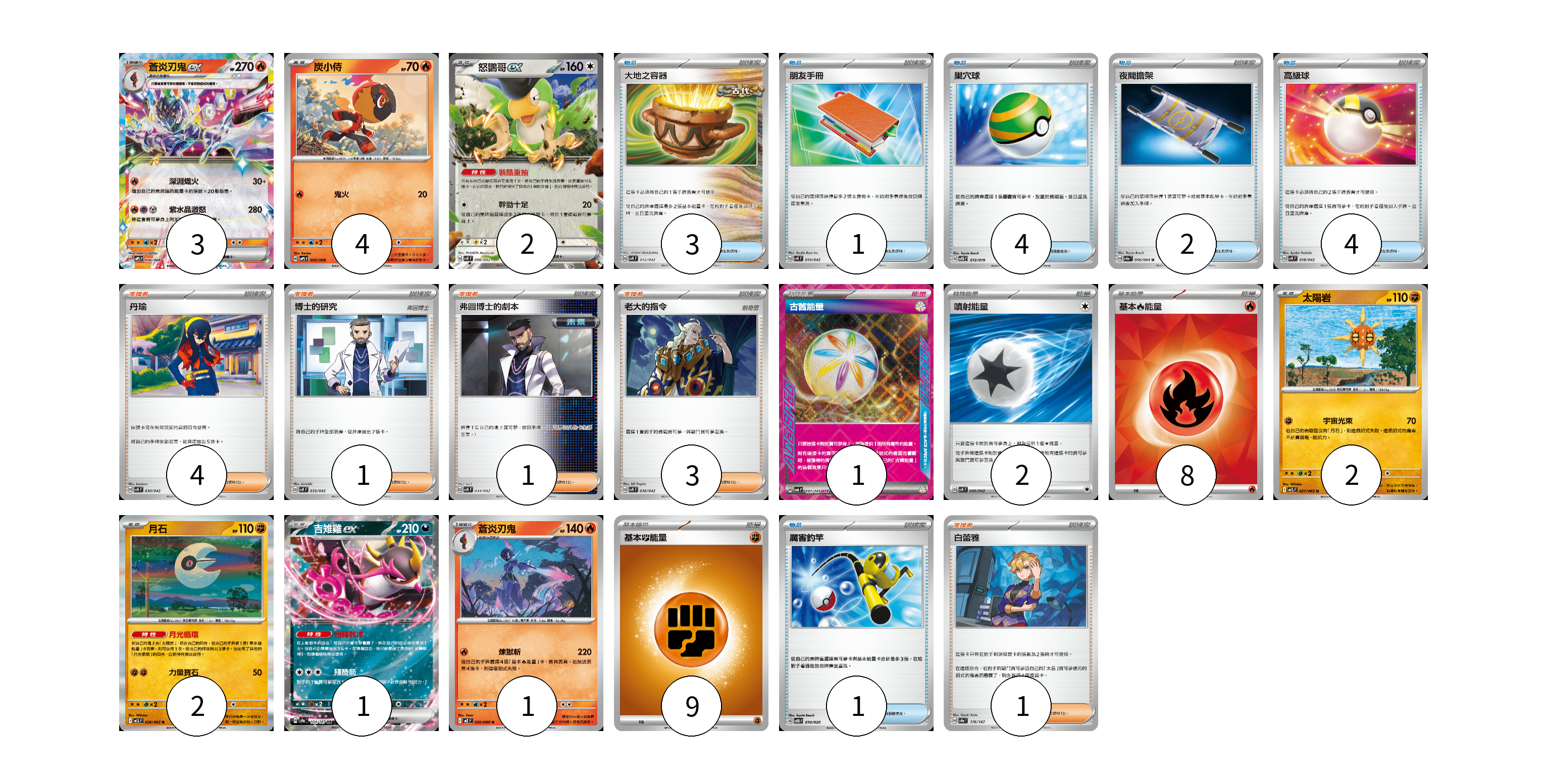 牌組構築方案 以此牌組為基礎新構築牌組 顯示卡面 顯示列表 寶可夢卡(15) 3 4 2 2 2 1 1 物品卡(15) 3 1 4 2 4 1 支援者卡(10) 4 1 1 3 1 能量卡(20) 1 2 8 9 寶可夢卡(15) 卡牌名稱 張數 卡牌名稱 張數 蒼炎刃鬼ex SVPS 006/008 03 炭小侍 SVPS 005/008 04 怒鸚哥ex SVK 006/042 02 太陽岩 M1L 027/063 02 月石 M1L 026/063 02 吉雉雞ex SV8a 104/187 01 蒼炎刃鬼 M2 020/080 01 物品卡(15) 卡牌名稱 張數 卡牌名稱 張數 大地之容器 SVK 012/042 03 朋友手冊 SVK 014/042 01 巢穴球 SVTG 012/019 04 夜間擔架 SV6a 056/064 02 高級球 SVK 018/042 04 厲害釣竿 SVOD 010/020 01 支援者卡(10) 卡牌名稱 張數 卡牌名稱 張數 丹瑜 SVK 030/042 04 博士的研究 SVK 033/042 01 弗圖博士的劇本 SVK 034/042 01 老大的指令 SVK 036/042 03 白蕾雅 SV8a 176/187 01 能量卡(20) 卡牌名稱 張數 卡牌名稱 張數 古舊能量 SV6 101/101 01 噴射能量 SVK 040/042 02 基本【火】能量 SVK FIR 08 基本【鬥】能量 M-P FIG 09 以此牌組為基礎新構築牌組 牌組編碼 nHBRZS-NIkVpE-UOABjK copy 列印牌組單 牌組編碼已複製 分享至SNS