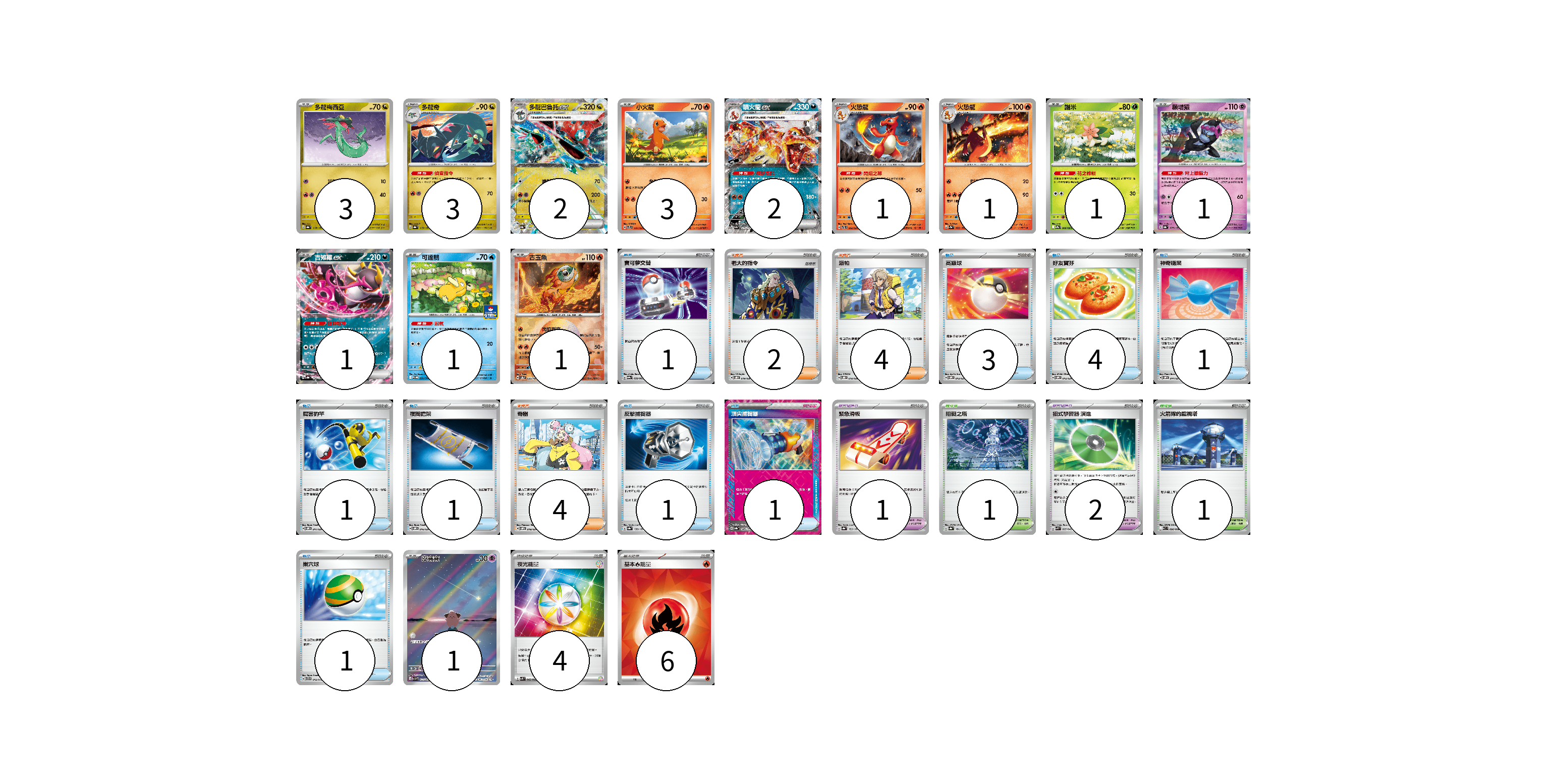牌組構築方案 以此牌組為基礎新構築牌組 顯示卡面 顯示列表 寶可夢卡(21) 3 3 2 3 2 1 1 1 1 1 1 1 1 寶可夢道具(3) 1 2 物品卡(14) 1 3 4 1 1 1 1 1 1 支援者卡(10) 2 4 4 競技場卡(2) 1 1 能量卡(10) 4 6 寶可夢卡(21) 卡牌名稱 張數 卡牌名稱 張數 多龍梅西亞 SV8a 118/187 03 多龍奇 SV8a 119/187 03 多龍巴魯托ex SV8a 120/187 02 小火龍 SVTL 001/021 03 噴火龍ex SV4a 115/190 02 火恐龍 SVTL 002/021 01 火恐龍 SV2a 005/165 01 謝米 SV9a 006/063 01 願增猿 SV8a 075/187 01 吉雉雞ex SV8a 104/187 01 可達鴨 SV-P 220/SV-P 01 古玉魚 SV8a 025/187 01 皮寶寶 SV3 113/108 01 寶可夢道具(3) 卡牌名稱 張數 卡牌名稱 張數 緊急滑板 SV8a 153/187 01 招式學習器 演進 SVK 025/042 02 物品卡(14) 卡牌名稱 張數 卡牌名稱 張數 寶可夢交替 SV9a 058/063 01 高級球 SVOM 013/021 03 好友寶芬 SVOM 012/021 04 神奇糖果 SVOM 014/021 01 厲害釣竿 SVOM 011/021 01 夜間擔架 SVOM 016/021 01 反擊捕捉器 SV8a 139/187 01 頂尖捕捉器 SV8a 148/187 01 巢穴球 SVTG 012/019 01 支援者卡(10) 卡牌名稱 張數 卡牌名稱 張數 老大的指令 SVOD 019/020 02 派帕 SVOD 018/020 04 奇樹 SVOM 018/021 04 競技場卡(2) 卡牌名稱 張數 卡牌名稱 張數 阻礙之塔 SV8a 181/187 01 火箭隊的監視塔 SV10 096/098 01 能量卡(10) 卡牌名稱 張數 卡牌名稱 張數 夜光能量 SVK 042/042 04 基本【火】能量 SVK FIR 06 以此牌組為基礎新構築牌組 牌組編碼 nIgDnL-iLwxhB-iRMgsX copy 列印牌組單 牌組編碼已複製 分享至SNS