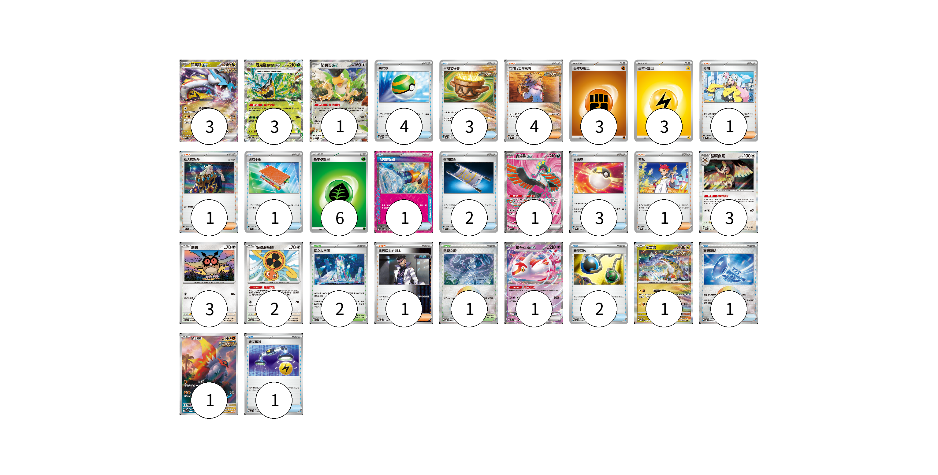 牌組構築方案 以此牌組為基礎新構築牌組 顯示卡面 顯示列表 寶可夢卡(19) 3 3 1 1 3 3 2 1 1 1 物品卡(18) 4 3 1 1 2 3 2 1 1 支援者卡(8) 4 1 1 1 1 競技場卡(3) 2 1 能量卡(12) 3 3 6 寶可夢卡(19) 卡牌名稱 張數 卡牌名稱 張數 猛雷鼓ex SV5K 053/071 03 厄鬼椪 碧草面具ex SV6 016/101 03 怒鸚哥ex SV4a 154/190 01 吉雉雞ex SV6a 081/064 01 貓頭夜鷹 SV8a 128/187 03 咕咕 SV7 076/102 03 旋轉洛托姆 SV7 080/102 02 拉帝亞斯ex SV7a 019/064 01 猛雷鼓 SV7 075/102 01 爬地翅 SV4K 074/066 01 物品卡(18) 卡牌名稱 張數 卡牌名稱 張數 巢穴球 SV4a 159/190 04 大地之容器 SVHK 011/022 03 朋友手冊 SV1S 069/078 01 頂尖捕捉器 SV5M 062/071 01 夜間擔架 SV6a 056/064 02 高級球 SVM 134/175 03 能量回收 SVTM 009/022 02 玻璃喇叭 SV8a 140/187 01 能量轉移 SVM 127/175 01 支援者卡(8) 卡牌名稱 張數 卡牌名稱 張數 奧琳博士的氣魄 SVHK 017/022 04 奇樹 SVHK 019/022 01 老大的指令 SV1a 069/073 01 赤松 SV8a 163/187 01 弗圖博士的劇本 SV8a 175/187 01 競技場卡(3) 卡牌名稱 張數 卡牌名稱 張數 零之大空洞 SV7 102/102 02 阻礙之塔 SV8a 181/187 01 能量卡(12) 卡牌名稱 張數 卡牌名稱 張數 基本【鬥】能量 SVHK FIG 03 基本【雷】能量 SVHM LIG 03 基本【草】能量 SVF GRA 06 以此牌組為基礎新構築牌組 牌組編碼 nMYUVy-FZoEEZ-syoCtg copy 列印牌組單 牌組編碼已複製 分享至SNS