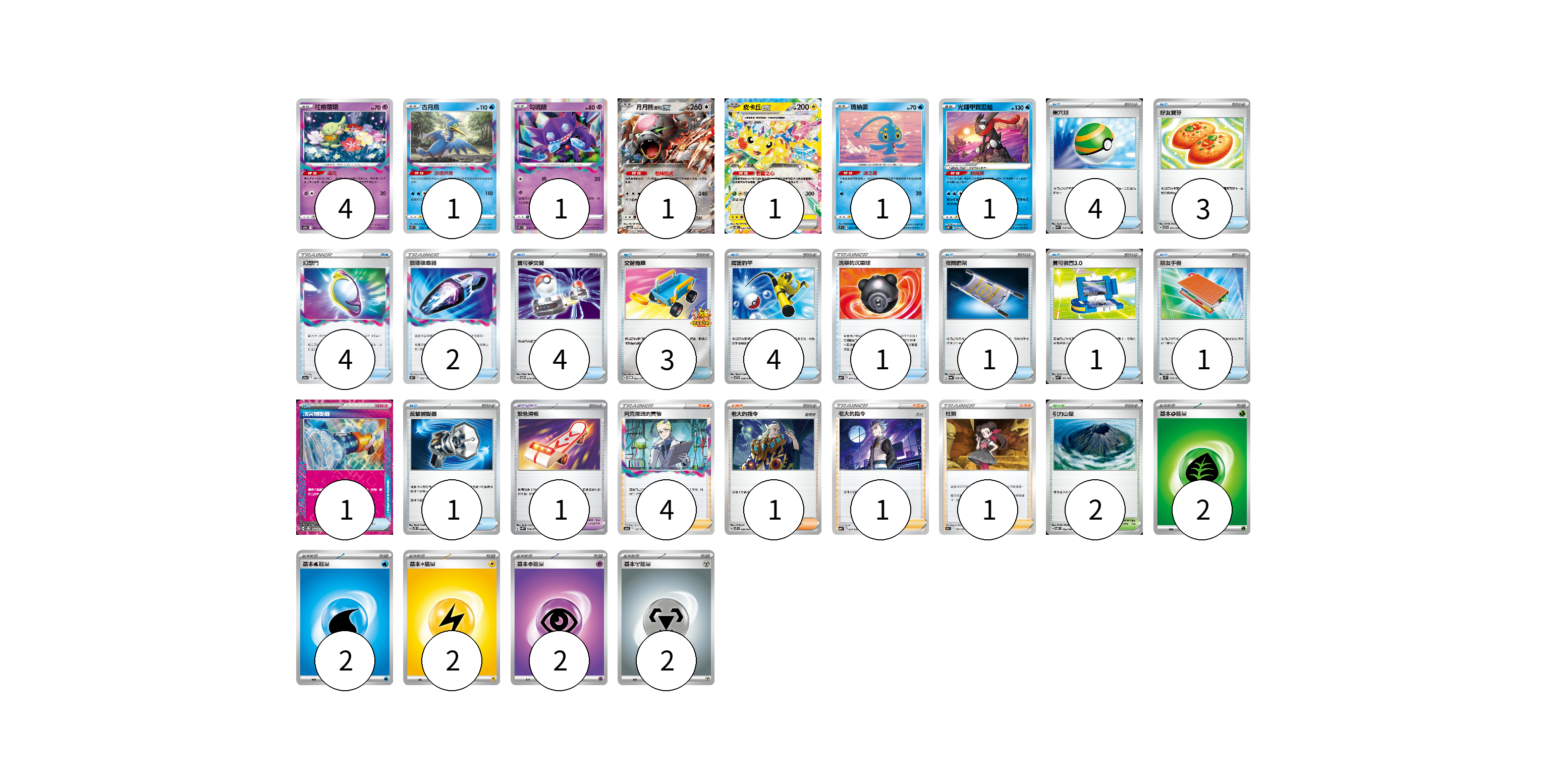 牌組構築方案 以此牌組為基礎新構築牌組 顯示卡面 顯示列表 寶可夢卡(10) 4 1 1 1 1 1 1 寶可夢道具(1) 1 物品卡(30) 4 3 4 2 4 3 4 1 1 1 1 1 1 支援者卡(7) 4 1 1 1 競技場卡(2) 2 能量卡(10) 2 2 2 2 2 寶可夢卡(10) 卡牌名稱 張數 卡牌名稱 張數 花療環環 S12a 064/172 04 古月鳥 S11 033/100 01 勾魂眼 S11 044/100 01 月月熊 赫月 ex SV5a 052/066 01 皮卡丘ex SV8 033/106 01 瑪納霏 S9 031/100 01 光輝甲賀忍蛙 SVTG 002/019 01 寶可夢道具(1) 卡牌名稱 張數 卡牌名稱 張數 緊急滑板 SV5K 064/071 01 物品卡(30) 卡牌名稱 張數 卡牌名稱 張數 巢穴球 SVK 016/042 04 好友寶芬 SVTG 011/019 03 幻想門 S12a 141/172 04 放逐吸塵器 S11 093/100 02 寶可夢交替 SVTM 014/022 04 交替推車 SV-P 082/SV-P 03 厲害釣竿 SVTG 009/019 04 洗翠的沉重球 SVB 014/028 01 夜間擔架 SV6a 056/064 01 寶可裝置3.0 SVK 021/042 01 朋友手冊 SV1S 069/078 01 頂尖捕捉器 SV5M 062/071 01 反擊捕捉器 SVTS 009/022 01 支援者卡(7) 卡牌名稱 張數 卡牌名稱 張數 阿克羅瑪的實驗 S12a 148/172 04 老大的指令 SVTS 020/022 01 老大的指令(赤日) SVB 024/028 01 杜娟 S9a 065/067 01 競技場卡(2) 卡牌名稱 張數 卡牌名稱 張數 引力山岳 SV8 106/106 02 能量卡(10) 卡牌名稱 張數 卡牌名稱 張數 基本【草】能量 SVF GRA 02 基本【水】能量 SVF WAT 02 基本【雷】能量 SVF LIG 02 基本【超】能量 SVF PSY 02 基本【鋼】能量 SVF MET 02 以此牌組為基礎新構築牌組 牌組編碼 nNZiiF-bpLTzs-wftwok copy 列印牌組單 牌組編碼已複製 分享至SNS
