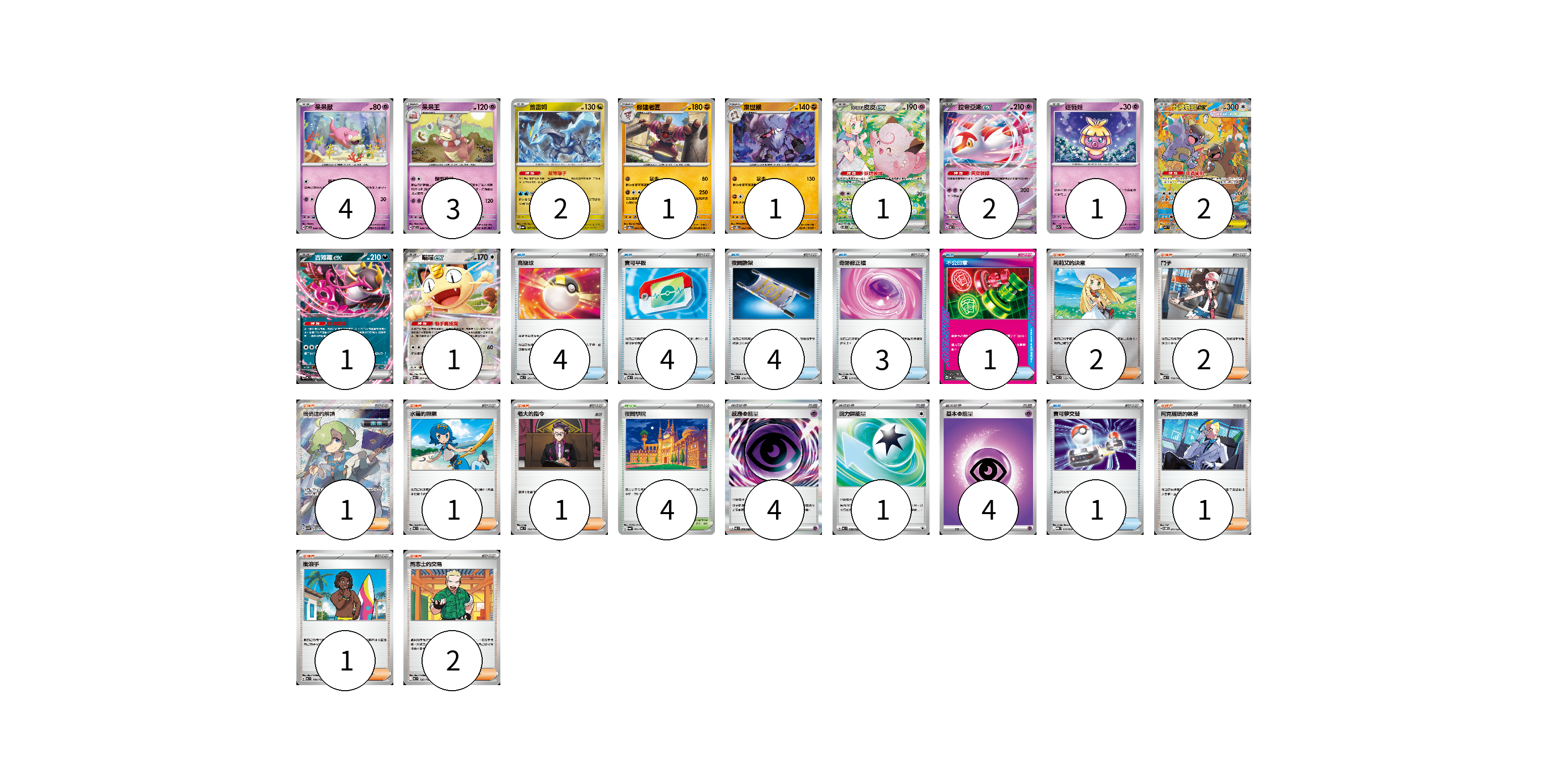 牌組構築方案 以此牌組為基礎新構築牌組 顯示卡面 顯示列表 寶可夢卡(19) 4 3 2 1 1 1 2 1 2 1 1 物品卡(17) 4 4 4 3 1 1 支援者卡(11) 2 2 1 1 1 1 1 2 競技場卡(4) 4 能量卡(9) 4 1 4 寶可夢卡(19) 卡牌名稱 張數 卡牌名稱 張數 呆呆獸 SV7 038/102 04 呆呆王 SV7 039/102 03 酋雷姆 SV6a 047/064 02 修建老匠 SV6 061/101 01 棄世猴 SV8 062/106 01 莉莉艾的皮皮ex SV9 126/100 01 拉帝亞斯ex MC 312/742 02 迷唇娃 SV7a 018/064 01 超級袋獸ex M1S 089/063 02 吉雉雞ex MC 489/742 01 喵喵ex M3 061/080 01 物品卡(17) 卡牌名稱 張數 卡牌名稱 張數 高級球 MC 651/742 04 寶可平板 M3 070/080 04 夜間擔架 MC 670/742 04 奇跡修正檔 MBD 017/022 03 不公印章 MC 633/742 01 寶可夢交替 MBG 015/022 01 支援者卡(11) 卡牌名稱 張數 卡牌名稱 張數 莉莉艾的決意 MC 729/742 02 鬥子 MC 718/742 02 暗碼迷的解讀 SV5M 090/071 01 水蓮的照顧 MC 712/742 01 老大的指令 MC 724/742 01 阿克羅瑪的執著 SVOM 017/021 01 衝浪手 MC 708/742 01 馬志士的交易 MC 726/742 02 競技場卡(4) 卡牌名稱 張數 卡牌名稱 張數 夜間學院 SV6a 064/064 04 能量卡(9) 卡牌名稱 張數 卡牌名稱 張數 感應【超】能量 M3 079/080 04 回力鏢能量 MC 738/742 01 基本【超】能量 MC PSY 04 以此牌組為基礎新構築牌組 牌組編碼 nOufwZ-UDDxDG-usmhOM copy 列印牌組單 牌組編碼已複製 分享至SNS