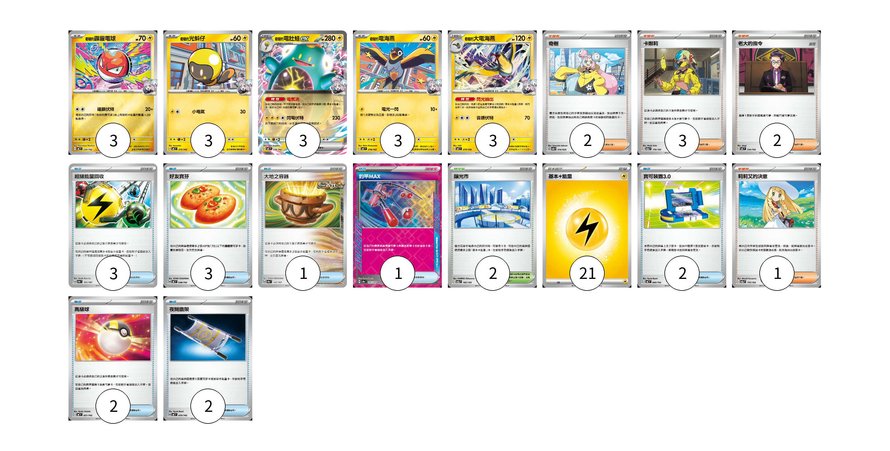 牌組構築方案 以此牌組為基礎新構築牌組 顯示卡面 顯示列表 寶可夢卡(15) 3 3 3 3 3 物品卡(14) 3 3 1 1 2 2 2 支援者卡(8) 2 3 2 1 競技場卡(2) 2 能量卡(21) 21 寶可夢卡(15) 卡牌名稱 張數 卡牌名稱 張數 奇樹的霹靂電球 MC 234/742 03 奇樹的光蚪仔 MC 273/742 03 奇樹的電肚蛙ex MC 274/742 03 奇樹的電海燕 MC 278/742 03 奇樹的大電海燕 MC 279/742 03 物品卡(14) 卡牌名稱 張數 卡牌名稱 張數 超級能量回收 SV8a 141/187 03 好友寶芬 MC 648/742 03 大地之容器 SV8a 143/187 01 釣竿MAX SV8a 142/187 01 寶可裝置3.0 MC 660/742 02 高級球 MC 651/742 02 夜間擔架 MC 670/742 02 支援者卡(8) 卡牌名稱 張數 卡牌名稱 張數 奇樹 SVOD 016/020 02 卡娜莉 M2a 170/193 03 老大的指令 MC 724/742 02 莉莉艾的決意 M2a 175/193 01 競技場卡(2) 卡牌名稱 張數 卡牌名稱 張數 釀光市 M2a 185/193 02 能量卡(21) 卡牌名稱 張數 卡牌名稱 張數 基本【雷】能量 MC LIG 21 以此牌組為基礎新構築牌組 牌組編碼 nPVUhk-xciZZs-zFtYlN copy 列印牌組單 牌組編碼已複製 分享至SNS