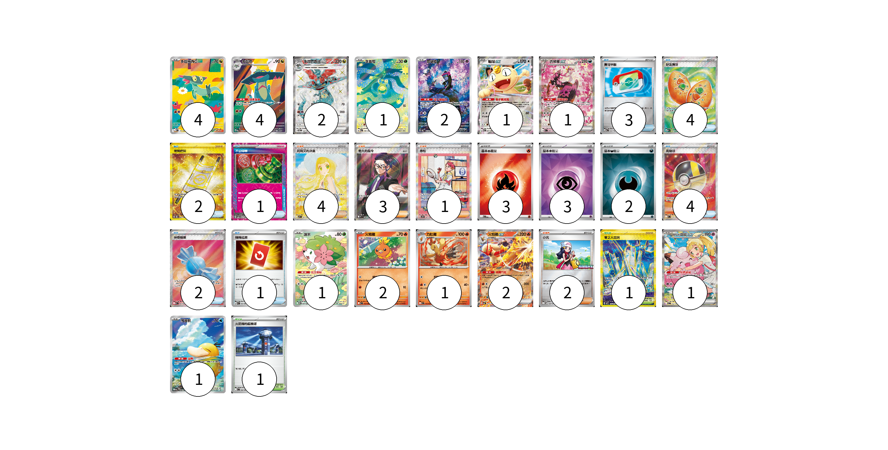 牌組構築方案 以此牌組為基礎新構築牌組 顯示卡面 顯示列表 寶可夢卡(23) 4 4 2 1 2 1 1 1 2 1 2 1 1 物品卡(17) 3 4 2 1 4 2 1 支援者卡(10) 4 3 1 2 競技場卡(2) 1 1 能量卡(8) 3 3 2 寶可夢卡(23) 卡牌名稱 張數 卡牌名稱 張數 多龍梅西亞 M2a 211/193 04 多龍奇 M2a 212/193 04 多龍巴魯托ex SV6 120/101 02 含羞苞 M2a 196/193 01 願增猿 SV6 107/101 02 喵喵ex M3 061/080 01 吉雉雞ex M2a 244/193 01 謝米 SV9a 066/063 01 火稚雞 SV10 018/098 02 力壯雞 SV10 019/098 01 火焰雞ex SVM 016/175 02 莉莉艾的皮皮ex MC 765/742 01 可達鴨 M2a 199/193 01 物品卡(17) 卡牌名稱 張數 卡牌名稱 張數 寶可平板 MC 662/742 03 好友寶芬 M1S 081/063 04 夜間擔架 SV8 137/106 02 不公印章 SV5a 053/066 01 高級球 M2a 216/193 04 神奇糖果 M1S 082/063 02 特殊紅牌 M4 072/083 01 支援者卡(10) 卡牌名稱 張數 卡牌名稱 張數 莉莉艾的決意 M1L 091/063 04 老大的指令(烏羽) MC 760/742 03 赤松 SV8a 227/187 01 小光 M-P 028/M-P 02 競技場卡(2) 卡牌名稱 張數 卡牌名稱 張數 零之大空洞 SV7 135/102 01 火箭隊的監視塔 SV10 096/098 01 能量卡(8) 卡牌名稱 張數 卡牌名稱 張數 基本【火】能量 MC FIR 03 基本【超】能量 SVOD PSY 03 基本【惡】能量 SVOM DAR 02 以此牌組為基礎新構築牌組 牌組編碼 nTCixm-iRlfIt-uUdkCx copy 列印牌組單 牌組編碼已複製 分享至SNS