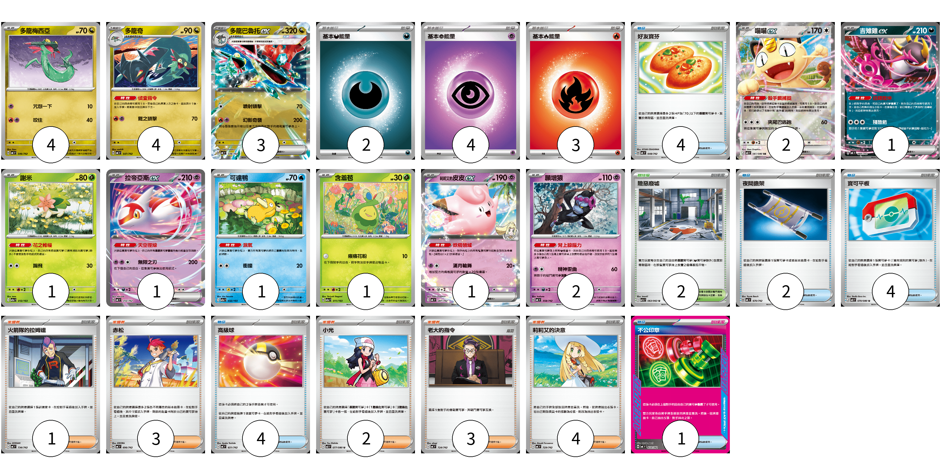 牌組構築方案 以此牌組為基礎新構築牌組 顯示卡面 顯示列表 寶可夢卡(21) 4 4 3 2 1 1 1 1 1 1 2 物品卡(15) 4 2 4 4 1 支援者卡(13) 1 3 2 3 4 競技場卡(2) 2 能量卡(9) 2 4 3 寶可夢卡(21) 卡牌名稱 張數 卡牌名稱 張數 多龍梅西亞 MC 546/742 04 多龍奇 MC 547/742 04 多龍巴魯托ex MC 548/742 03 喵喵ex M3 061/080 02 吉雉雞ex MC 489/742 01 謝米 M2a 012/193 01 拉帝亞斯ex MC 312/742 01 可達鴨 M2a 032/193 01 含羞苞 M2a 011/193 01 莉莉艾的皮皮ex MC 287/742 01 願增猿 MC 358/742 02 物品卡(15) 卡牌名稱 張數 卡牌名稱 張數 好友寶芬 MC 648/742 04 夜間擔架 MC 670/742 02 寶可平板 M3 070/080 04 高級球 MC 651/742 04 不公印章 MC 633/742 01 支援者卡(13) 卡牌名稱 張數 卡牌名稱 張數 火箭隊的拉姆達 MC 734/742 01 赤松 MC 696/742 03 小光 M2 077/080 02 老大的指令 MC 724/742 03 莉莉艾的決意 MC 729/742 04 競技場卡(2) 卡牌名稱 張數 卡牌名稱 張數 險惡廢墟 M1L 063/063 02 能量卡(9) 卡牌名稱 張數 卡牌名稱 張數 基本【惡】能量 MC DAR 02 基本【超】能量 MC PSY 04 基本【火】能量 MC FIR 03 以此牌組為基礎新構築牌組 牌組編碼 nTTrEp-JoqOup-BDXCuK copy 列印牌組單 牌組編碼已複製 分享至SNS