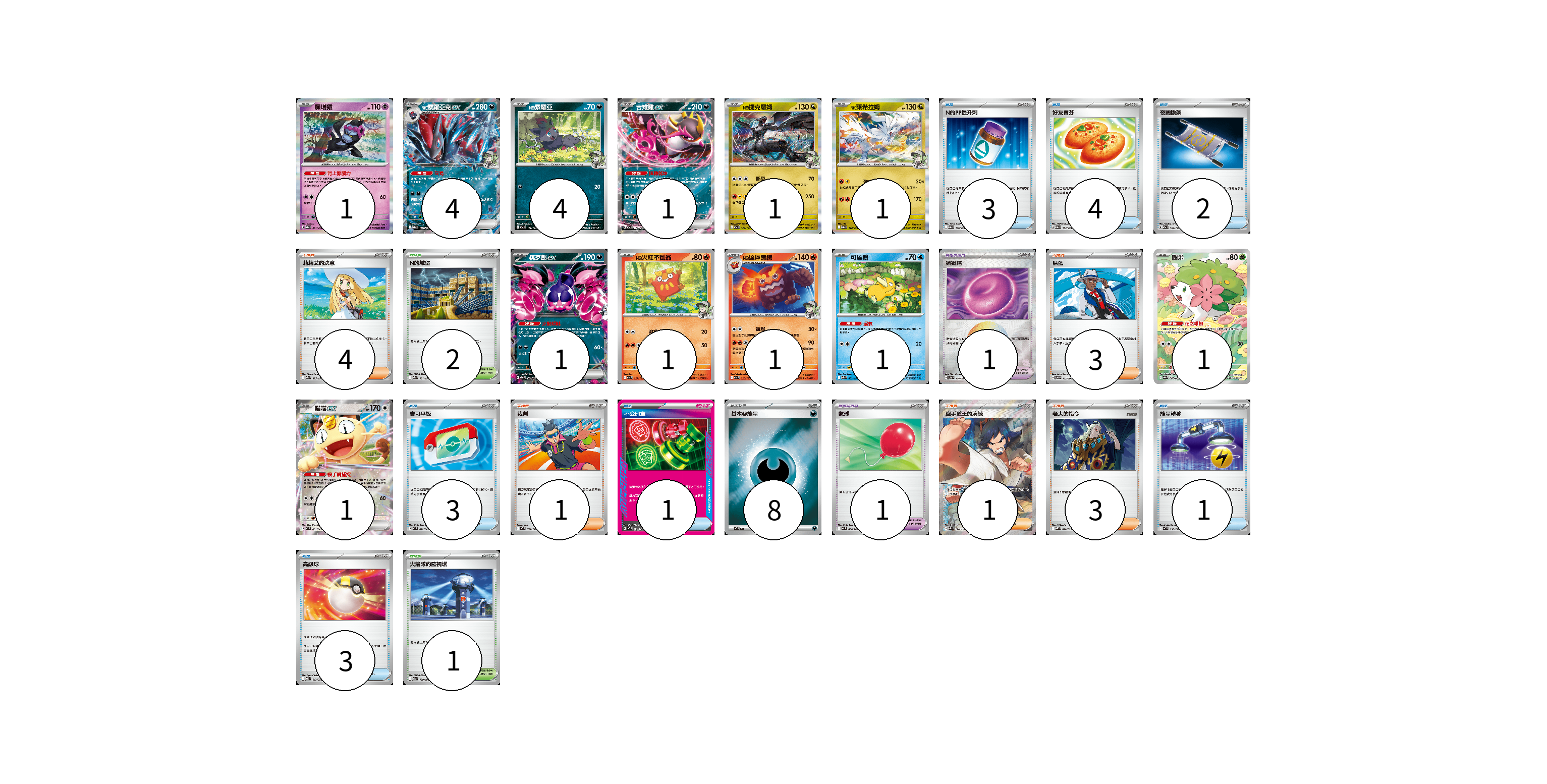 牌組構築方案 以此牌組為基礎新構築牌組 顯示卡面 顯示列表 寶可夢卡(18) 1 4 4 1 1 1 1 1 1 1 1 1 寶可夢道具(2) 1 1 物品卡(17) 3 4 2 3 1 1 3 支援者卡(12) 4 3 1 1 3 競技場卡(3) 2 1 能量卡(8) 8 寶可夢卡(18) 卡牌名稱 張數 卡牌名稱 張數 願增猿 M2a 081/193 01 N的索羅亞克ex M2a 112/193 04 N的索羅亞 M2a 111/193 04 吉雉雞ex M2a 114/193 01 N的捷克羅姆 M2a 129/193 01 N的萊希拉姆 M2a 128/193 01 桃歹郎ex MBG 009/022 01 N的火紅不倒翁 M2a 027/193 01 N的達摩狒狒 M2a 028/193 01 可達鴨 M2a 032/193 01 謝米 SV9a 066/063 01 喵喵ex M3 061/080 01 寶可夢道具(2) 卡牌名稱 張數 卡牌名稱 張數 鎖鏈糬 SV8a 154/187 01 氣球 MC 688/742 01 物品卡(17) 卡牌名稱 張數 卡牌名稱 張數 N的PP提升劑 M2a 146/193 03 好友寶芬 M2a 153/193 04 夜間擔架 M2a 159/193 02 寶可平板 M3 070/080 03 不公印章 MC 633/742 01 能量轉移 MC 638/742 01 高級球 MBG 012/022 03 支援者卡(12) 卡牌名稱 張數 卡牌名稱 張數 莉莉艾的決意 M2a 175/193 04 席藍 SV8 102/106 03 裁判 MC 711/742 01 空手道王的演練 M2a 220/193 01 老大的指令 MBD 020/022 03 競技場卡(3) 卡牌名稱 張數 卡牌名稱 張數 N的城堡 M2a 181/193 02 火箭隊的監視塔 M2a 189/193 01 能量卡(8) 卡牌名稱 張數 卡牌名稱 張數 基本【惡】能量 MC DAR 08 以此牌組為基礎新構築牌組 牌組編碼 nVhKDn-wXjdso-FzlPkG copy 列印牌組單 牌組編碼已複製 分享至SNS
