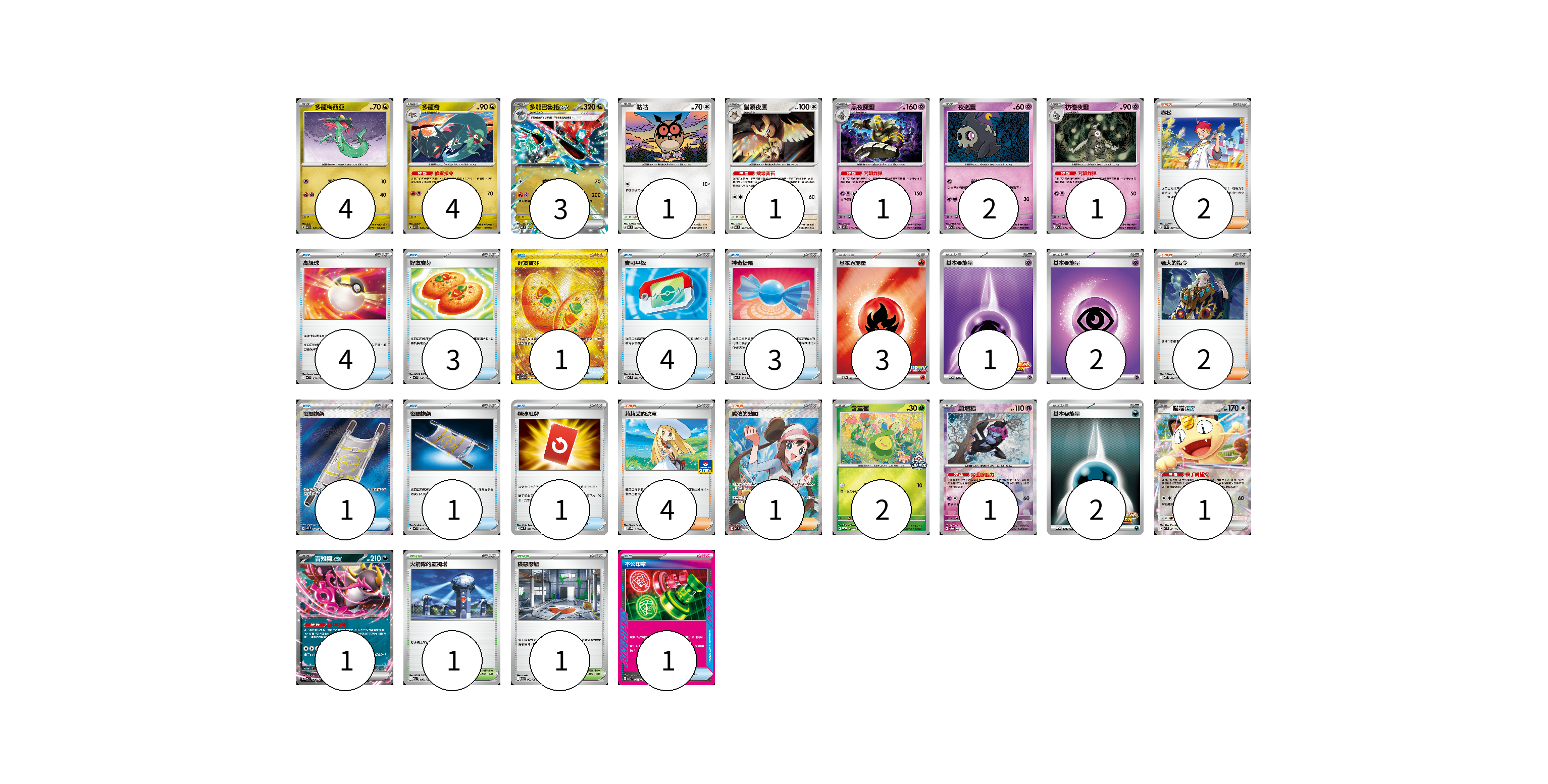 牌組構築方案 以此牌組為基礎新構築牌組 顯示卡面 顯示列表 寶可夢卡(22) 4 4 3 1 1 1 2 1 2 1 1 1 物品卡(19) 4 3 1 4 3 1 1 1 1 支援者卡(9) 2 2 4 1 競技場卡(2) 1 1 能量卡(8) 3 1 2 2 寶可夢卡(22) 卡牌名稱 張數 卡牌名稱 張數 多龍梅西亞 MC 546/742 04 多龍奇 MC 547/742 04 多龍巴魯托ex MC 548/742 03 咕咕 MC 572/742 01 貓頭夜鷹 MC 573/742 01 黑夜魔靈 MC 310/742 01 夜巡靈 M2a 072/193 02 彷徨夜靈 M2a 073/193 01 含羞苞 M-P 037/M-P 02 願增猿 SV8a 075/187 01 喵喵ex M3 061/080 01 吉雉雞ex MC 489/742 01 物品卡(19) 卡牌名稱 張數 卡牌名稱 張數 高級球 MC 651/742 04 好友寶芬 MC 648/742 03 好友寶芬 SV6 133/101 01 寶可平板 M3 070/080 04 神奇糖果 MC 655/742 03 夜間擔架 M1L 083/063 01 夜間擔架 MC 670/742 01 特殊紅牌 M4 072/083 01 不公印章 MBD 011/022 01 支援者卡(9) 卡牌名稱 張數 卡牌名稱 張數 赤松 SVK 027/042 02 老大的指令 MBD 020/022 02 莉莉艾的決意 M-P 018/M-P 04 鳴依的勉勵 M3 107/080 01 競技場卡(2) 卡牌名稱 張數 卡牌名稱 張數 火箭隊的監視塔 M2a 189/193 01 險惡廢墟 M1L 063/063 01 能量卡(8) 卡牌名稱 張數 卡牌名稱 張數 基本【火】能量 M-P 032/M-P 03 基本【超】能量 SV-P 261/SV-P 01 基本【超】能量 MC PSY 02 基本【惡】能量 SV-P 263/SV-P 02 以此牌組為基礎新構築牌組 牌組編碼 nWuApC-eLPsIg-luuuzO copy 列印牌組單 牌組編碼已複製 分享至SNS