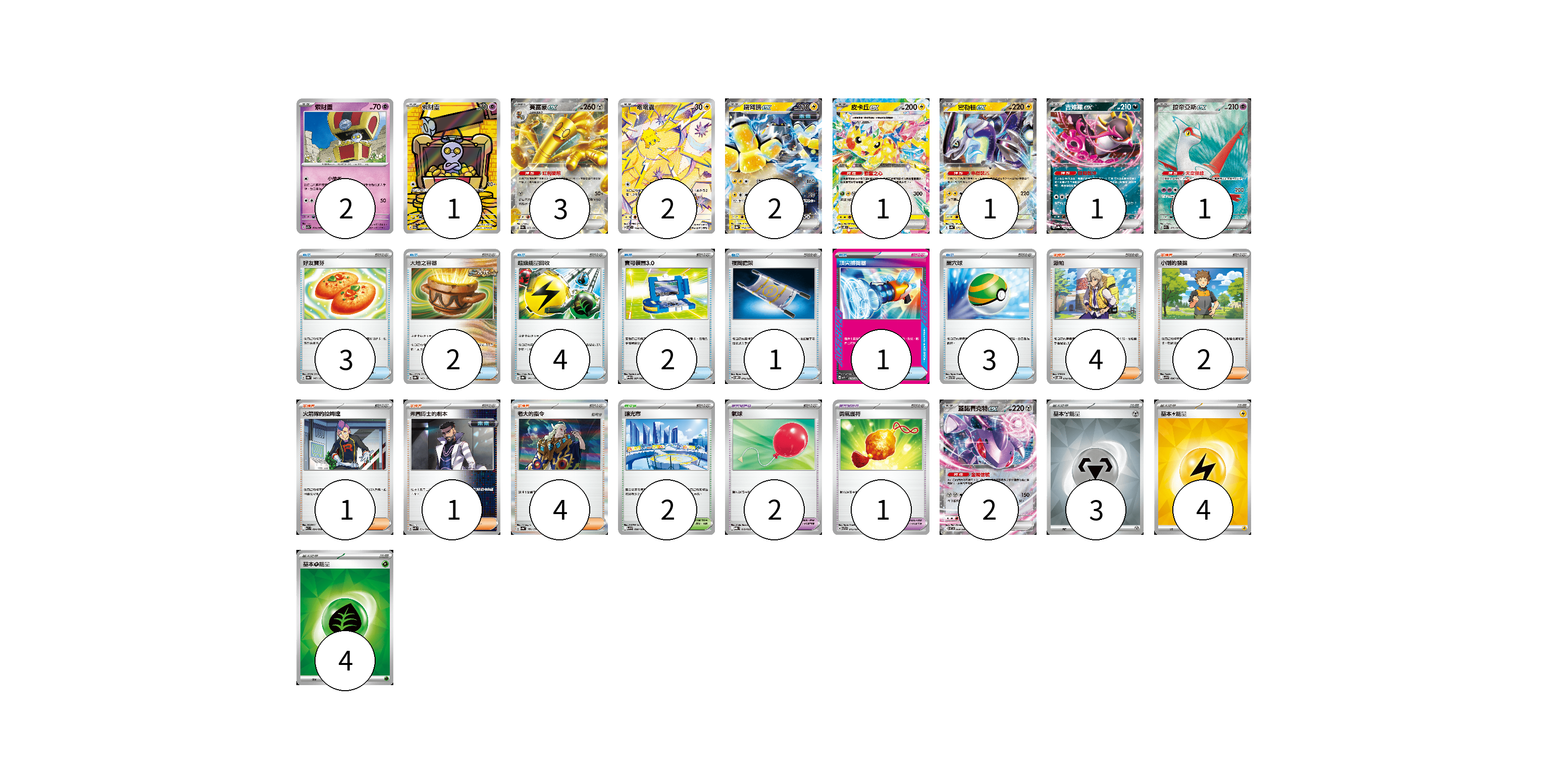 牌組構築方案 以此牌組為基礎新構築牌組 顯示卡面 顯示列表 寶可夢卡(16) 2 1 3 2 2 1 1 1 1 2 寶可夢道具(3) 2 1 物品卡(16) 3 2 4 2 1 1 3 支援者卡(12) 4 2 1 1 4 競技場卡(2) 2 能量卡(11) 3 4 4 寶可夢卡(16) 卡牌名稱 張數 卡牌名稱 張數 索財靈 SV7a 024/064 02 索財靈 SV3a 068/062 01 賽富豪ex SV3a 050/062 03 電電蟲 SV7 108/102 02 鐵臂膀ex SV8a 054/187 02 皮卡丘ex SV8 033/106 01 密勒頓ex SV4a 071/190 01 吉雉雞ex SV8a 104/187 01 拉帝亞斯ex SV7a 078/064 01 蓋諾賽克特ex SV11B 069/086 02 寶可夢道具(3) 卡牌名稱 張數 卡牌名稱 張數 氣球 MBG 019/022 02 勇氣護符 SVTR 015/021 01 物品卡(16) 卡牌名稱 張數 卡牌名稱 張數 好友寶芬 SV8a 147/187 03 大地之容器 SV8a 143/187 02 超級能量回收 SV8a 141/187 04 寶可裝置3.0 SV11B 081/086 02 夜間擔架 SVOM 016/021 01 頂尖捕捉器 MBG 014/022 01 巢穴球 SVTH 010/018 03 支援者卡(12) 卡牌名稱 張數 卡牌名稱 張數 派帕 SVOD 018/020 04 小剛的發掘 SV9 096/100 02 火箭隊的拉姆達 SV10 094/098 01 弗圖博士的劇本 SVK 034/042 01 老大的指令 SV4a 181/190 04 競技場卡(2) 卡牌名稱 張數 卡牌名稱 張數 釀光市 SV9 098/100 02 能量卡(11) 卡牌名稱 張數 卡牌名稱 張數 基本【鋼】能量 SVK MET 03 基本【雷】能量 SVK LIG 04 基本【草】能量 SVK GRA 04 以此牌組為基礎新構築牌組 牌組編碼 nYdsFy-ZvdIki-JWfwrc copy 列印牌組單 牌組編碼已複製 分享至SNS