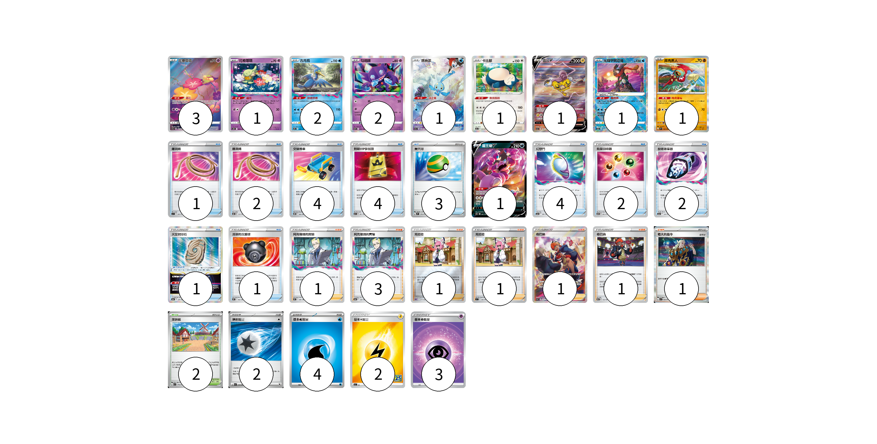牌組構築方案 以此牌組為基礎新構築牌組 顯示卡面 顯示列表 寶可夢卡(14) 3 1 2 2 1 1 1 1 1 1 寶可夢道具(1) 1 物品卡(23) 1 2 4 4 3 4 2 2 1 支援者卡(9) 1 3 1 1 1 1 1 競技場卡(2) 2 能量卡(11) 2 4 2 3 寶可夢卡(14) 卡牌名稱 張數 卡牌名稱 張數 花療環環 S12a 187/172 03 花療環環 S12a 064/172 01 古月鳥 S11 033/100 02 勾魂眼 S11 044/100 02 瑪納霏 S12a 178/172 01 卡比獸 S10a 058/071 01 雷公V S12a 218/172 01 光輝甲賀忍蛙 S12a 033/172 01 摔角鷹人 SV1S 045/078 01 龍王蠍V S11 066/100 01 寶可夢道具(1) 卡牌名稱 張數 卡牌名稱 張數 天空封印石 S12a 146/172 01 物品卡(23) 卡牌名稱 張數 卡牌名稱 張數 離洞繩 SI 364/414 01 離洞繩 S8b 130/184 02 交替推車 S10D 060/067 04 對戰VIP參加證 S8 091/100 04 巢穴球 SV1S 070/078 03 幻想門 S12a 141/172 04 能量回收器 S5R 062/070 02 放逐吸塵器 S12a 144/172 02 洗翠的沉重球 S10P 062/067 01 支援者卡(9) 卡牌名稱 張數 卡牌名稱 張數 阿克羅瑪的實驗 S11 095/100 01 阿克羅瑪的實驗 S12a 148/172 03 克拉拉 SPD 014/020 01 克拉拉 SI 392/414 01 奇巴納 S12a 237/172 01 奇巴納 S8b 150/184 01 老大的指令 SV1a 069/073 01 競技場卡(2) 卡牌名稱 張數 卡牌名稱 張數 深缽鎮 SV1a 070/073 02 能量卡(11) 卡牌名稱 張數 卡牌名稱 張數 噴射能量 SV1a 072/073 02 基本【水】能量 SVB WAT 04 基本雷能量 S8a LIG 02 基本【超】能量 SI PSY 03 以此牌組為基礎新構築牌組 牌組編碼 naCeMC-avfHoi-wujCwS copy 列印牌組單 牌組編碼已複製 分享至SNS