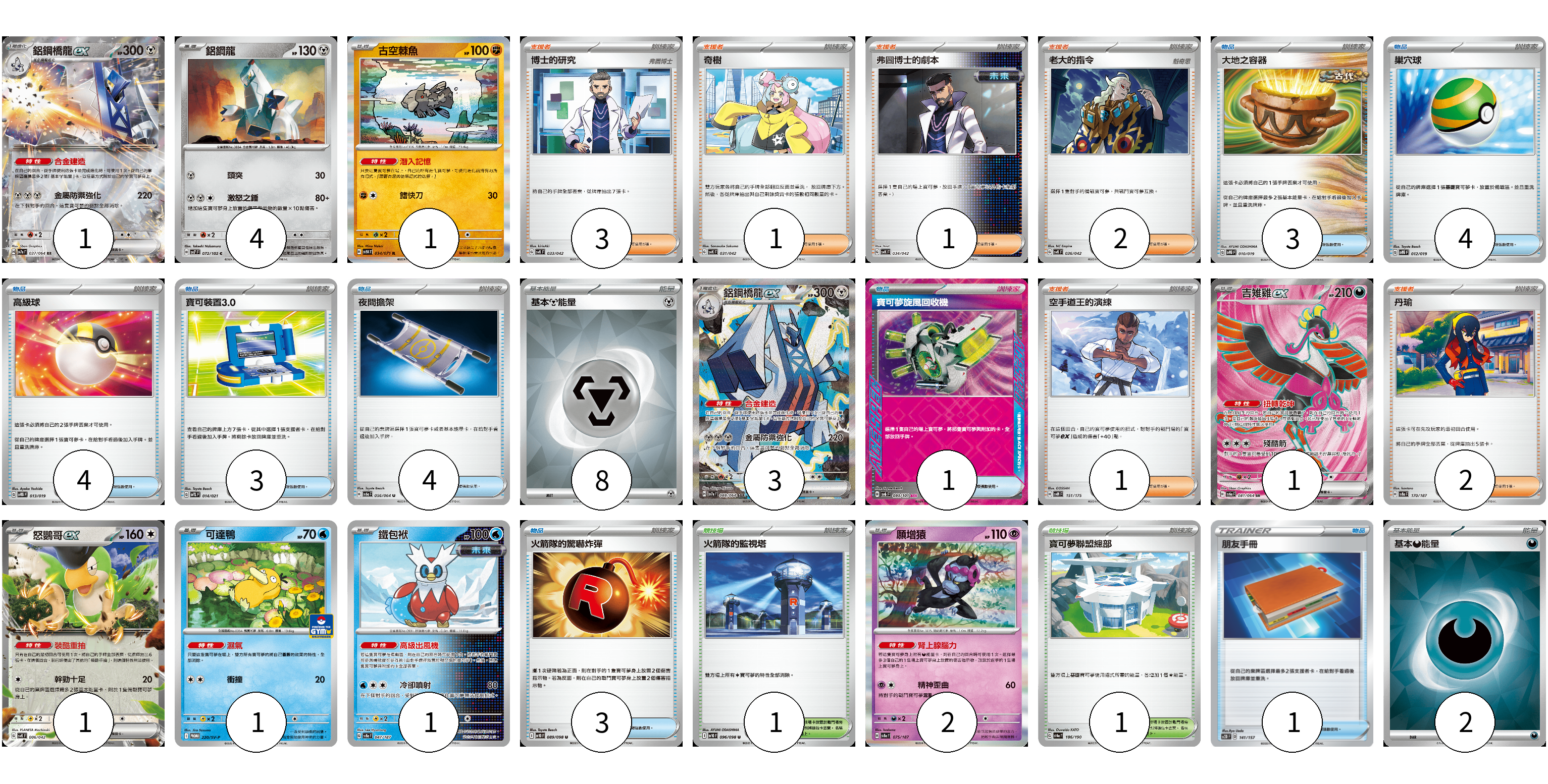 牌組構築方案 以此牌組為基礎新構築牌組 顯示卡面 顯示列表 寶可夢卡(15) 1 4 1 3 1 1 1 1 2 物品卡(23) 3 4 4 3 4 1 3 1 支援者卡(10) 3 1 1 2 1 2 競技場卡(2) 1 1 能量卡(10) 8 2 寶可夢卡(15) 卡牌名稱 張數 卡牌名稱 張數 鋁鋼橋龍ex SV7a 037/064 01 鋁鋼龍 SV7 072/102 04 古空棘魚 SV5K 034/071 01 鋁鋼橋龍ex SV7a 088/064 03 吉雉雞ex SV6a 081/064 01 怒鸚哥ex SVK 006/042 01 可達鴨 SV-P 220/SV-P 01 鐵包袱 SV8a 047/187 01 願增猿 SV8a 075/187 02 物品卡(23) 卡牌名稱 張數 卡牌名稱 張數 大地之容器 SVTG 010/019 03 巢穴球 SVTG 012/019 04 高級球 SVTG 013/019 04 寶可裝置3.0 SVTL 014/021 03 夜間擔架 SV6a 056/064 04 寶可夢旋風回收機 SV6 093/101 01 火箭隊的驚嚇炸彈 SV10 089/098 03 朋友手冊 SC2D 141/157 01 支援者卡(10) 卡牌名稱 張數 卡牌名稱 張數 博士的研究 SVK 033/042 03 奇樹 SVK 031/042 01 弗圖博士的劇本 SVK 034/042 01 老大的指令 SVK 036/042 02 空手道王的演練 SVM 151/175 01 丹瑜 SV8a 170/187 02 競技場卡(2) 卡牌名稱 張數 卡牌名稱 張數 火箭隊的監視塔 SV10 096/098 01 寶可夢聯盟總部 SV4a 186/190 01 能量卡(10) 卡牌名稱 張數 卡牌名稱 張數 基本【鋼】能量 SVK MET 08 基本【惡】能量 SVK DAR 02 以此牌組為基礎新構築牌組 牌組編碼 ncXALy-aIiXcI-cJQXok copy 列印牌組單 牌組編碼已複製 分享至SNS