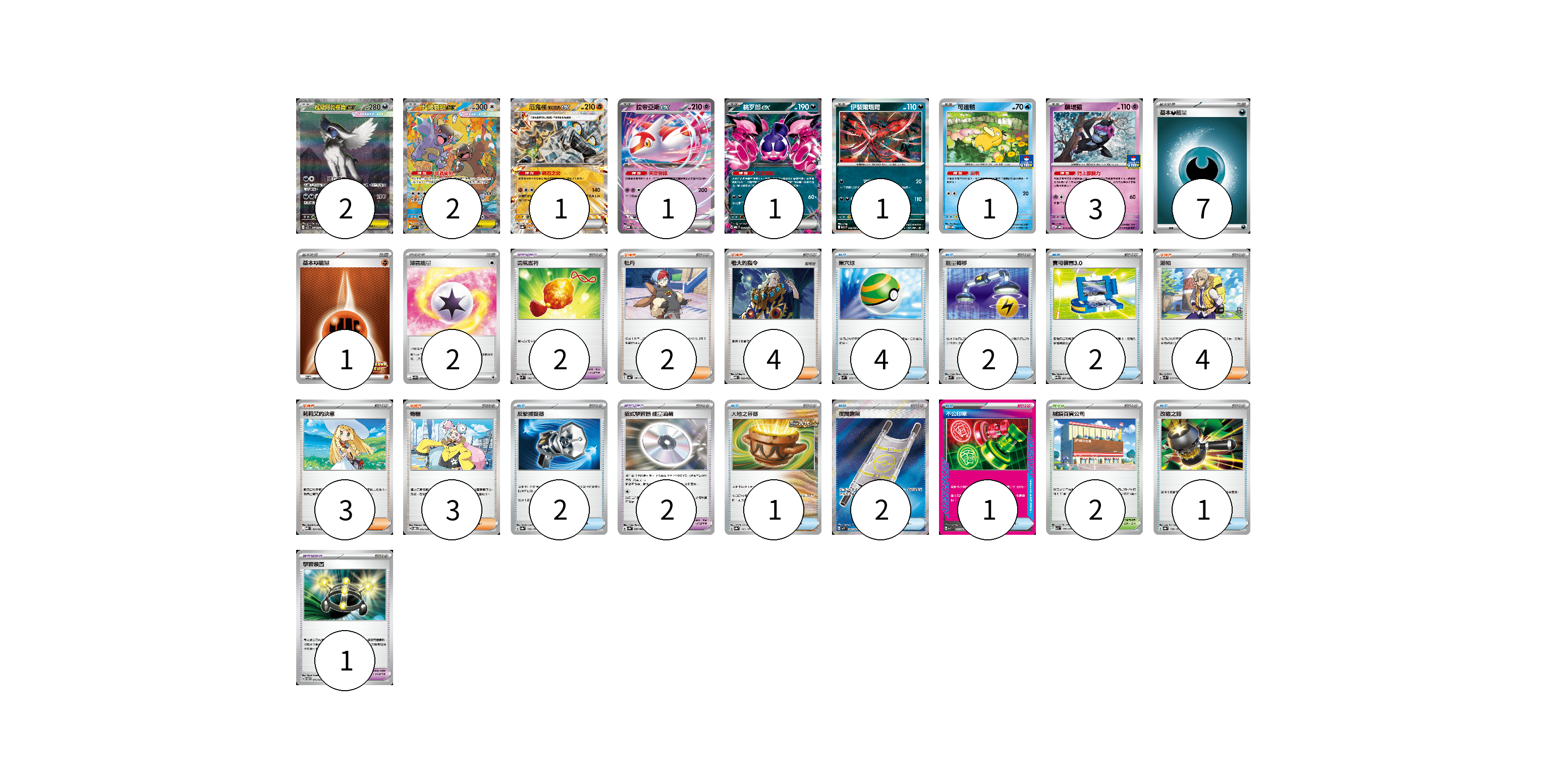 牌組構築方案 以此牌組為基礎新構築牌組 顯示卡面 顯示列表 寶可夢卡(12) 2 2 1 1 1 1 1 3 寶可夢道具(5) 2 2 1 物品卡(15) 4 2 2 2 1 2 1 1 支援者卡(16) 2 4 4 3 3 競技場卡(2) 2 能量卡(10) 7 1 2 寶可夢卡(12) 卡牌名稱 張數 卡牌名稱 張數 超級阿勃梭魯ex M1L 089/063 02 超級袋獸ex M1S 089/063 02 厄鬼椪 礎石面具ex SV8a 091/187 01 拉帝亞斯ex MBD 003/022 01 桃歹郎ex MBG 009/022 01 伊裴爾塔爾 M1L 040/063 01 可達鴨 SV-P 220/SV-P 01 願增猿 M-P 014/M-P 03 寶可夢道具(5) 卡牌名稱 張數 卡牌名稱 張數 勇氣護符 SVM 142/175 02 招式學習器 能量渦輪 SV3a 056/062 02 學習裝置 SVTM 016/022 01 物品卡(15) 卡牌名稱 張數 卡牌名稱 張數 巢穴球 SVM 133/175 04 能量轉移 SVM 127/175 02 寶可裝置3.0 SV11B 081/086 02 反擊捕捉器 SV8a 139/187 02 大地之容器 SV8a 143/187 01 夜間擔架 M1L 083/063 02 不公印章 MBD 011/022 01 改造之錘 SV8a 138/187 01 支援者卡(16) 卡牌名稱 張數 卡牌名稱 張數 牡丹 SV4a 182/190 02 老大的指令 MBD 020/022 04 派帕 SVK 035/042 04 莉莉艾的決意 MBD 021/022 03 奇樹 SVOD 016/020 03 競技場卡(2) 卡牌名稱 張數 卡牌名稱 張數 城鎮百貨公司 SV3 107/108 02 能量卡(10) 卡牌名稱 張數 卡牌名稱 張數 基本【惡】能量 MBG DAR 07 基本【鬥】能量 SV-P 262/SV-P 01 薄霧能量 SV5M 071/071 02 以此牌組為基礎新構築牌組 牌組編碼 necukj-vTRNSi-tAvIAl copy 列印牌組單 牌組編碼已複製 分享至SNS