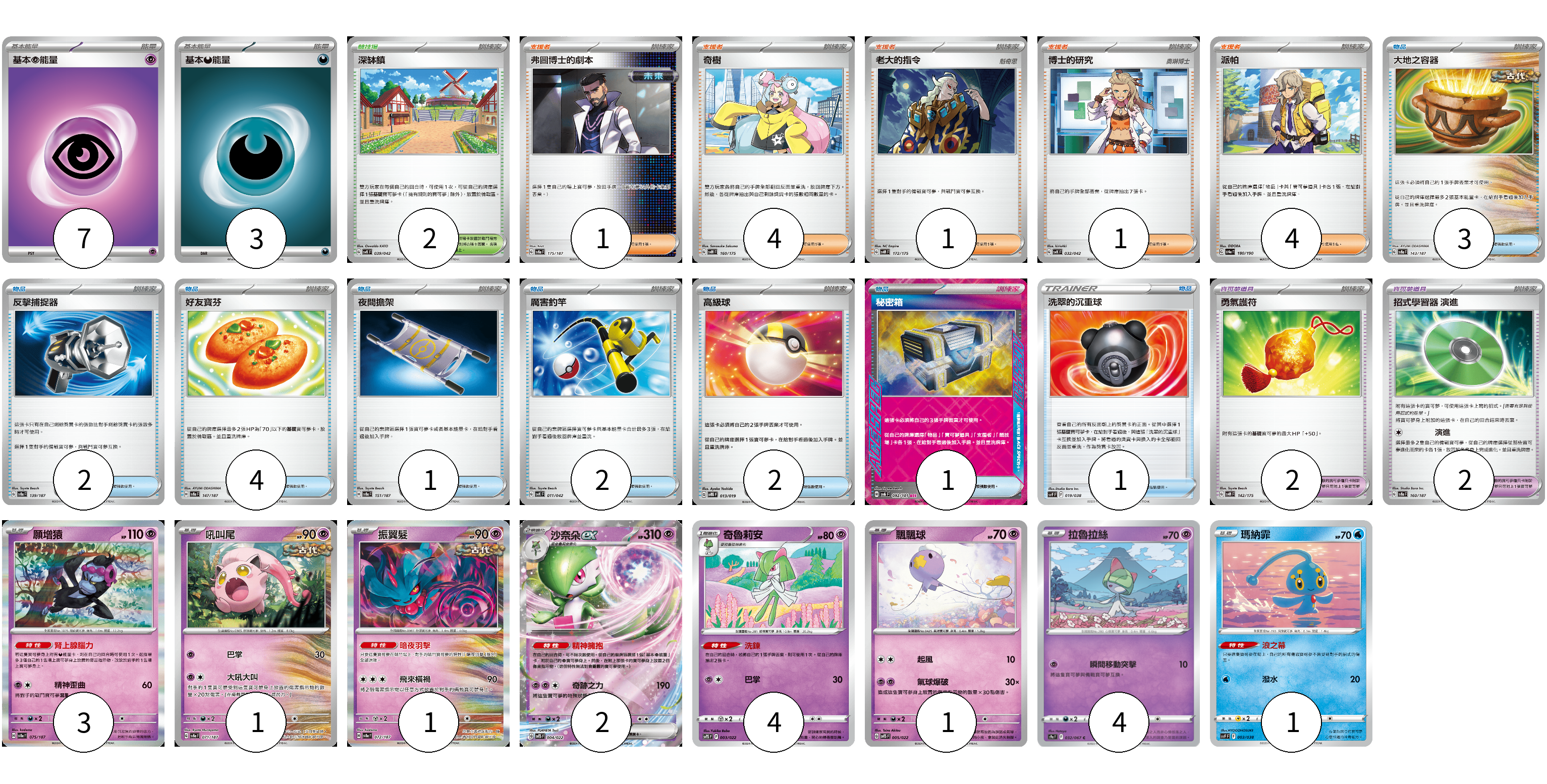 牌組構築方案 以此牌組為基礎新構築牌組 顯示卡面 顯示列表 寶可夢卡(17) 3 1 1 2 4 1 4 1 寶可夢道具(4) 2 2 物品卡(16) 3 2 4 1 2 2 1 1 支援者卡(11) 1 4 1 1 4 競技場卡(2) 2 能量卡(10) 7 3 寶可夢卡(17) 卡牌名稱 張數 卡牌名稱 張數 願增猿 SV8a 075/187 03 吼叫尾 SV8a 071/187 01 振翼髮 SV8a 072/187 01 沙奈朵ex SVTS 004/022 02 奇魯莉安 SVTS 003/022 04 飄飄球 SVTS 005/022 01 拉魯拉絲 S9a 032/067 04 瑪納霏 SVF 003/038 01 寶可夢道具(4) 卡牌名稱 張數 卡牌名稱 張數 勇氣護符 SVM 142/175 02 招式學習器 演進 SV8a 160/187 02 物品卡(16) 卡牌名稱 張數 卡牌名稱 張數 大地之容器 SV8a 143/187 03 反擊捕捉器 SV8a 139/187 02 好友寶芬 SV8a 147/187 04 夜間擔架 SV8a 151/187 01 厲害釣竿 SVK 011/042 02 高級球 SVTG 013/019 02 秘密箱 SV6 092/101 01 洗翠的沉重球 SVF 019/038 01 支援者卡(11) 卡牌名稱 張數 卡牌名稱 張數 弗圖博士的劇本 SV8a 175/187 01 奇樹 SVM 160/175 04 老大的指令 SVM 172/175 01 博士的研究 SVK 032/042 01 派帕 SV4a 180/190 04 競技場卡(2) 卡牌名稱 張數 卡牌名稱 張數 深缽鎮 SVK 039/042 02 能量卡(10) 卡牌名稱 張數 卡牌名稱 張數 基本【超】能量 SVD PSY 07 基本【惡】能量 SVD DAR 03 以此牌組為基礎新構築牌組 牌組編碼 nfHKlb-HrZdwR-adTuJV copy 列印牌組單 牌組編碼已複製 分享至SNS