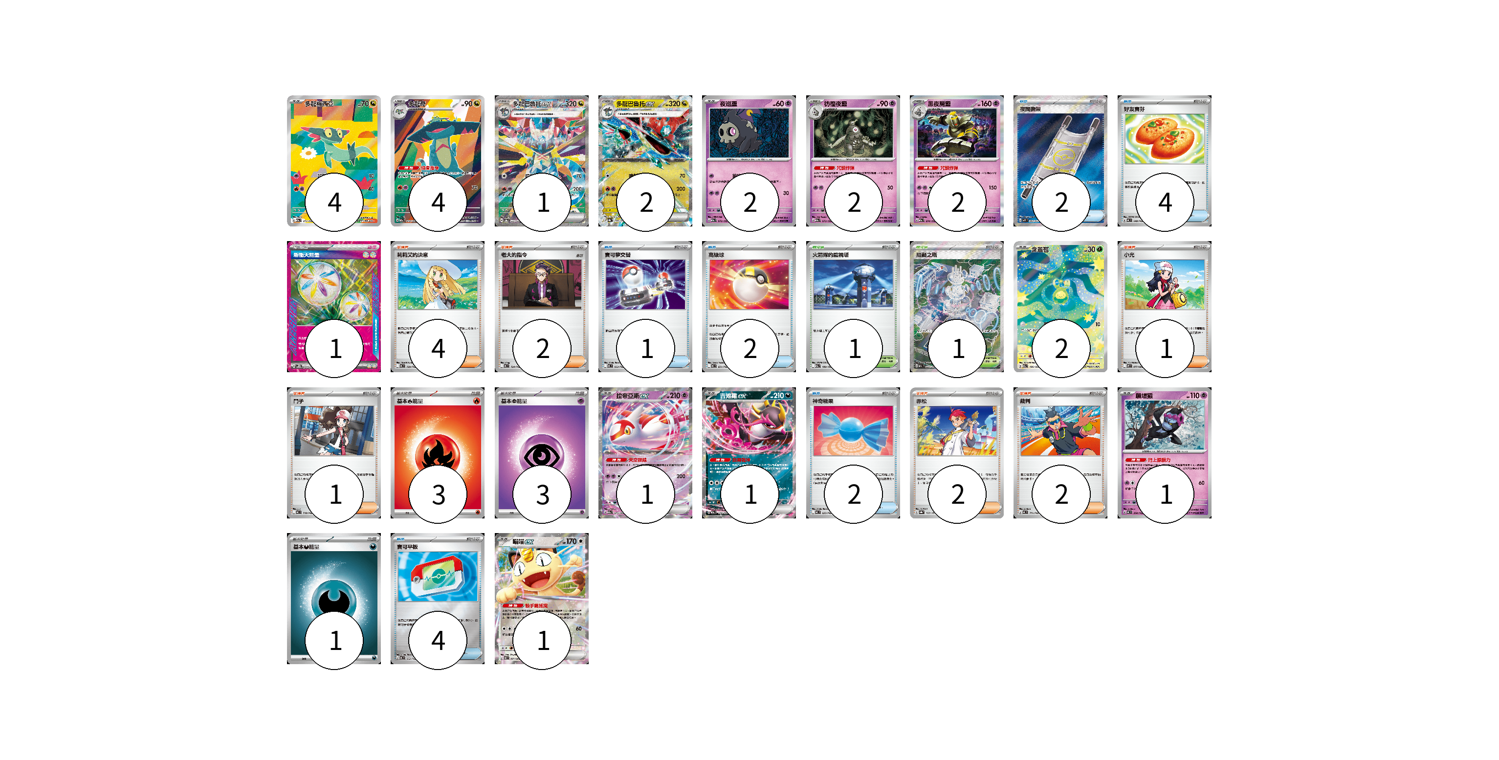 牌組構築方案 以此牌組為基礎新構築牌組 顯示卡面 顯示列表 寶可夢卡(23) 4 4 1 2 2 2 2 2 1 1 1 1 物品卡(15) 2 4 1 2 2 4 支援者卡(12) 4 2 1 1 2 2 競技場卡(2) 1 1 能量卡(8) 1 3 3 1 寶可夢卡(23) 卡牌名稱 張數 卡牌名稱 張數 多龍梅西亞 M2a 211/193 04 多龍奇 M2a 212/193 04 多龍巴魯托ex SV8a 221/187 01 多龍巴魯托ex SV8a 120/187 02 夜巡靈 M2a 072/193 02 彷徨夜靈 M2a 073/193 02 黑夜魔靈 M2a 074/193 02 含羞苞 M2a 196/193 02 拉帝亞斯ex M2a 075/193 01 吉雉雞ex M2a 114/193 01 願增猿 MC 358/742 01 喵喵ex M3 061/080 01 物品卡(15) 卡牌名稱 張數 卡牌名稱 張數 夜間擔架 M1L 083/063 02 好友寶芬 MC 648/742 04 寶可夢交替 MC 663/742 01 高級球 MC 651/742 02 神奇糖果 MC 655/742 02 寶可平板 MC 662/742 04 支援者卡(12) 卡牌名稱 張數 卡牌名稱 張數 莉莉艾的決意 MC 729/742 04 老大的指令 MC 724/742 02 小光 M2 077/080 01 鬥子 MC 718/742 01 赤松 SV8a 163/187 02 裁判 MC 711/742 02 競技場卡(2) 卡牌名稱 張數 卡牌名稱 張數 火箭隊的監視塔 M2a 189/193 01 阻礙之塔 M2a 222/193 01 能量卡(8) 卡牌名稱 張數 卡牌名稱 張數 新衝天能量 SV5K 071/071 01 基本【火】能量 MC FIR 03 基本【超】能量 MC PSY 03 基本【惡】能量 MC DAR 01 以此牌組為基礎新構築牌組 牌組編碼 ngynru-PnYFuq-dQibZv copy 列印牌組單 牌組編碼已複製 分享至SNS