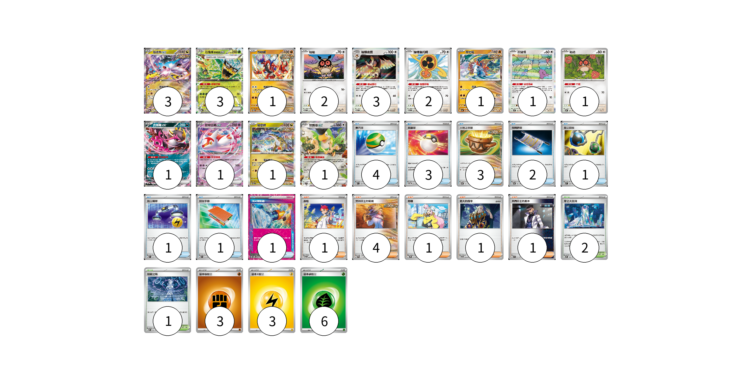 牌組構築方案 以此牌組為基礎新構築牌組 顯示卡面 顯示列表 寶可夢卡(21) 3 3 1 2 3 2 1 1 1 1 1 1 1 物品卡(16) 4 3 3 2 1 1 1 1 支援者卡(8) 1 4 1 1 1 競技場卡(3) 2 1 能量卡(12) 3 3 6 寶可夢卡(21) 卡牌名稱 張數 卡牌名稱 張數 猛雷鼓ex SV8a 124/187 03 厄鬼椪 碧草面具ex SV8a 020/187 03 故勒頓 SV8 069/106 01 咕咕 SV7 076/102 02 貓頭夜鷹 SV7 077/102 03 旋轉洛托姆 SV7 080/102 02 爬地翅 SV4K 041/066 01 百變怪 SV2a 132/165 01 咕咕 SV8a 127/187 01 吉雉雞ex SV8a 104/187 01 拉帝亞斯ex SV7a 019/064 01 猛雷鼓 SV7 075/102 01 怒鸚哥ex SV2P 065/071 01 物品卡(16) 卡牌名稱 張數 卡牌名稱 張數 巢穴球 SVM 133/175 04 高級球 SVOM 013/021 03 大地之容器 SV8a 143/187 03 夜間擔架 SV8a 151/187 02 能量回收 SVM 125/175 01 能量轉移 SVM 127/175 01 朋友手冊 SVK 014/042 01 頂尖捕捉器 SV5M 062/071 01 支援者卡(8) 卡牌名稱 張數 卡牌名稱 張數 赤松 SV7 097/102 01 奧琳博士的氣魄 SVHK 017/022 04 奇樹 SVHK 019/022 01 老大的指令 SVTR 019/021 01 弗圖博士的劇本 SVK 034/042 01 競技場卡(3) 卡牌名稱 張數 卡牌名稱 張數 零之大空洞 SV8a 182/187 02 阻礙之塔 SV8a 181/187 01 能量卡(12) 卡牌名稱 張數 卡牌名稱 張數 基本【鬥】能量 SVTG FIG 03 基本【雷】能量 SVTR LIG 03 基本【草】能量 SVTM GRA 06 以此牌組為基礎新構築牌組 牌組編碼 nicqnT-JZgLOz-dJKmHH copy 列印牌組單 牌組編碼已複製 分享至SNS