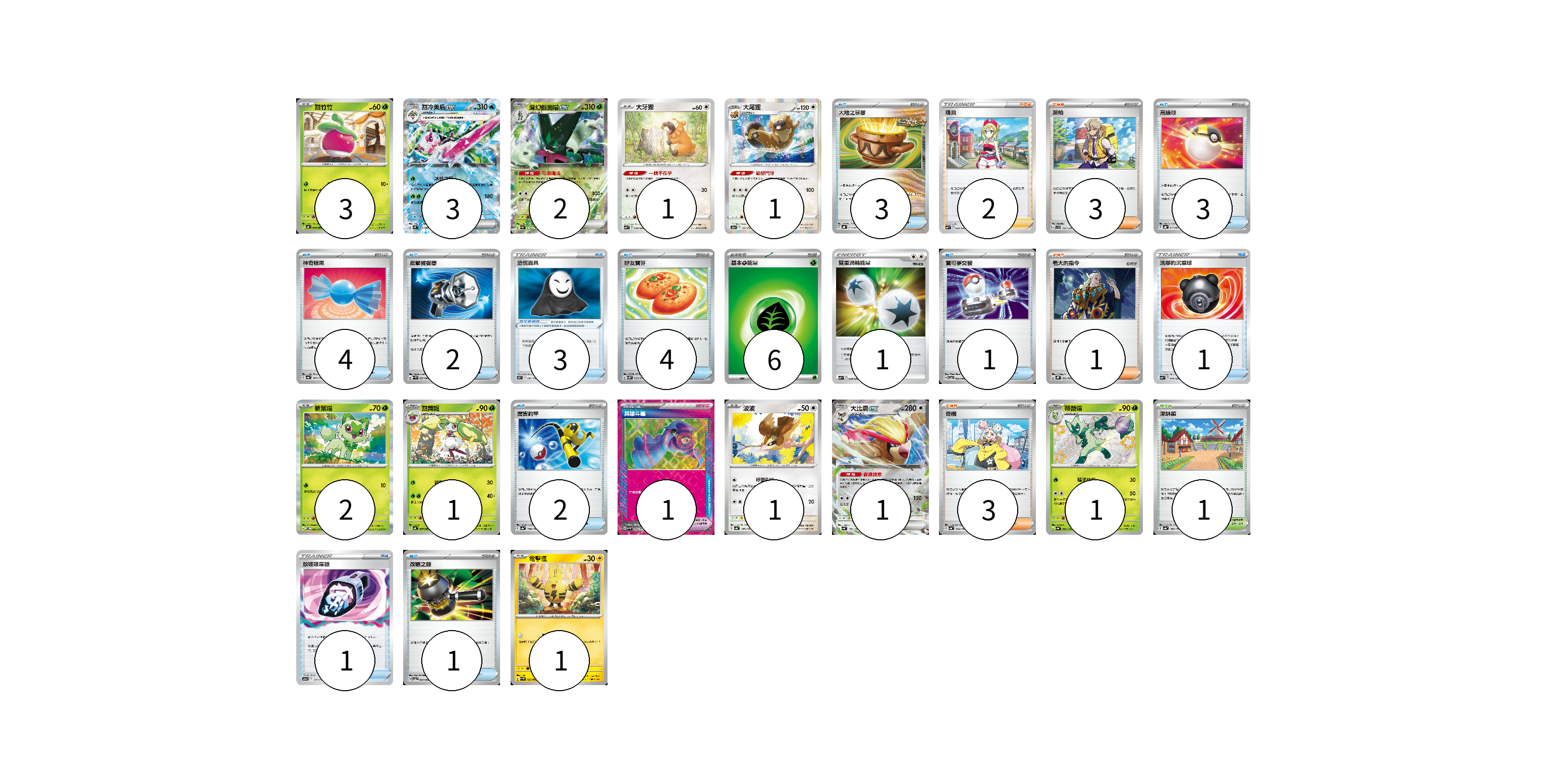 牌組構築方案 以此牌組為基礎新構築牌組 顯示卡面 顯示列表 寶可夢卡(17) 3 3 2 1 1 2 1 1 1 1 1 寶可夢道具(4) 3 1 物品卡(22) 3 3 4 2 4 1 1 2 1 1 支援者卡(9) 2 3 1 3 競技場卡(1) 1 能量卡(7) 6 1 寶可夢卡(17) 卡牌名稱 張數 卡牌名稱 張數 甜竹竹 SV4K 006/066 03 甜冷美后ex SV4K 020/066 03 魔幻假面喵ex SV4a 014/190 02 大牙狸 SVF 008/038 01 大尾狸 S12a 122/172 01 新葉喵 SV-P 002/SV-P 02 甜舞妮 SV4K 007/066 01 波波 SV4a 137/190 01 大比鳥ex SV4a 139/190 01 蒂蕾喵 SV4a 202/190 01 電擊怪 SV4M 022/066 01 寶可夢道具(4) 卡牌名稱 張數 卡牌名稱 張數 恐慌面具 S11 094/100 03 英雄斗篷 SV5M 064/071 01 物品卡(22) 卡牌名稱 張數 卡牌名稱 張數 大地之容器 SVHK 011/022 03 高級球 SVHK 013/022 03 神奇糖果 SV4a 163/190 04 反擊捕捉器 SV4M 059/066 02 好友寶芬 SV5K 063/071 04 寶可夢交替 SV5a 056/066 01 洗翠的沉重球 SVF 019/038 01 厲害釣竿 SV4a 158/190 02 放逐吸塵器 S12a 144/172 01 改造之錘 SV5a 054/066 01 支援者卡(9) 卡牌名稱 張數 卡牌名稱 張數 珠貝 SVF 025/038 02 派帕 SVD 137/139 03 老大的指令 SVHK 022/022 01 奇樹 SV4a 174/190 03 競技場卡(1) 卡牌名稱 張數 卡牌名稱 張數 深缽鎮 SV4a 185/190 01 能量卡(7) 卡牌名稱 張數 卡牌名稱 張數 基本【草】能量 SVF GRA 06 雙重渦輪能量 SVF 038/038 01 以此牌組為基礎新構築牌組 牌組編碼 njqCQA-gxOelh-yZoHiI copy 列印牌組單 牌組編碼已複製 分享至SNS