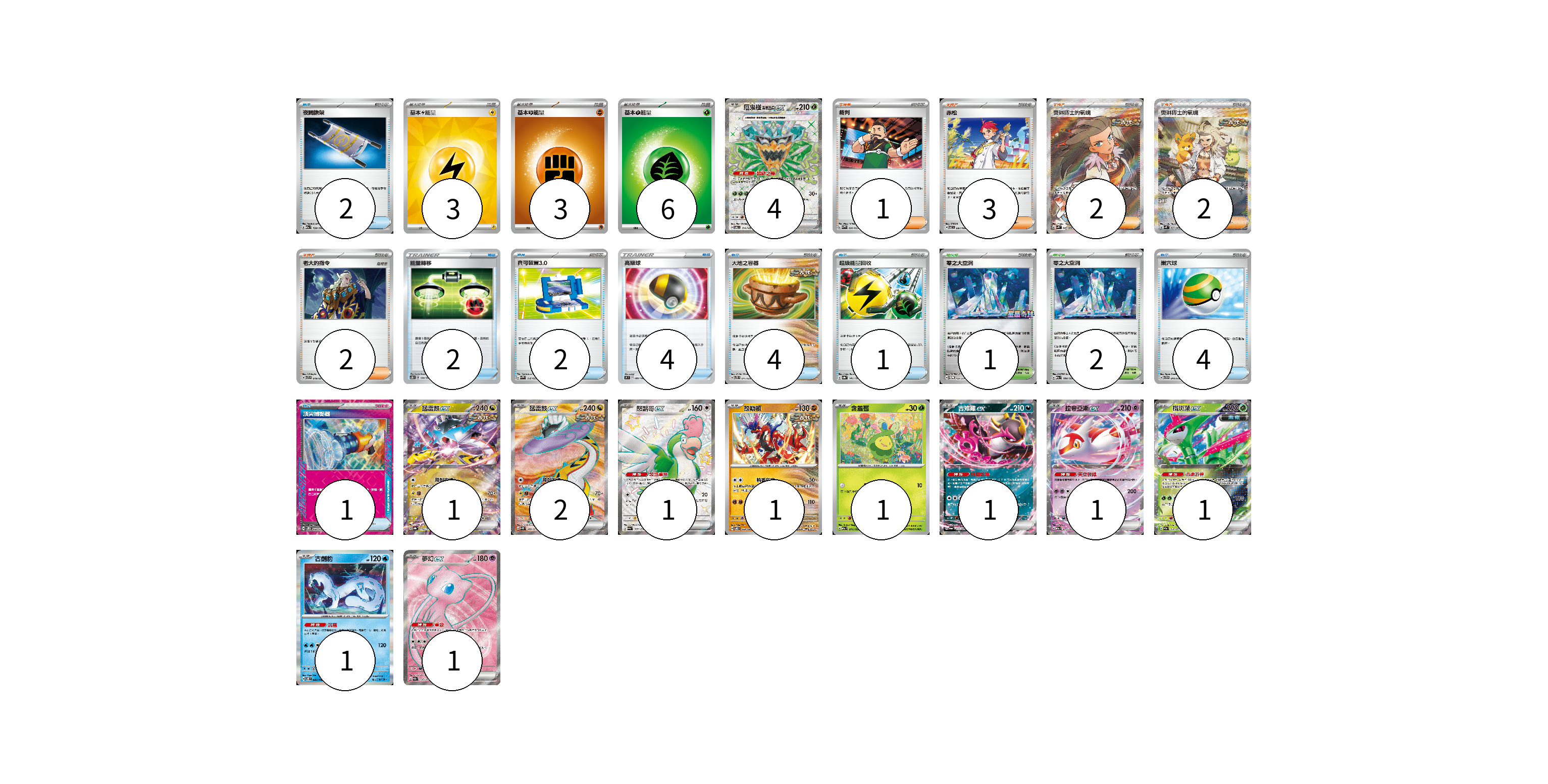 牌組構築方案 以此牌組為基礎新構築牌組 顯示卡面 顯示列表 寶可夢卡(15) 4 1 2 1 1 1 1 1 1 1 1 物品卡(20) 2 2 2 4 4 1 4 1 支援者卡(10) 1 3 2 2 2 競技場卡(3) 1 2 能量卡(12) 3 3 6 寶可夢卡(15) 卡牌名稱 張數 卡牌名稱 張數 厄鬼椪 碧草面具ex SV6 114/101 04 猛雷鼓ex SV8a 124/187 01 猛雷鼓ex SV5K 089/071 02 怒鸚哥ex SV4a 337/190 01 故勒頓 SV8 069/106 01 含羞苞 M2a 011/193 01 吉雉雞ex SV6a 038/064 01 拉帝亞斯ex M2a 075/193 01 鐵斑葉ex SV5M 016/071 01 古劍豹 SV8 032/106 01 夢幻ex SV2a 195/165 01 物品卡(20) 卡牌名稱 張數 卡牌名稱 張數 夜間擔架 M2a 159/193 02 能量轉移 SC2D 134/157 02 寶可裝置3.0 SVAW 016/023 02 高級球 S9 089/100 04 大地之容器 SVTS 011/022 04 超級能量回收 SV8a 141/187 01 巢穴球 SVTH 010/018 04 頂尖捕捉器 SV5M 062/071 01 支援者卡(10) 卡牌名稱 張數 卡牌名稱 張數 裁判 SVAW 020/023 01 赤松 SV7 097/102 03 奧琳博士的氣魄 SV4K 085/066 02 奧琳博士的氣魄 SV4K 091/066 02 老大的指令 SVTR 019/021 02 競技場卡(3) 卡牌名稱 張數 卡牌名稱 張數 零之大空洞 SV-P 151/SV-P 01 零之大空洞 M2a 184/193 02 能量卡(12) 卡牌名稱 張數 卡牌名稱 張數 基本【雷】能量 SVQP LIG 03 基本【鬥】能量 M-P FIG 03 基本【草】能量 M-P GRA 06 以此牌組為基礎新構築牌組 牌組編碼 nkLMTL-NQQAFi-Mhozew copy 列印牌組單 牌組編碼已複製 分享至SNS