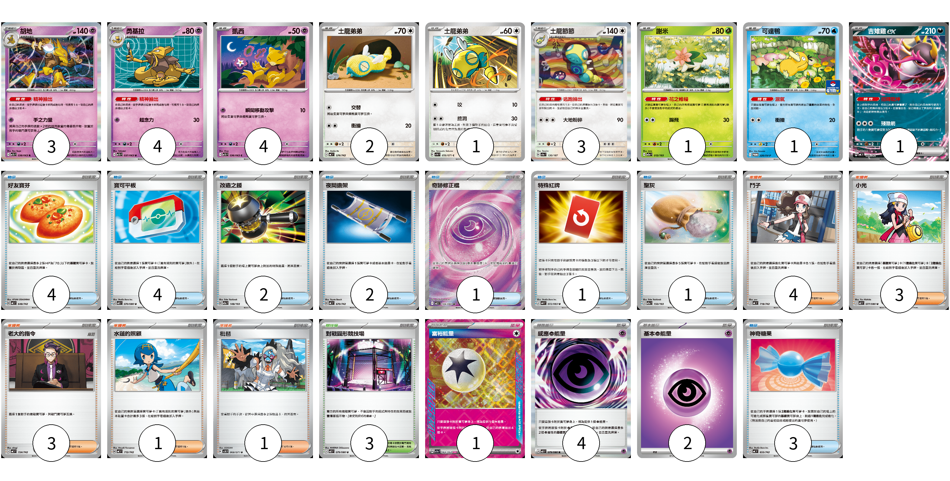 牌組構築方案 以此牌組為基礎新構築牌組 顯示卡面 顯示列表 寶可夢卡(20) 3 4 4 2 1 3 1 1 1 物品卡(18) 4 4 2 2 1 1 1 3 支援者卡(12) 4 3 3 1 1 競技場卡(3) 3 能量卡(7) 1 4 2 寶可夢卡(20) 卡牌名稱 張數 卡牌名稱 張數 胡地 M1S 038/063 03 勇基拉 M1S 037/063 04 凱西 M1S 036/063 04 土龍弟弟 MC 574/742 02 土龍弟弟 SV5K 056/071 01 土龍節節 SV8a 130/187 03 謝米 M2a 012/193 01 可達鴨 SV-P 220/SV-P 01 吉雉雞ex MC 489/742 01 物品卡(18) 卡牌名稱 張數 卡牌名稱 張數 好友寶芬 MC 648/742 04 寶可平板 M3 070/080 04 改造之錘 M2a 148/193 02 夜間擔架 MC 670/742 02 奇跡修正檔 M3 104/080 01 特殊紅牌 M4 072/083 01 聖灰 M2a 150/193 01 神奇糖果 MC 655/742 03 支援者卡(12) 卡牌名稱 張數 卡牌名稱 張數 鬥子 MC 718/742 04 小光 M2 077/080 03 老大的指令 MC 724/742 03 水蓮的照顧 MC 712/742 01 枇琶 SV5K 068/071 01 競技場卡(3) 卡牌名稱 張數 卡牌名稱 張數 對戰圓形競技場 M2 079/080 03 能量卡(7) 卡牌名稱 張數 卡牌名稱 張數 富裕能量 SV7a 064/064 01 感應【超】能量 M3 079/080 04 基本【超】能量 M-P PSY 02 以此牌組為基礎新構築牌組 牌組編碼 nncvsy-QaYzEd-wAEoNN copy 列印牌組單 牌組編碼已複製 分享至SNS