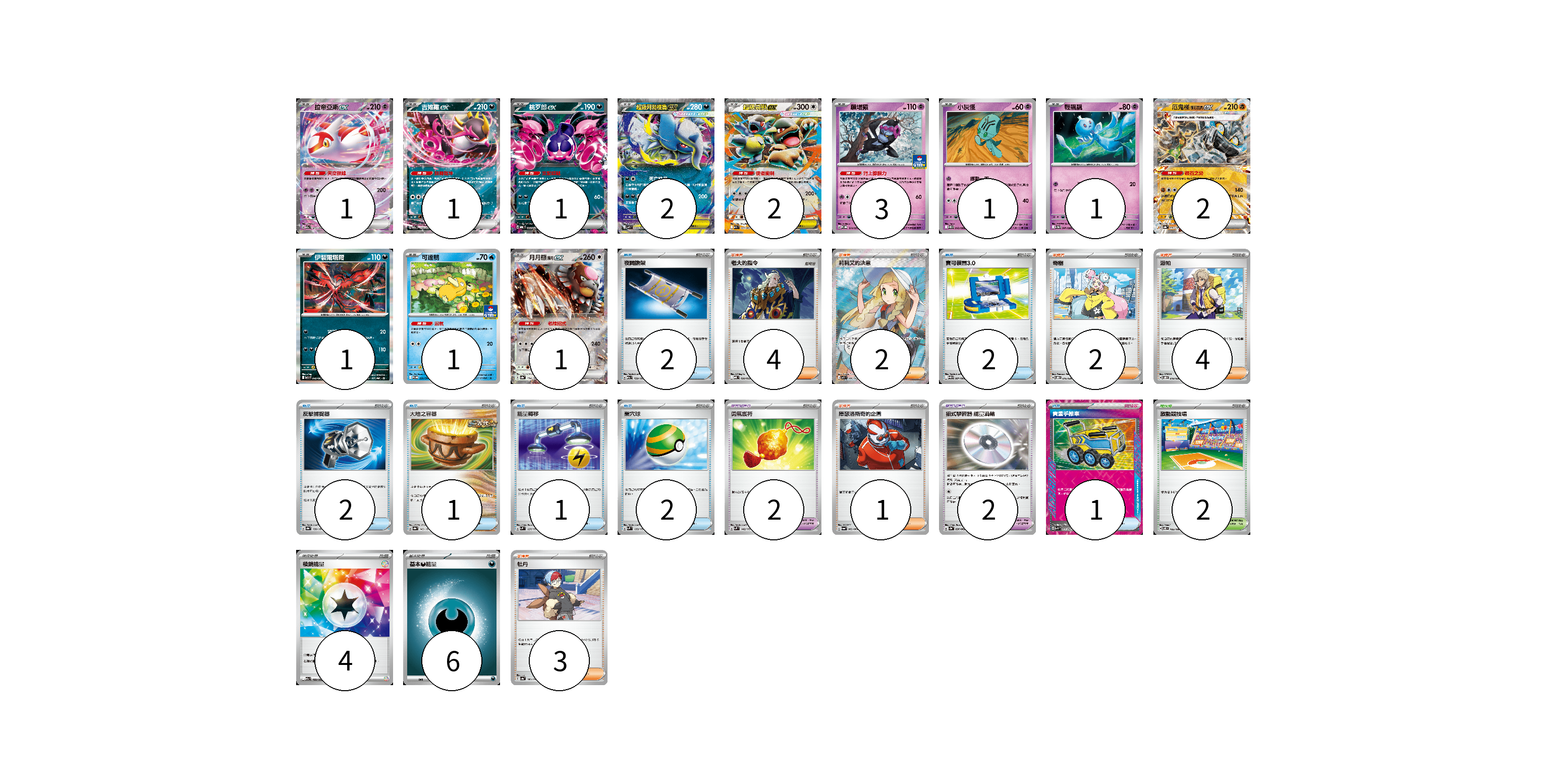 牌組構築方案 以此牌組為基礎新構築牌組 顯示卡面 顯示列表 寶可夢卡(17) 1 1 1 2 2 3 1 1 2 1 1 1 寶可夢道具(4) 2 2 物品卡(11) 2 2 2 1 1 2 1 支援者卡(16) 4 2 2 4 1 3 競技場卡(2) 2 能量卡(10) 4 6 寶可夢卡(17) 卡牌名稱 張數 卡牌名稱 張數 拉帝亞斯ex M2a 075/193 01 吉雉雞ex M2a 114/193 01 桃歹郎ex MBG 009/022 01 超級阿勃梭魯ex M1L 038/063 02 超級袋獸ex M1S 051/063 02 願增猿 M-P 014/M-P 03 小灰怪 SV11B 043/086 01 輕飄飄 SV11W 041/086 01 厄鬼椪 礎石面具ex SV8a 091/187 02 伊裴爾塔爾 M1L 040/063 01 可達鴨 SV-P 220/SV-P 01 月月熊 赫月ex SV8a 134/187 01 寶可夢道具(4) 卡牌名稱 張數 卡牌名稱 張數 勇氣護符 SVM 142/175 02 招式學習器 能量渦輪 SV3a 056/062 02 物品卡(11) 卡牌名稱 張數 卡牌名稱 張數 夜間擔架 M2a 159/193 02 寶可裝置3.0 SV11B 081/086 02 反擊捕捉器 SV8a 139/187 02 大地之容器 SV8a 143/187 01 能量轉移 SVM 127/175 01 巢穴球 SVM 133/175 02 貴重手推車 SVK 020/042 01 支援者卡(16) 卡牌名稱 張數 卡牌名稱 張數 老大的指令 MBD 020/022 04 莉莉艾的決意 M1L 086/063 02 奇樹 SVOD 016/020 02 派帕 SVOD 018/020 04 庫瑟洛斯奇的企圖 SV6a 062/064 01 牡丹 SV4a 182/190 03 競技場卡(2) 卡牌名稱 張數 卡牌名稱 張數 激動競技場 SV8 105/106 02 能量卡(10) 卡牌名稱 張數 卡牌名稱 張數 稜鏡能量 M2a 192/193 04 基本【惡】能量 M-P DAR 06 以此牌組為基礎新構築牌組 牌組編碼 nqVdVY-IMwrpA-wBRAnE copy 列印牌組單 牌組編碼已複製 分享至SNS
